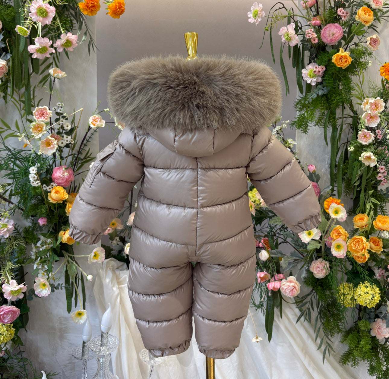 Signature Unisex winter Snowsuit with Synthetic fur trim in Cappuccino.