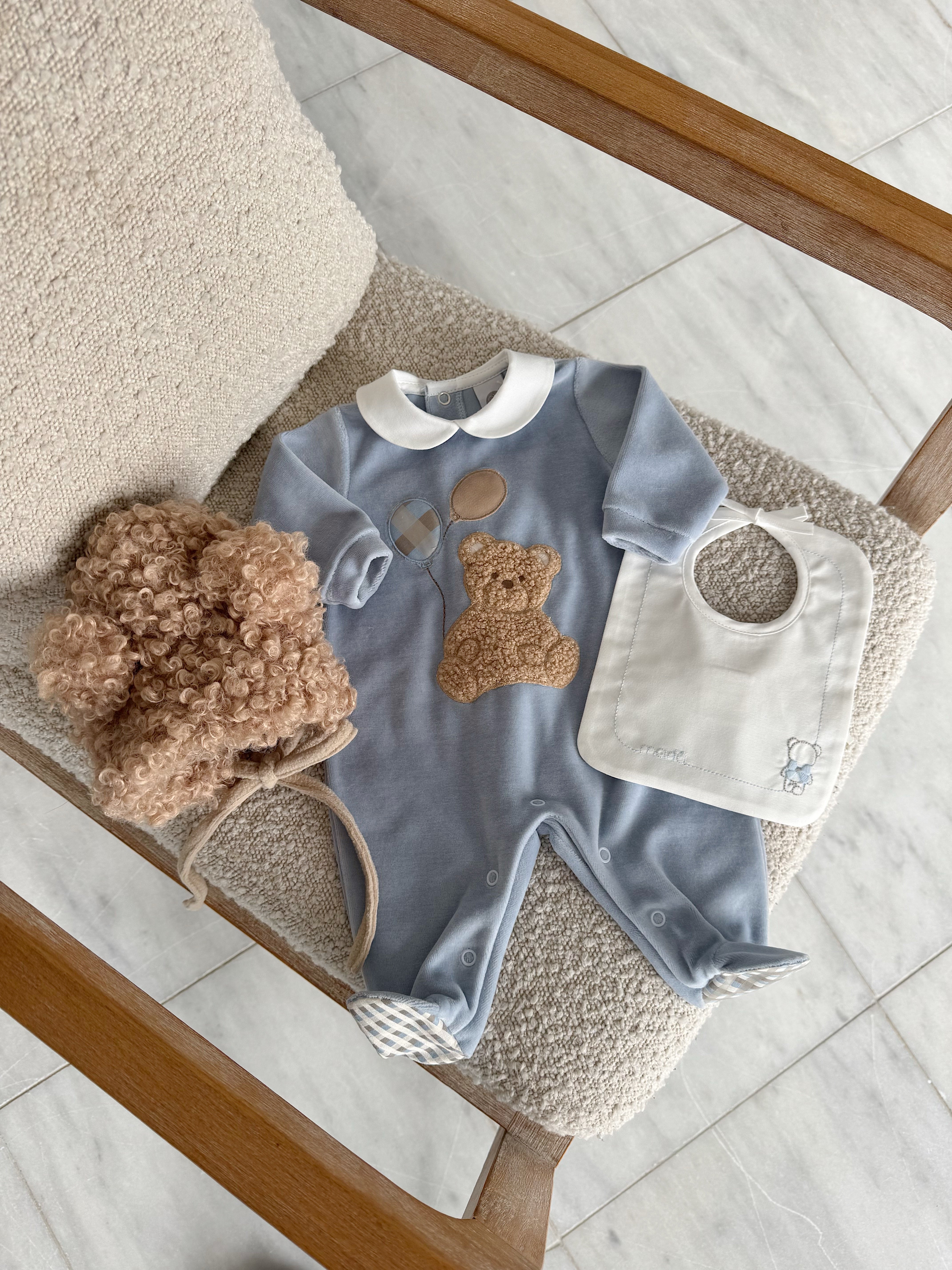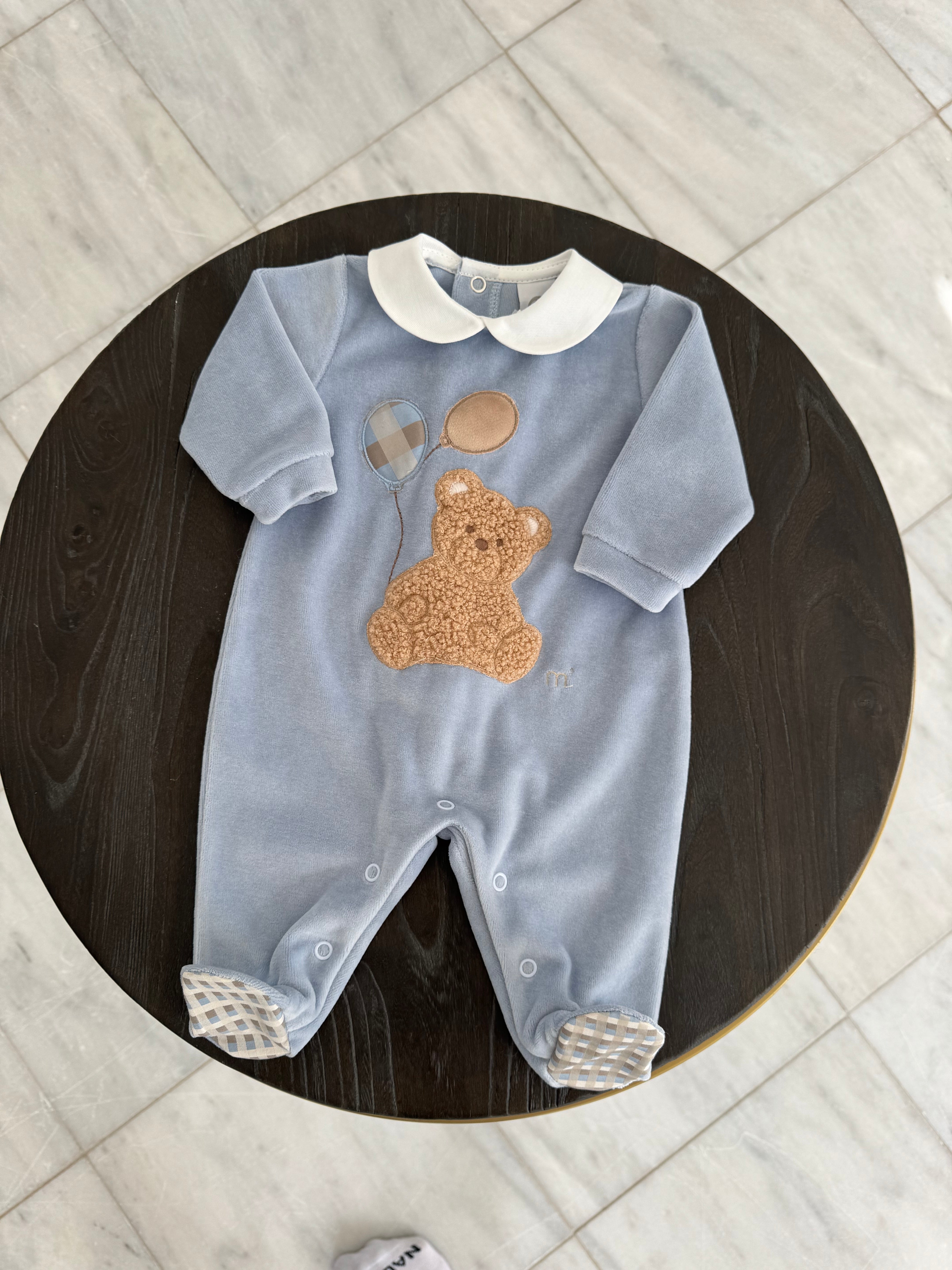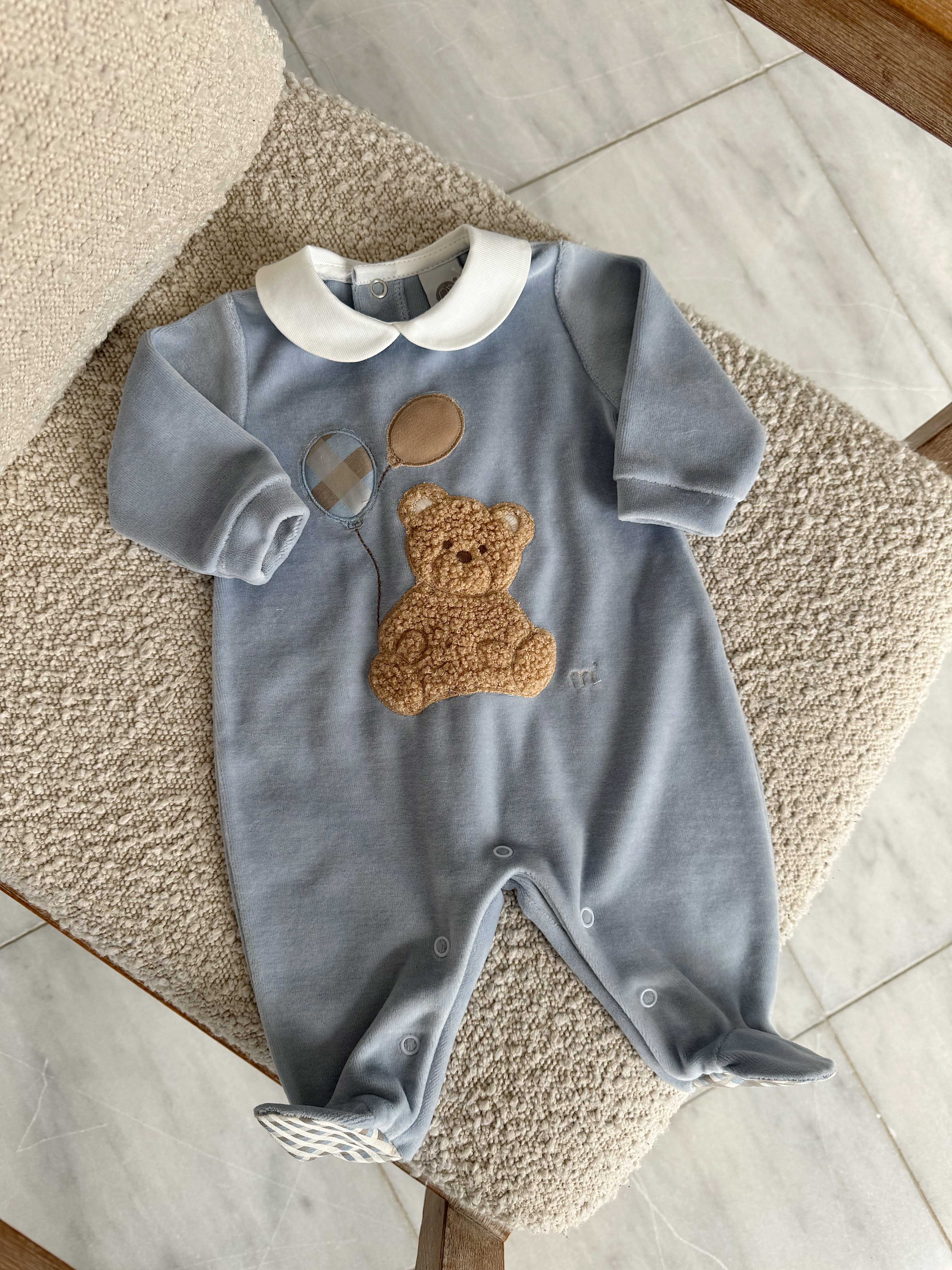 Beautiful Blue Velure Baby grow with Bear details.