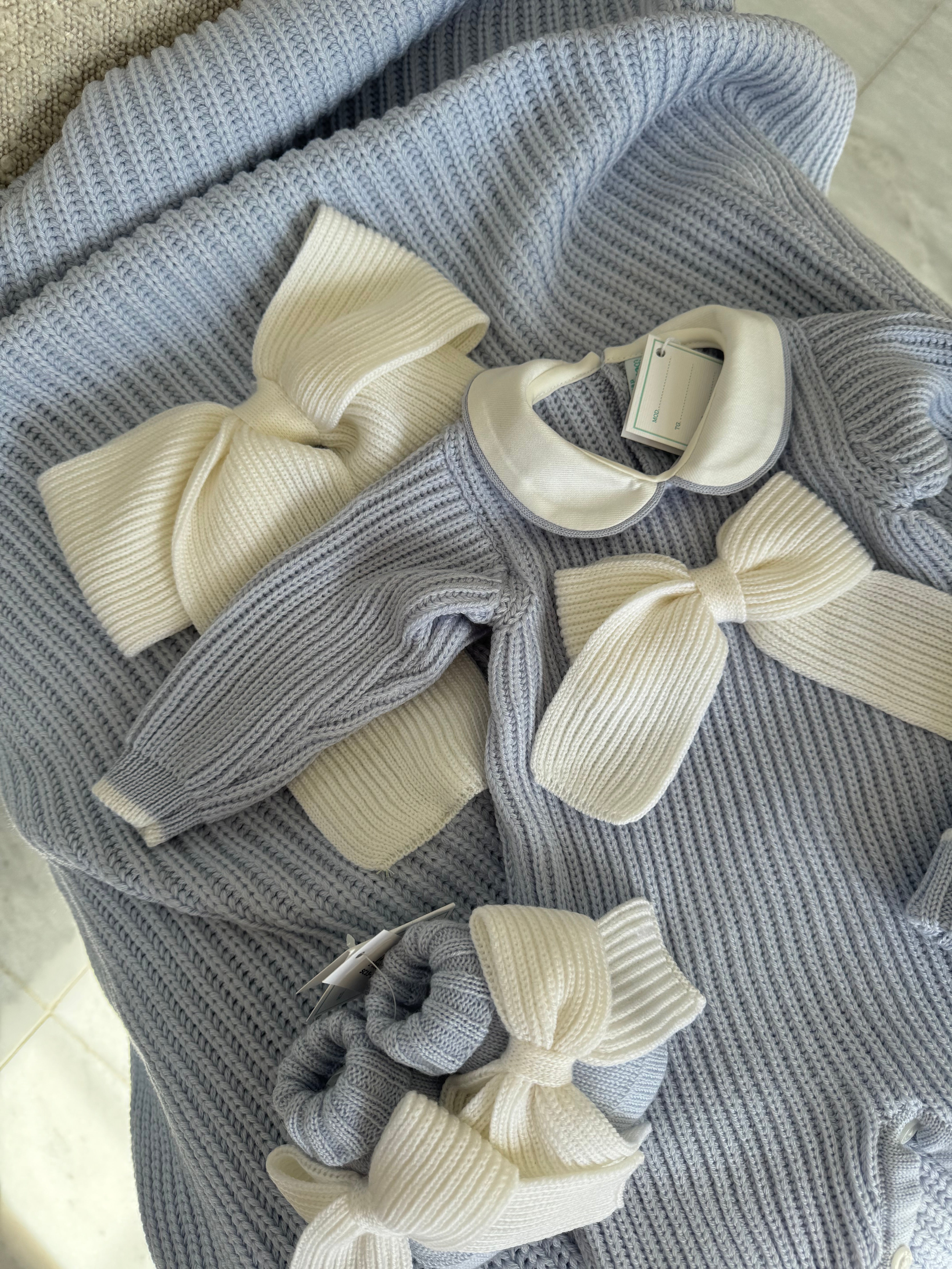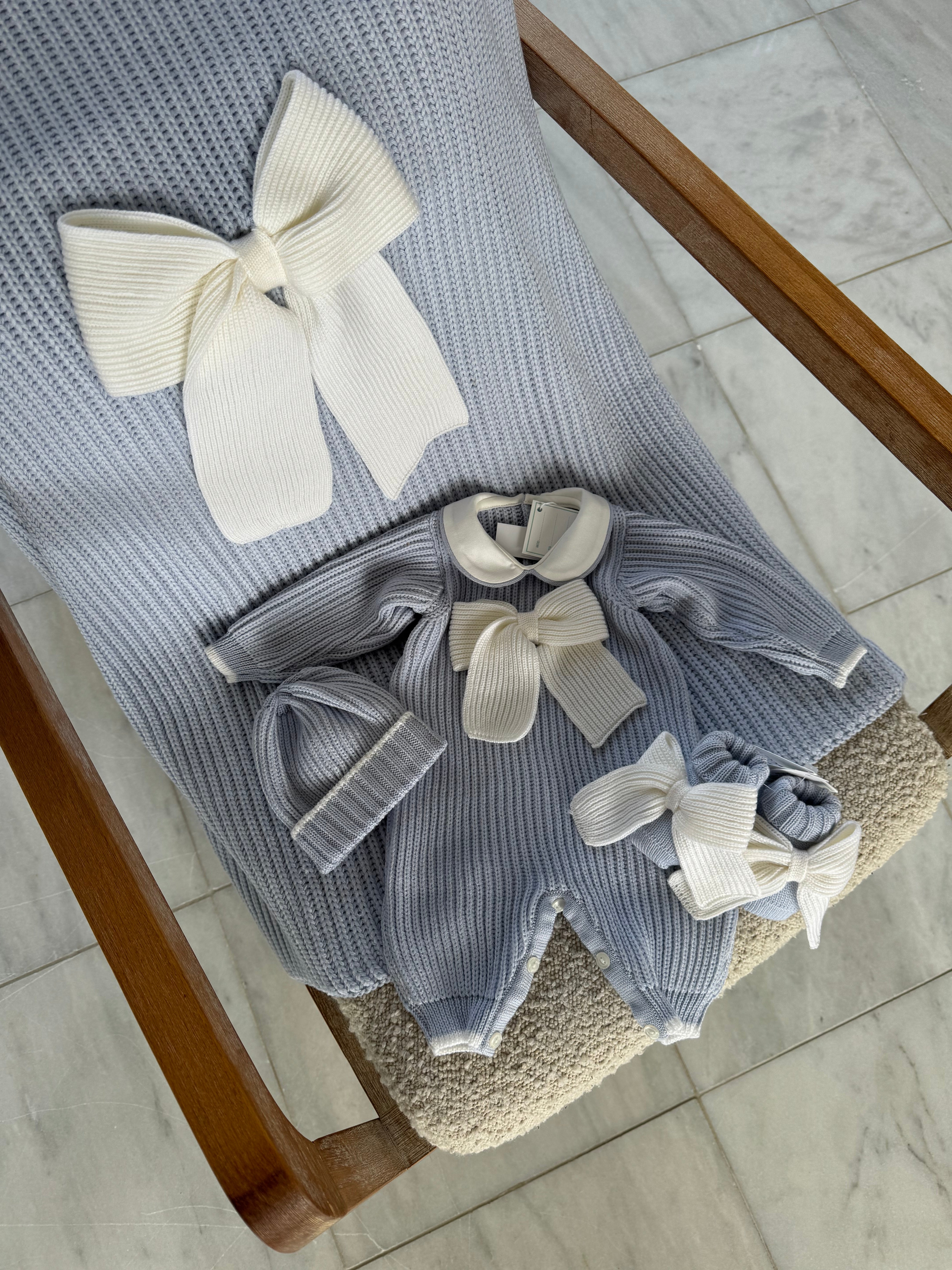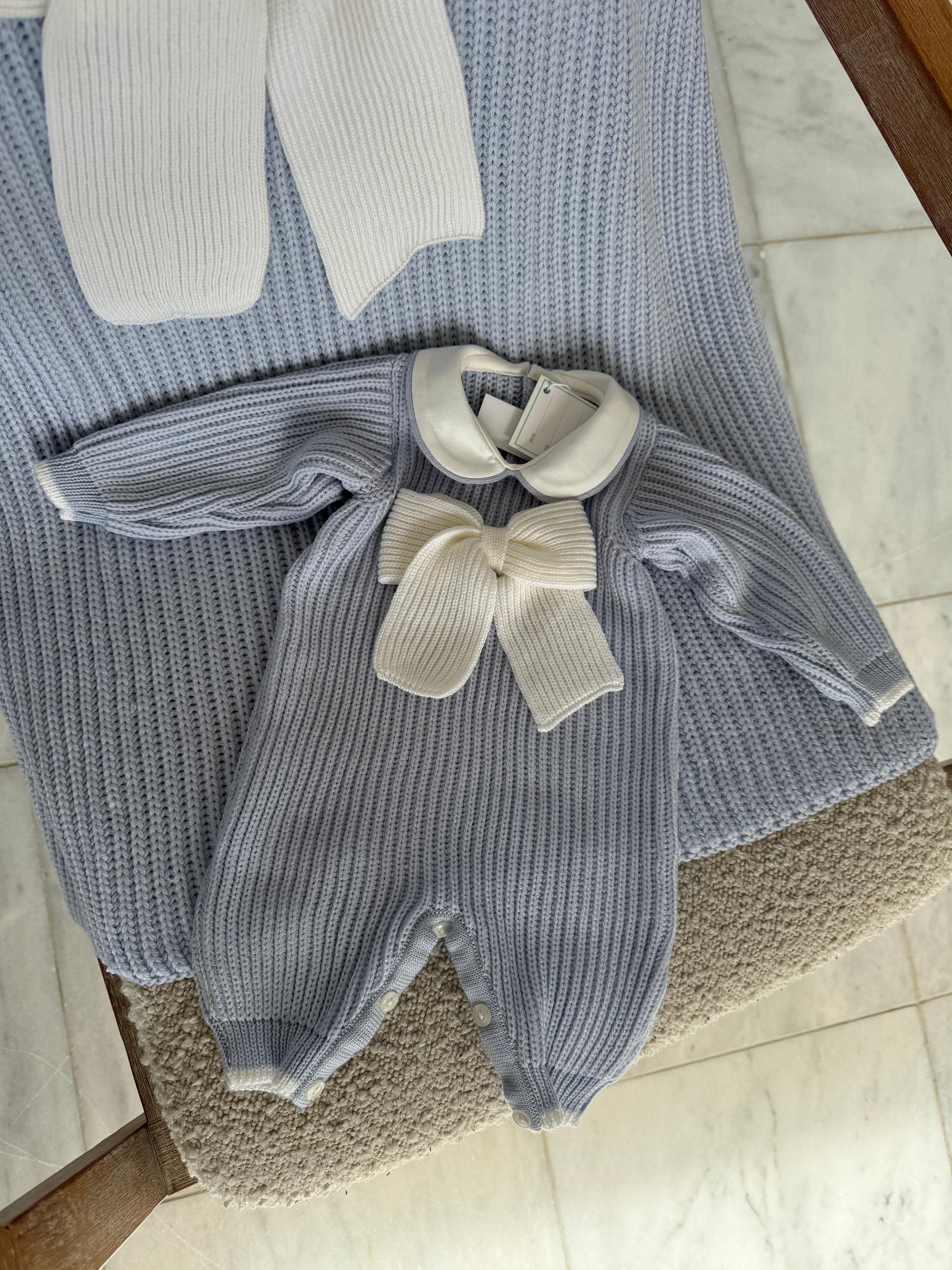 Beautiful knitted Merino Wool Blue Baby Romper with Bow details.