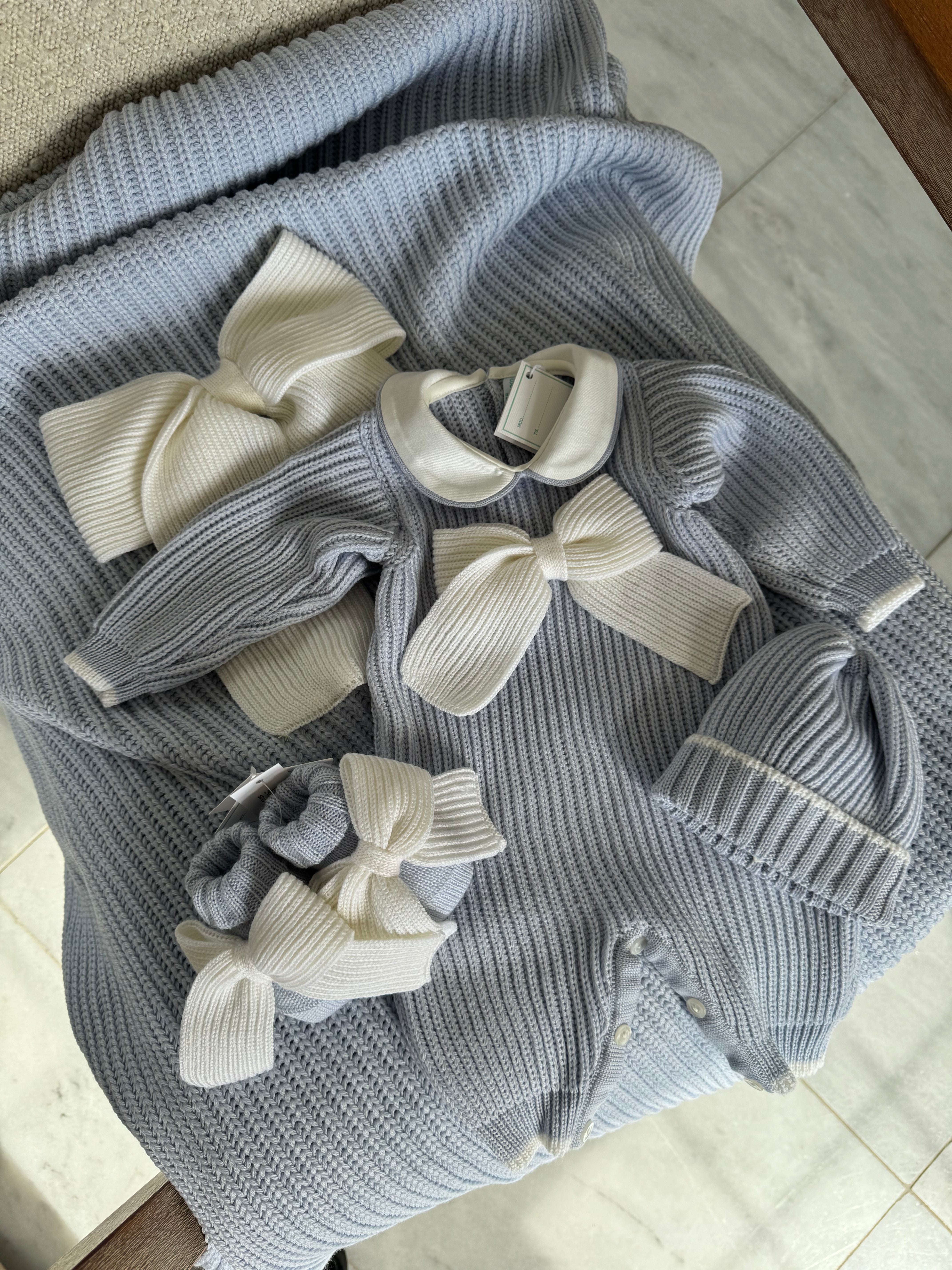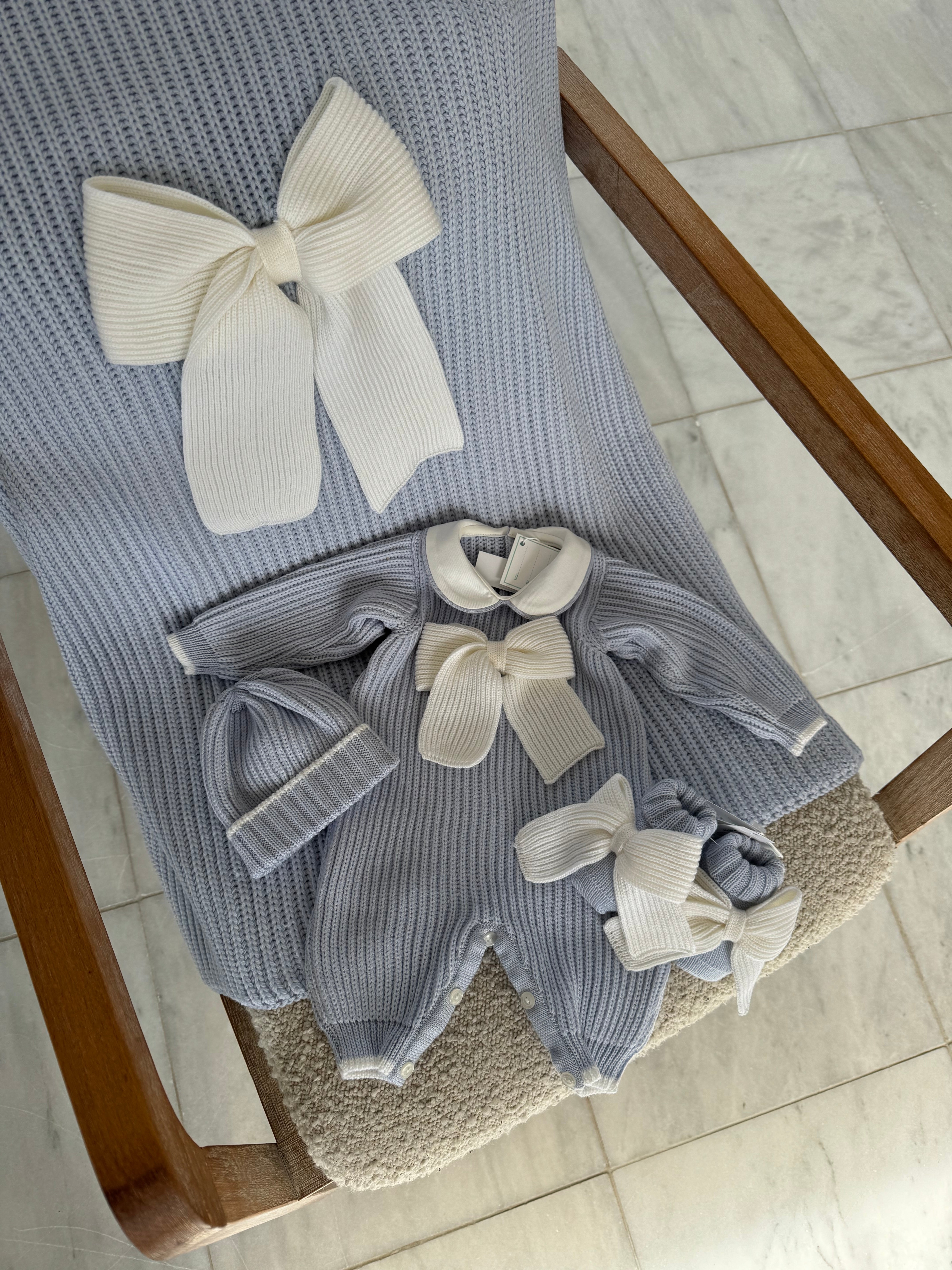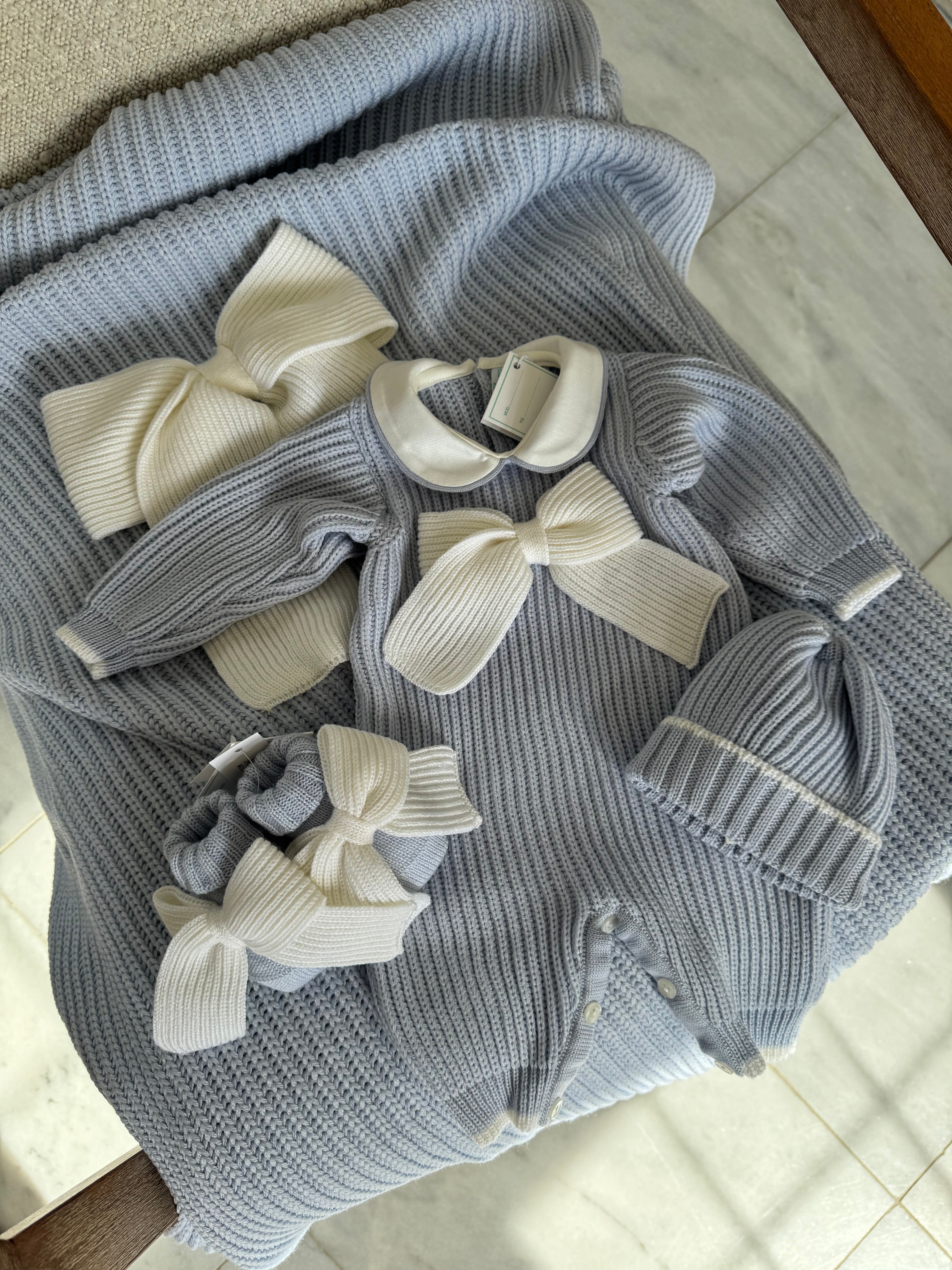 Beautiful knitted Merino Wool Blue Baby Romper with Bow details.