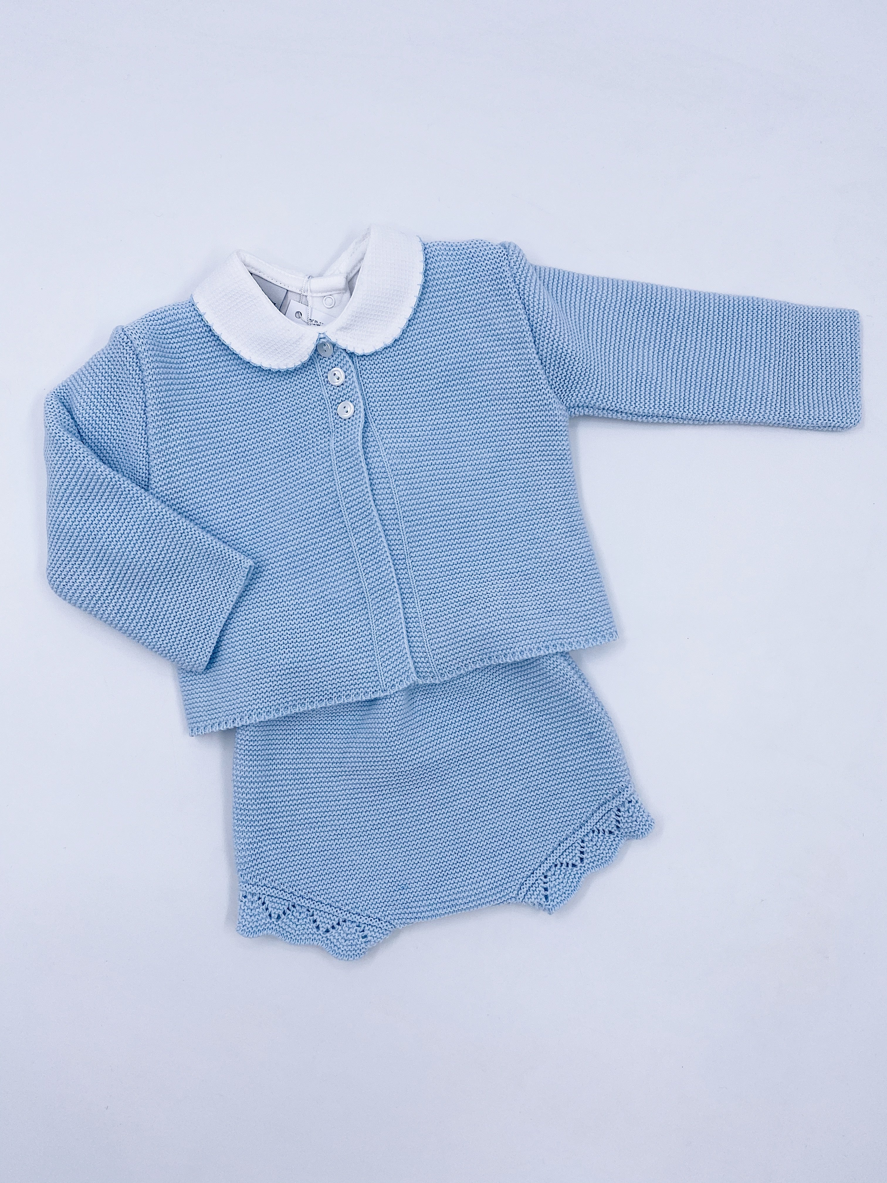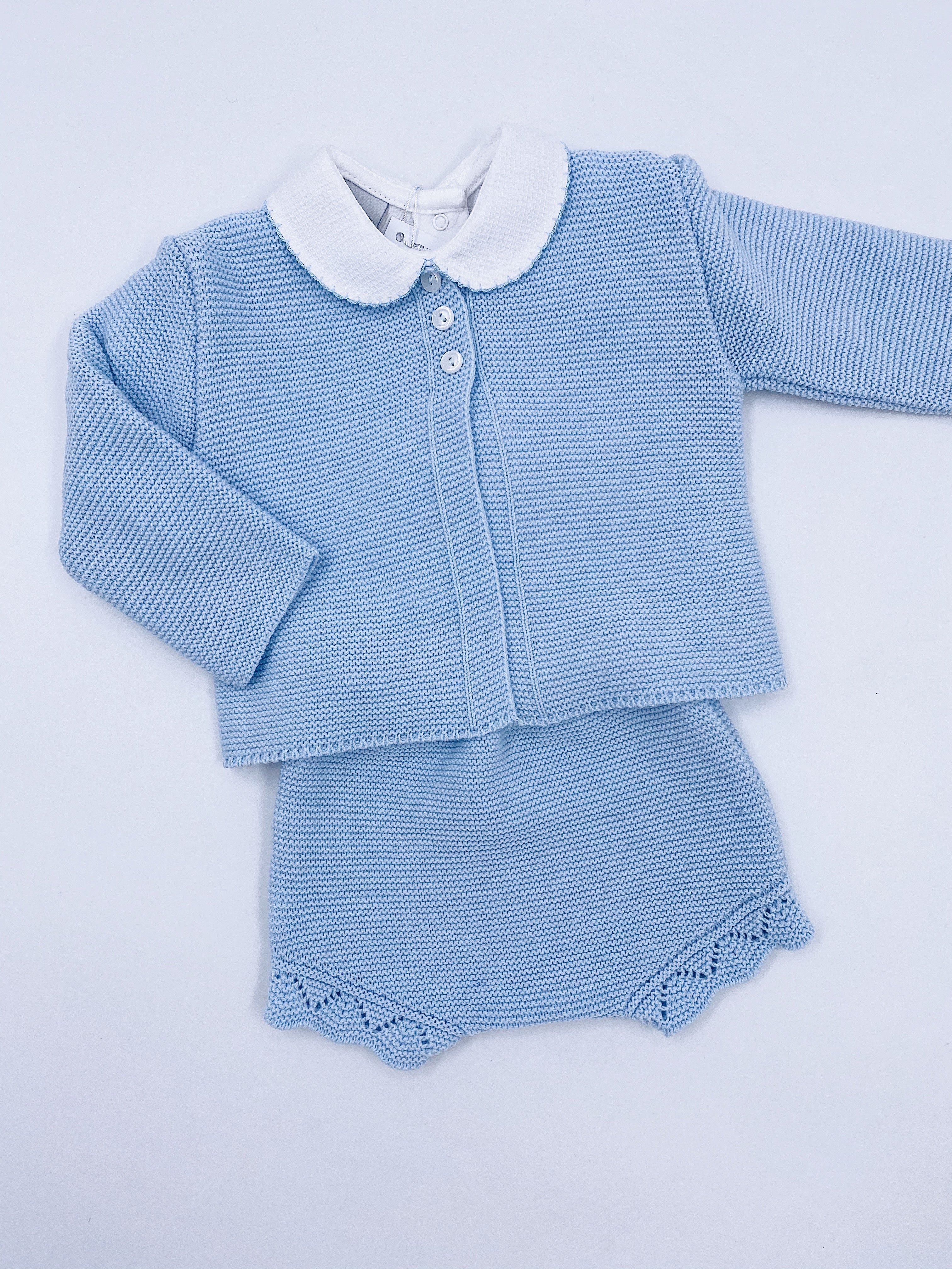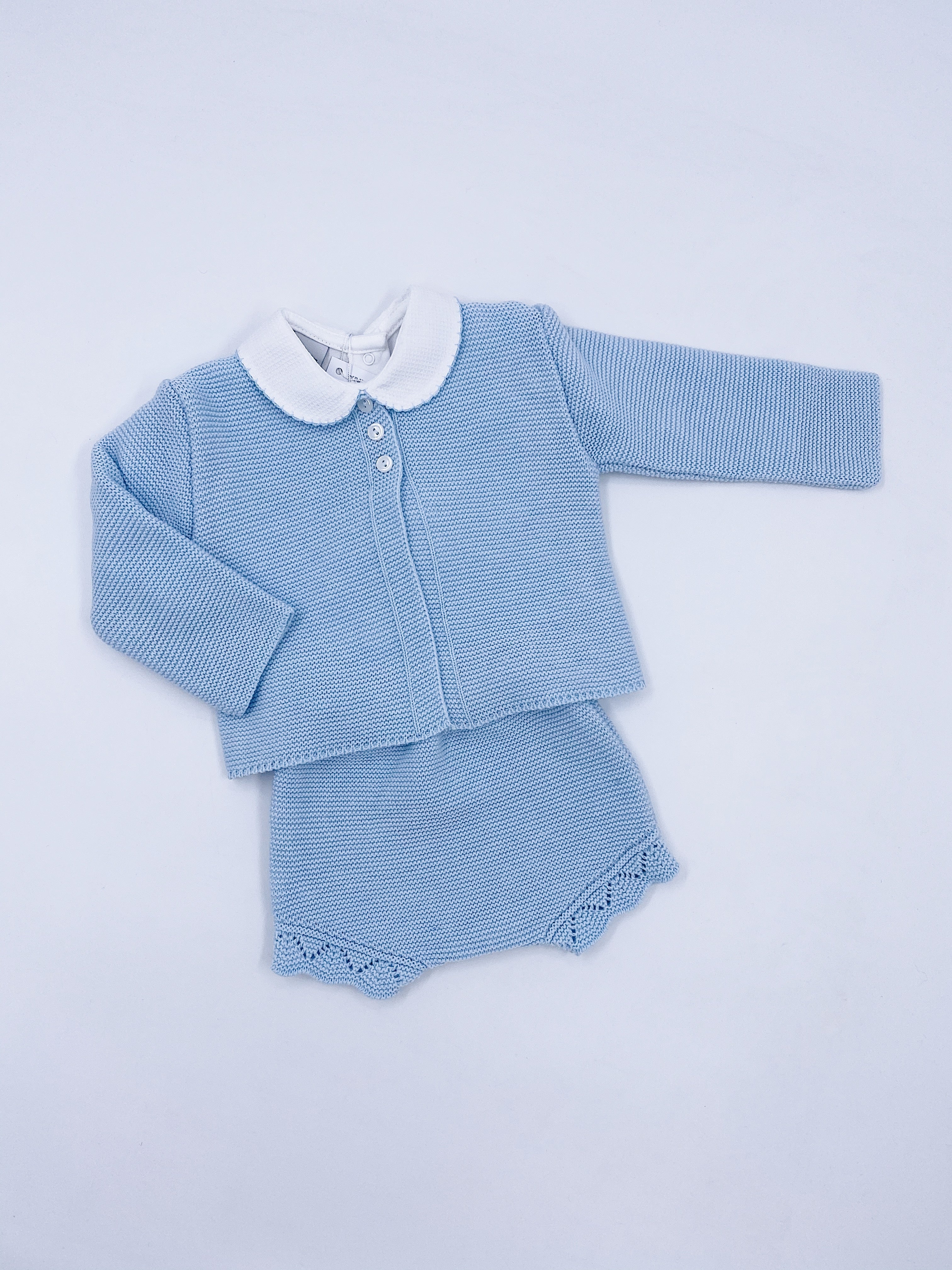 Baby blue knitted shorts 3 piece set (Knitted cardigan,knitted shorts,white cotton bodysuit)