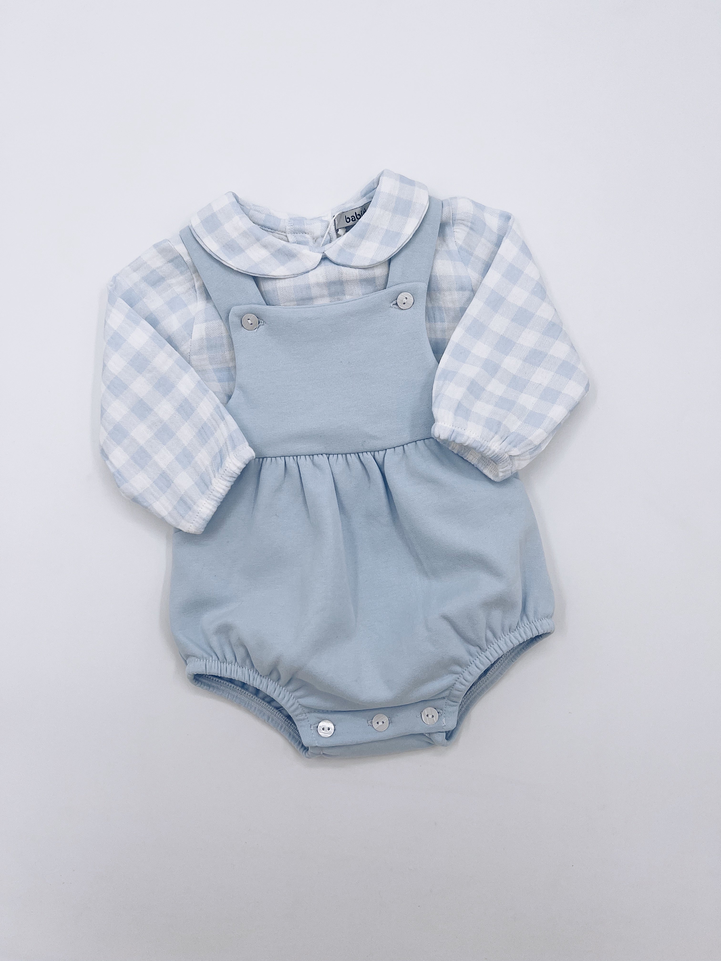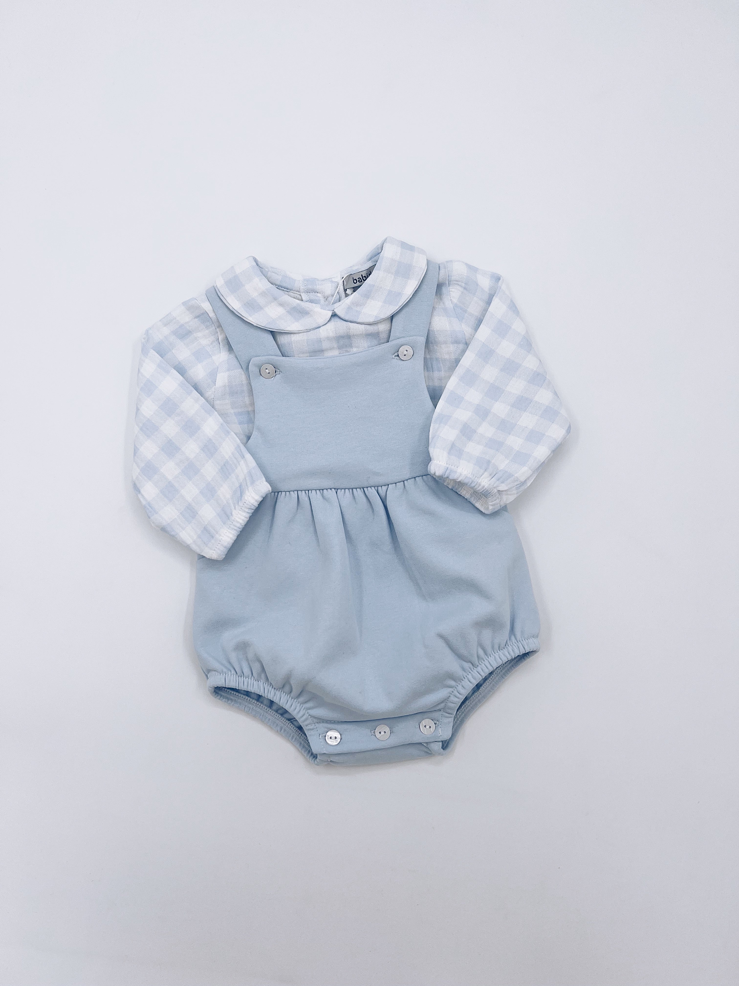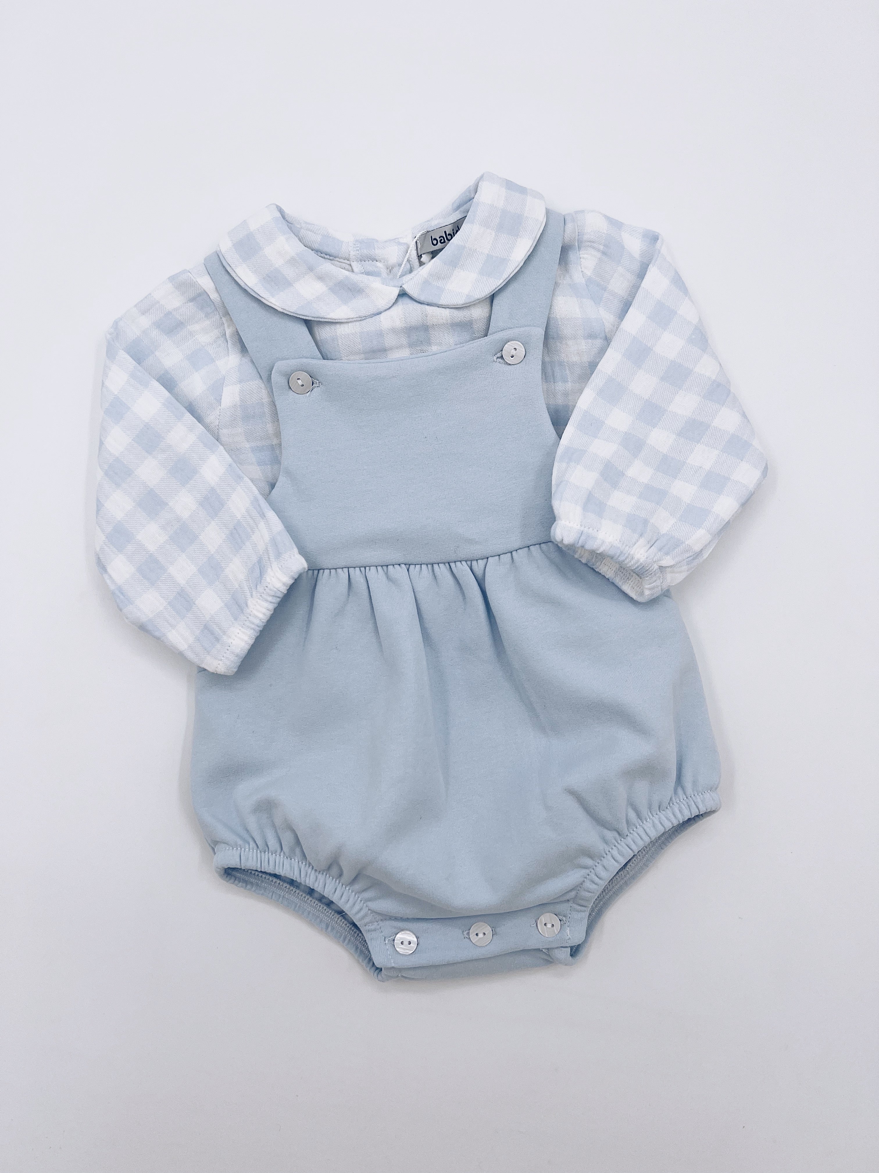 Cute white/ pale blue cotton dungaree set for little boys by Babidu. The soft and lightweight top.The pale blue cotton corduroy sort dungarees have a stretchy waist, with button fastenings on the straps and between the legs.