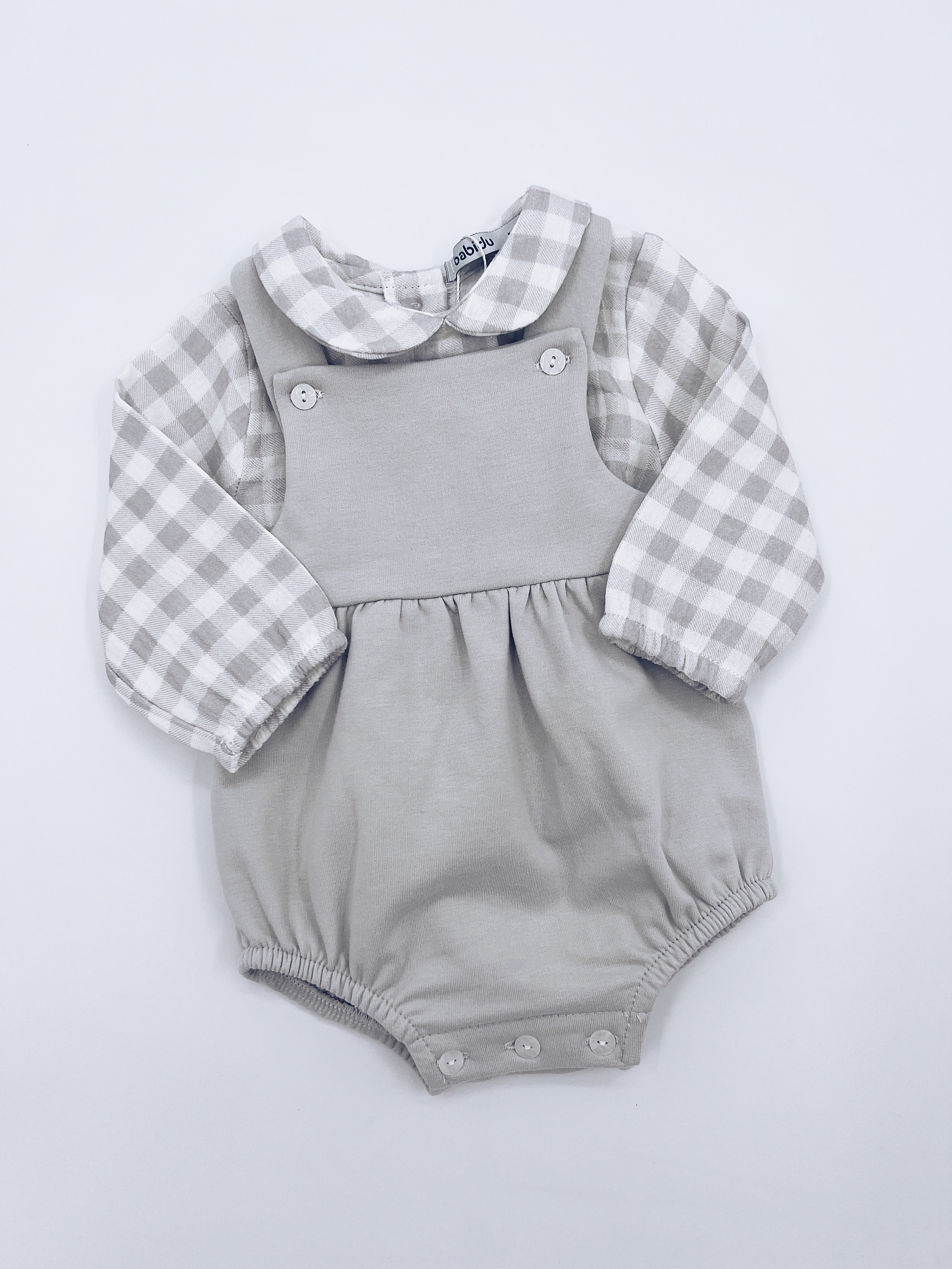 Cute white/ grey cotton dungaree set for little boys by Babidu. The soft and lightweight top.The grey cotton corduroy sort dungarees have a stretchy waist, with button fastenings on the straps and between the legs.