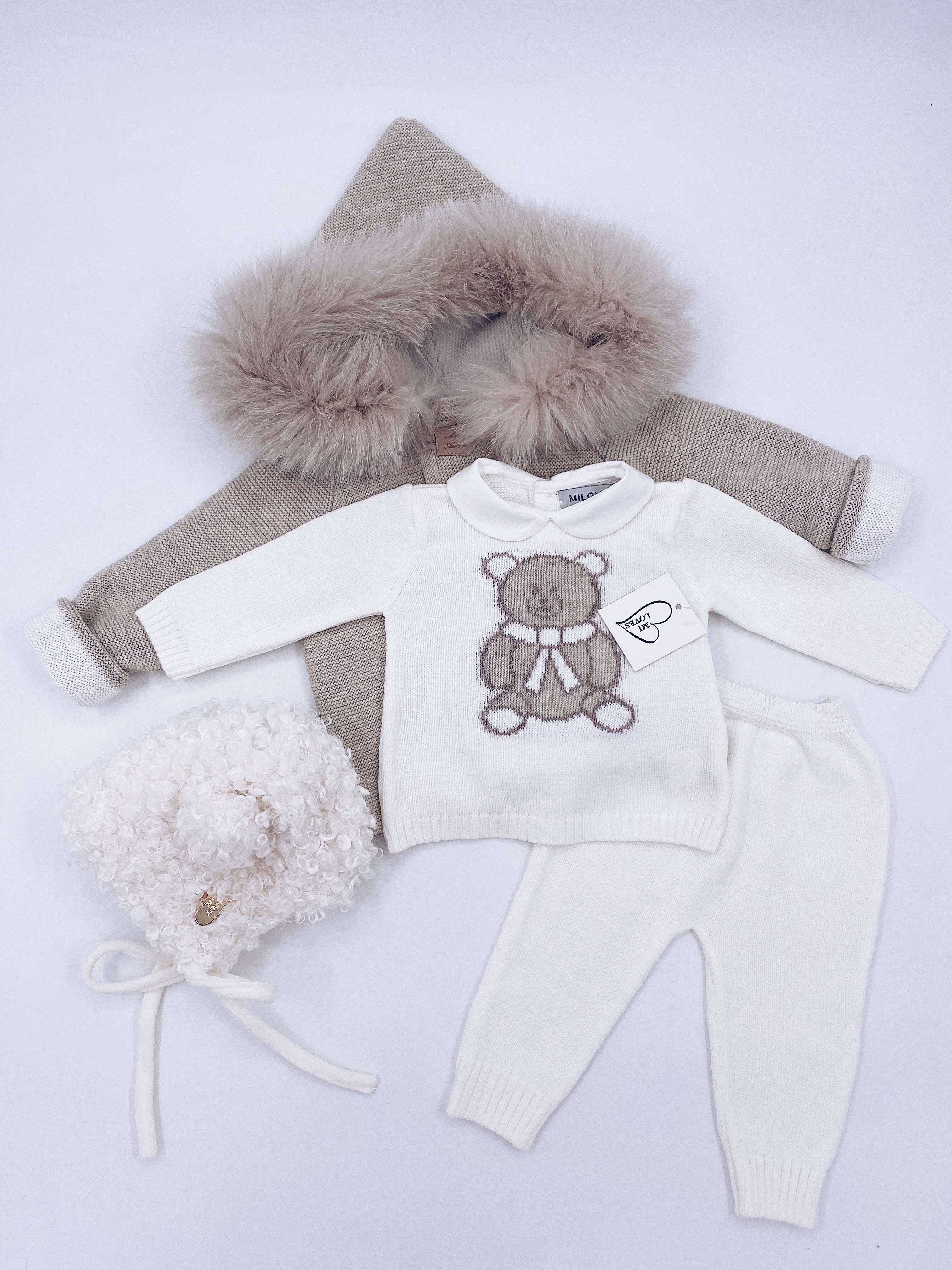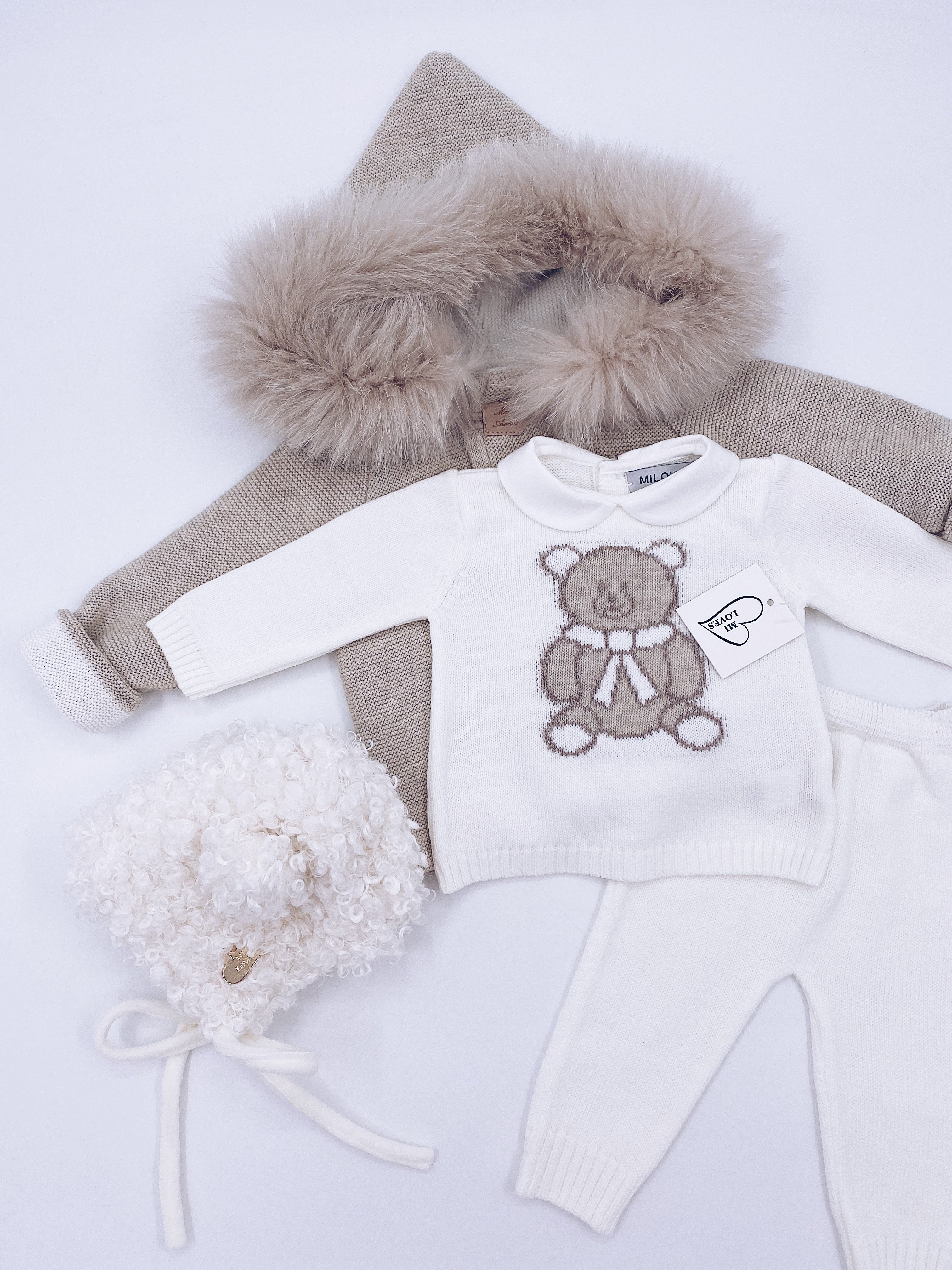 MI LOVES Signature Little Bear knitted 2 piece suit in Ivory .
