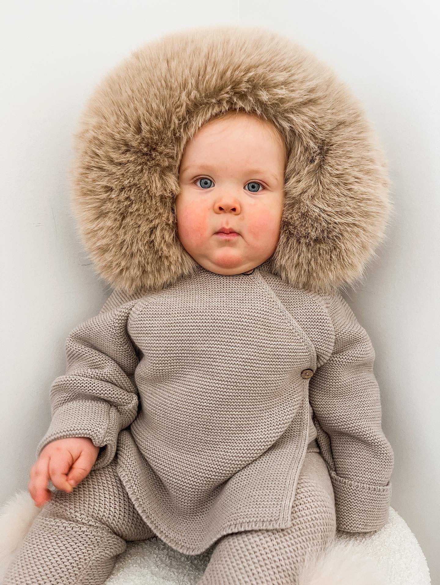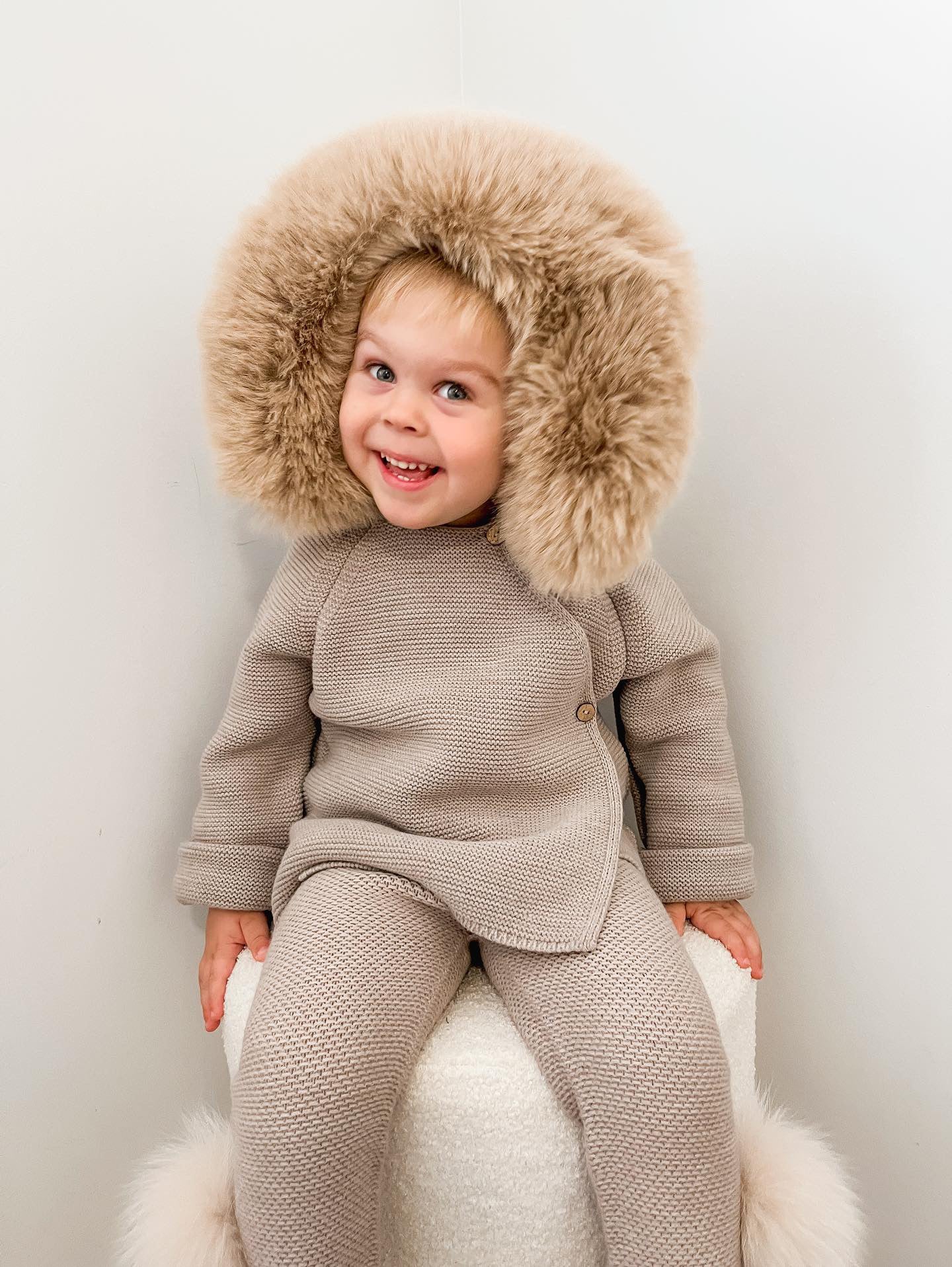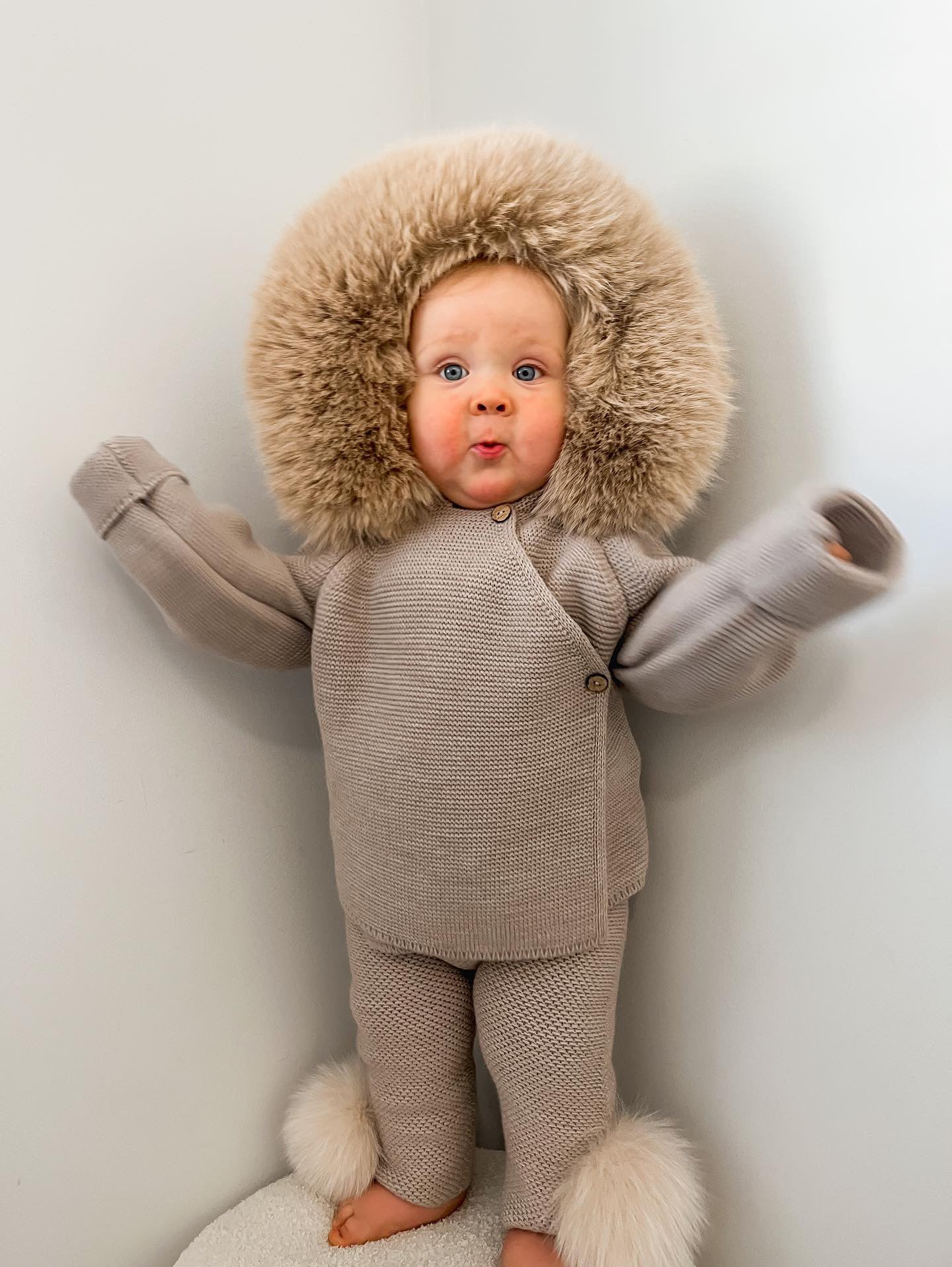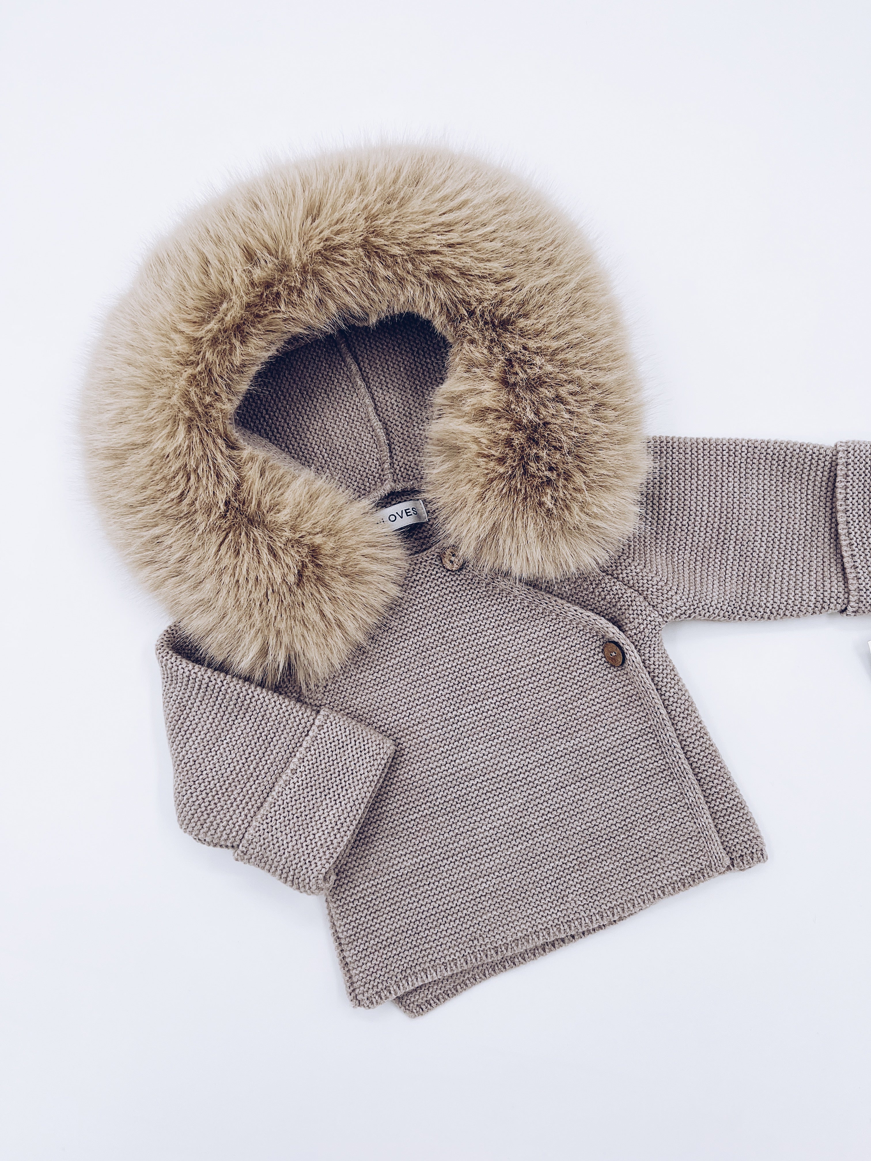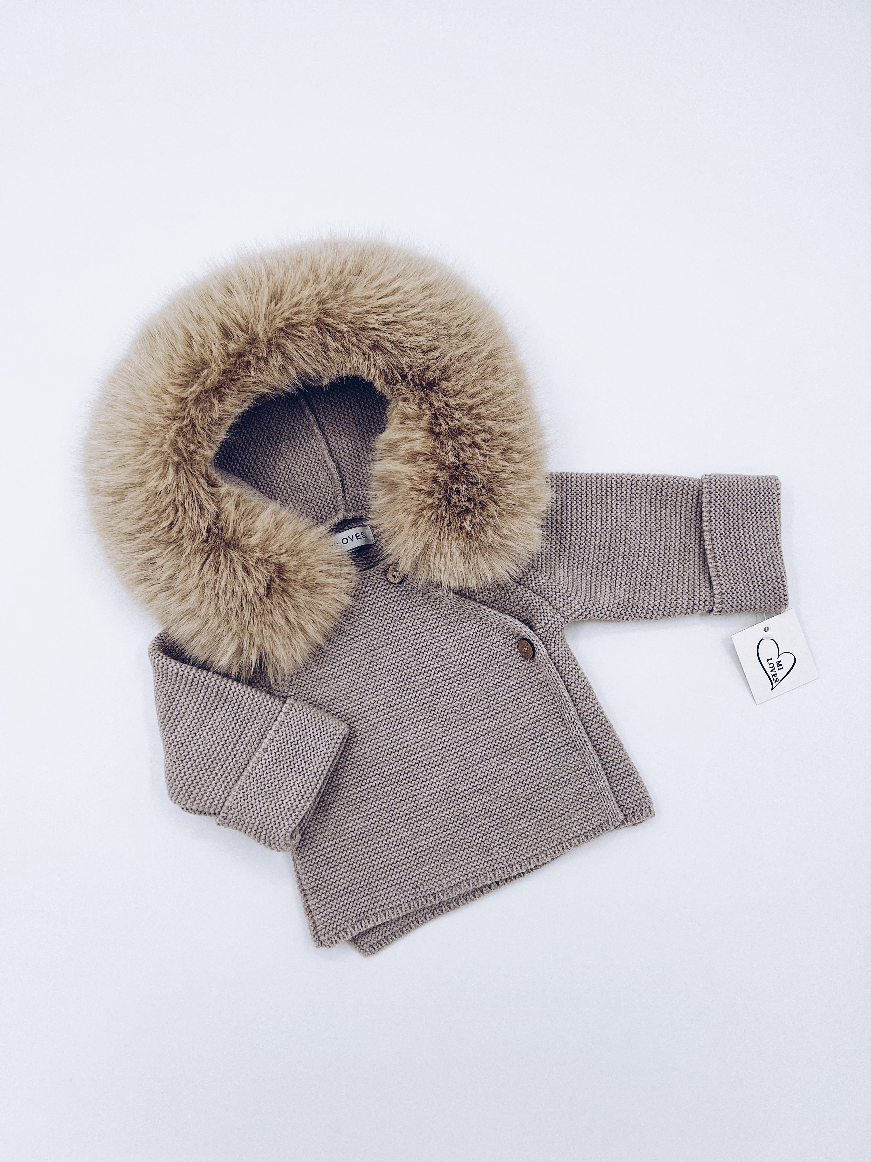 Beautiful Beige Knitted Cardigan with Synthetic fur trim.