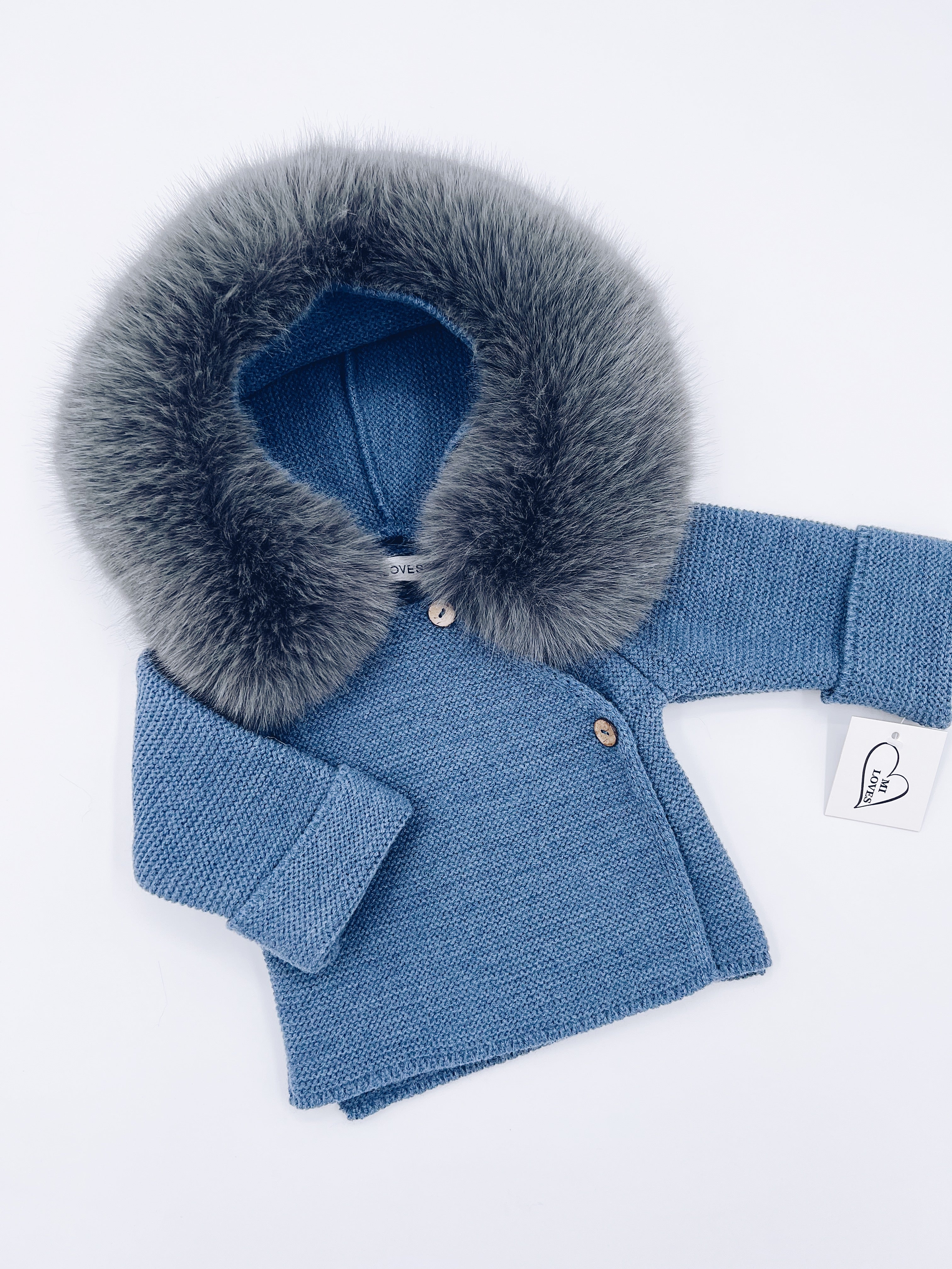 Beautiful Deep Blue Knitted Cardigan with Synthetic fur trim.