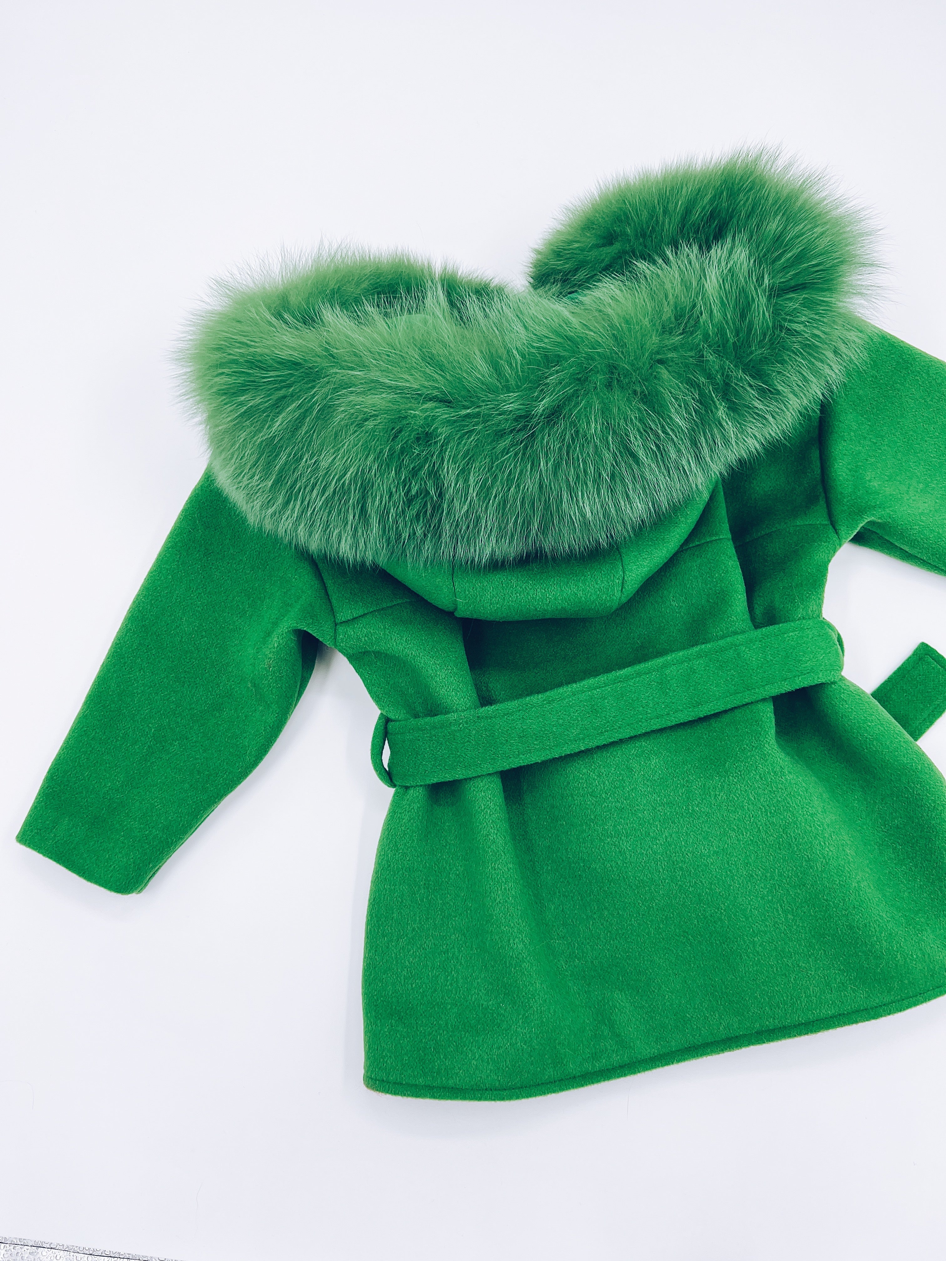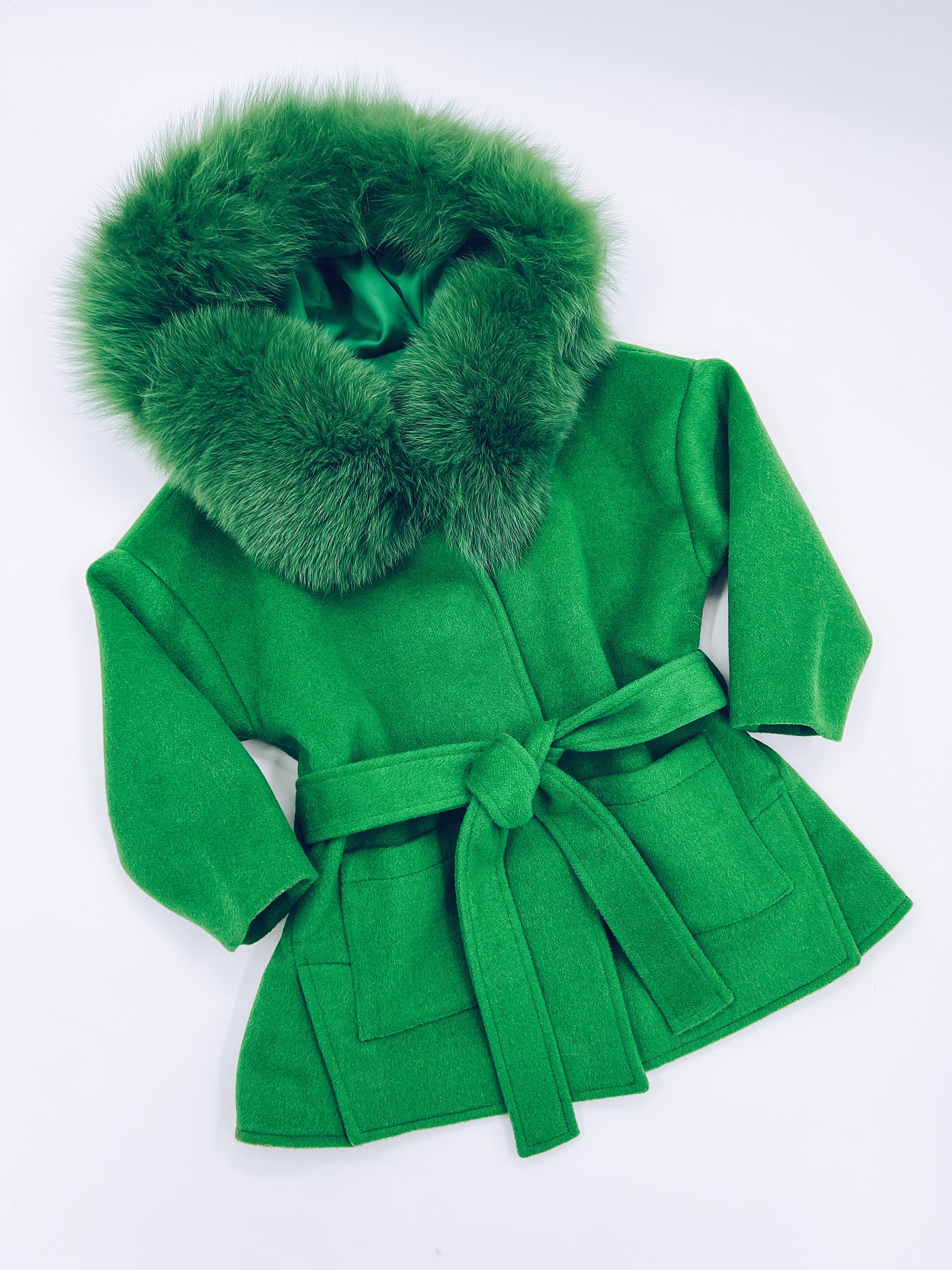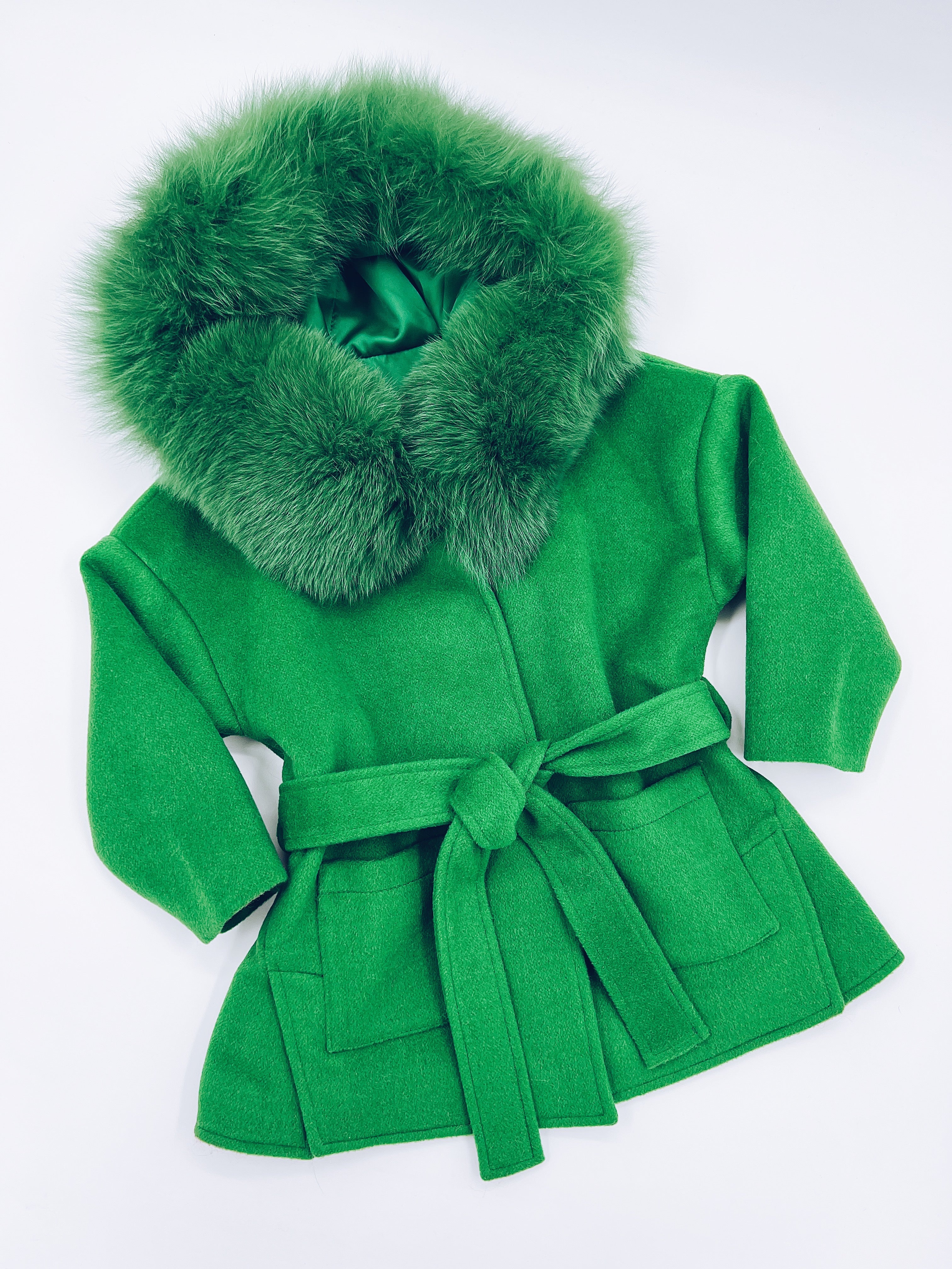 MI LOVES SIGNATURE Luxurious wool kids coat with Fox fur trim in deep green colour.Unisex style perfect for boys or girls.