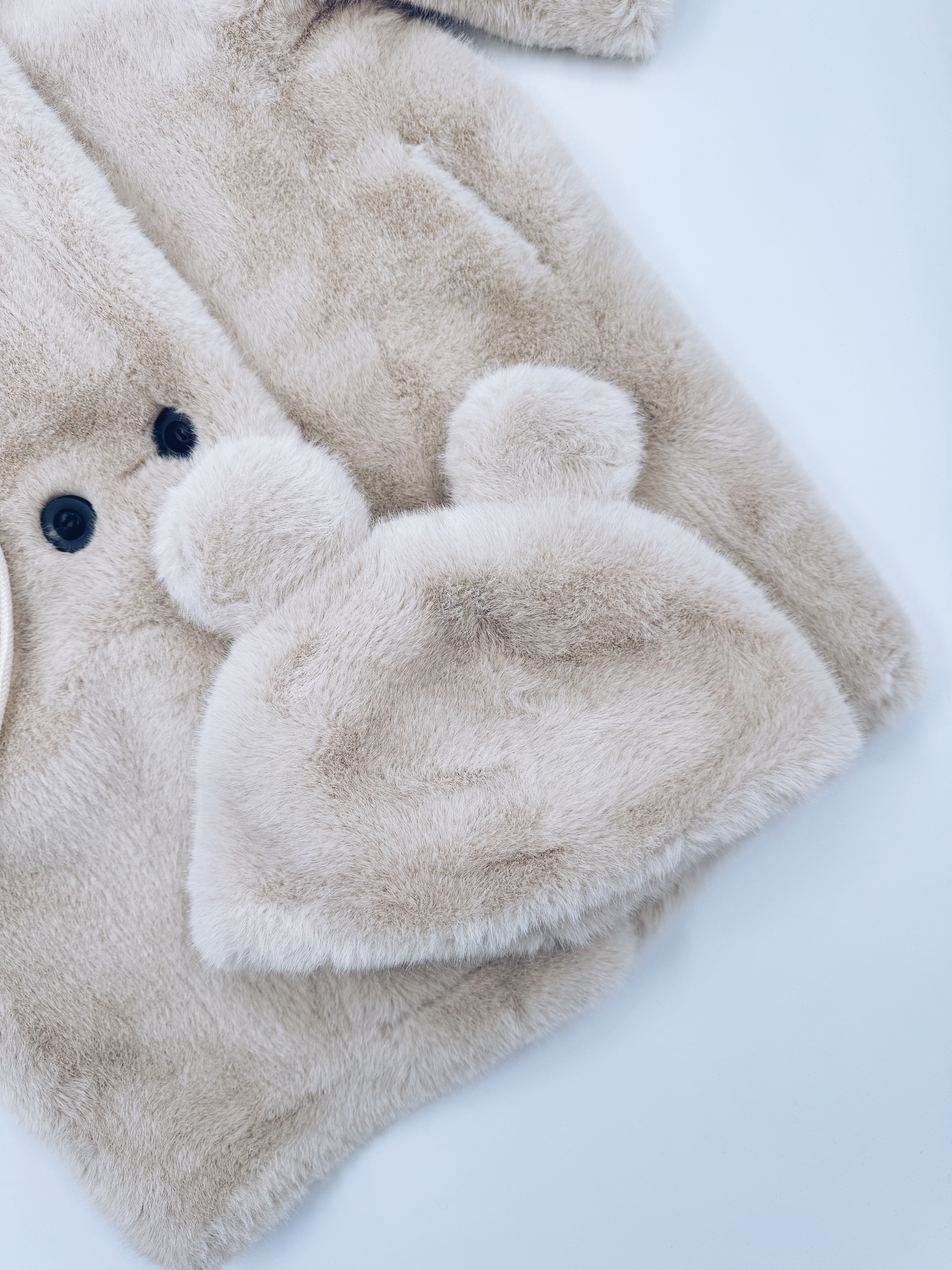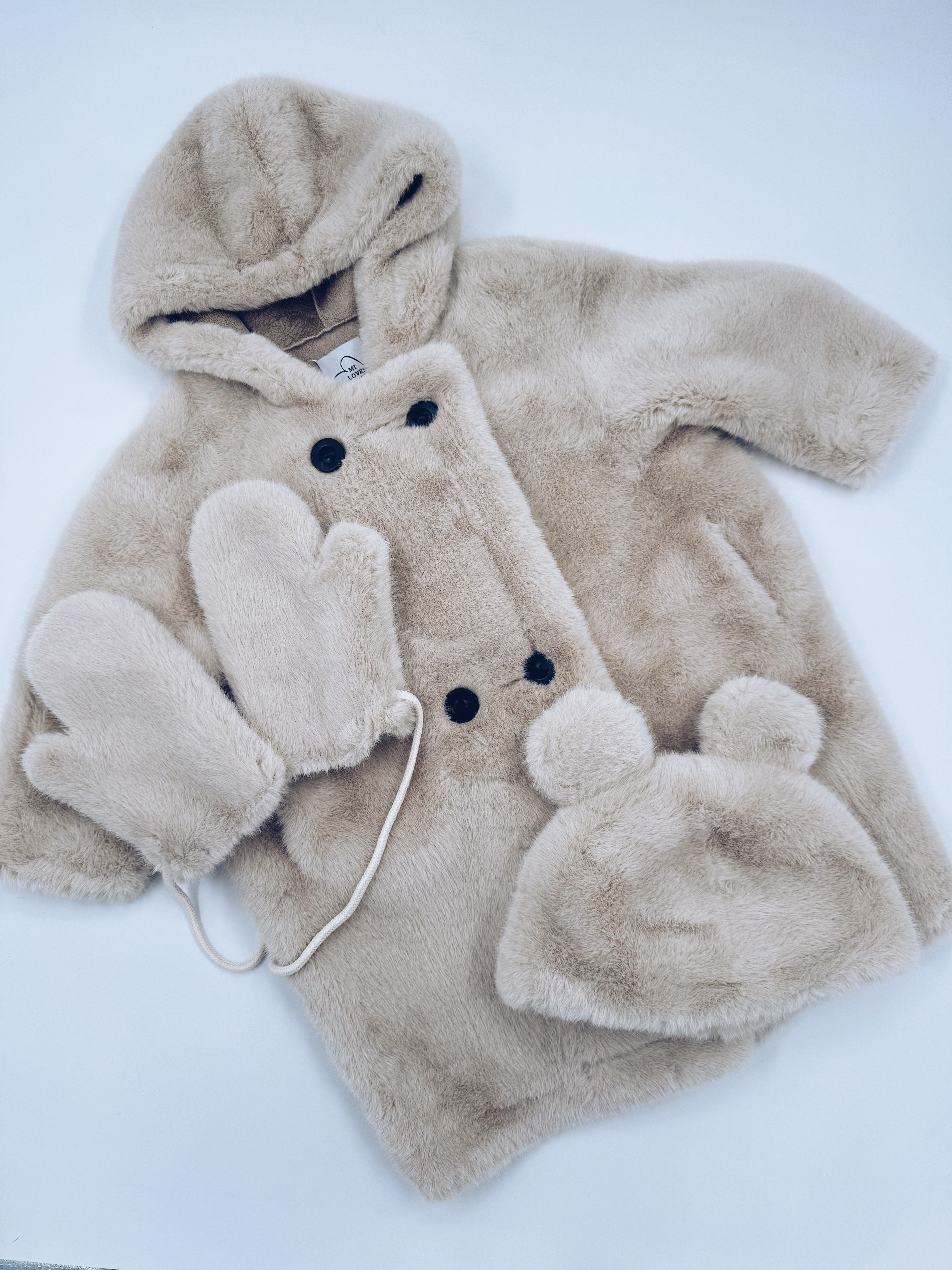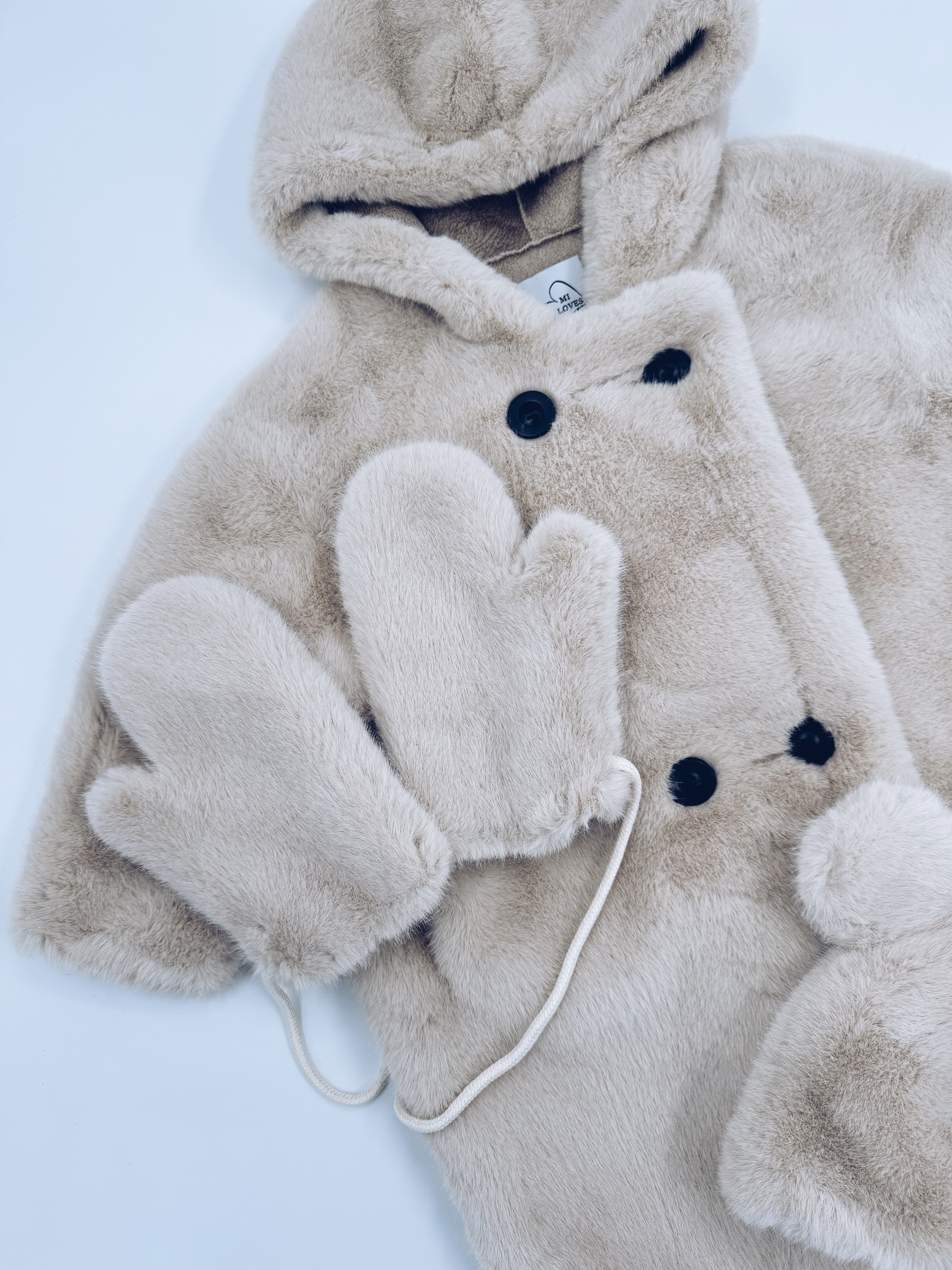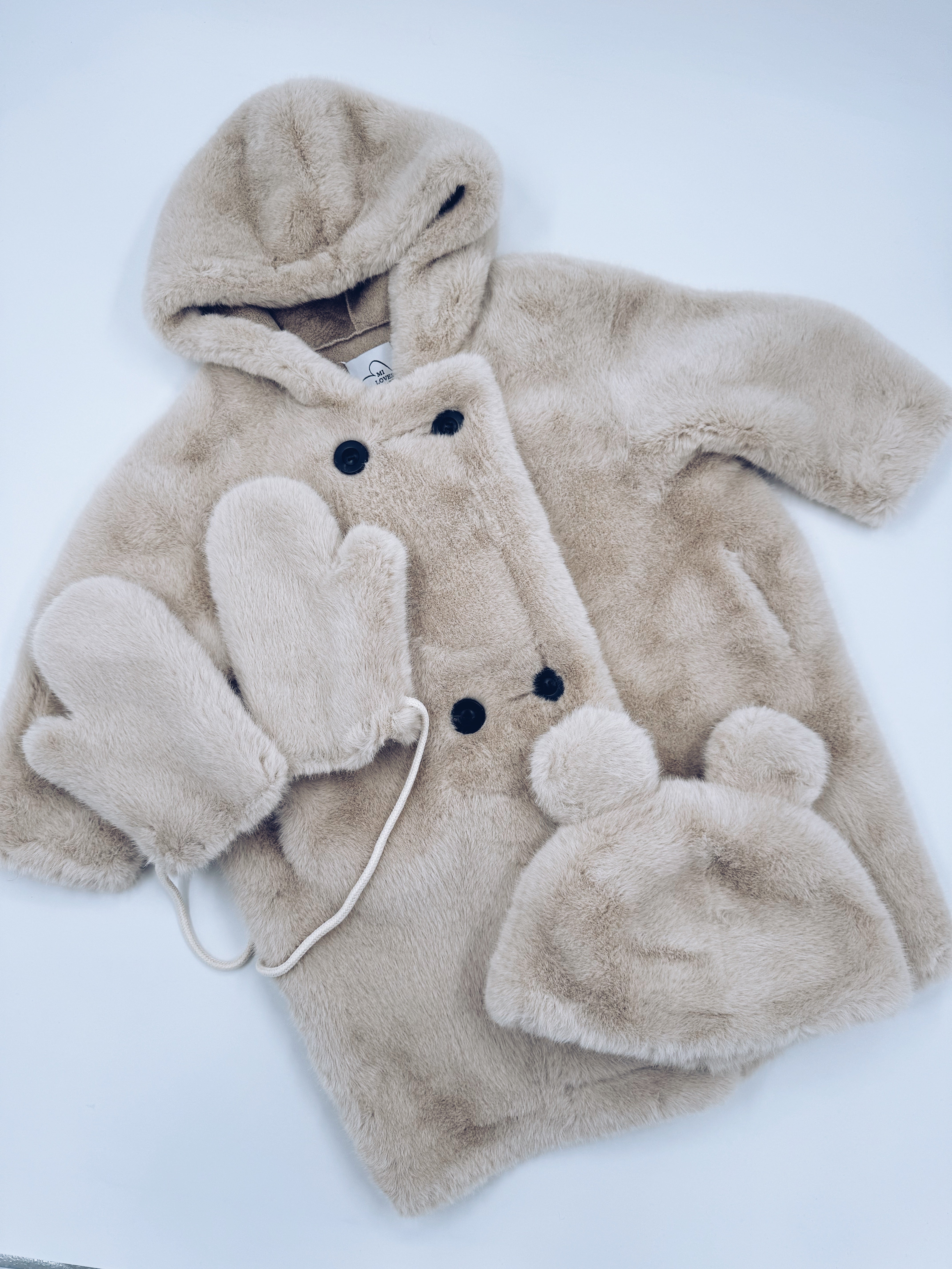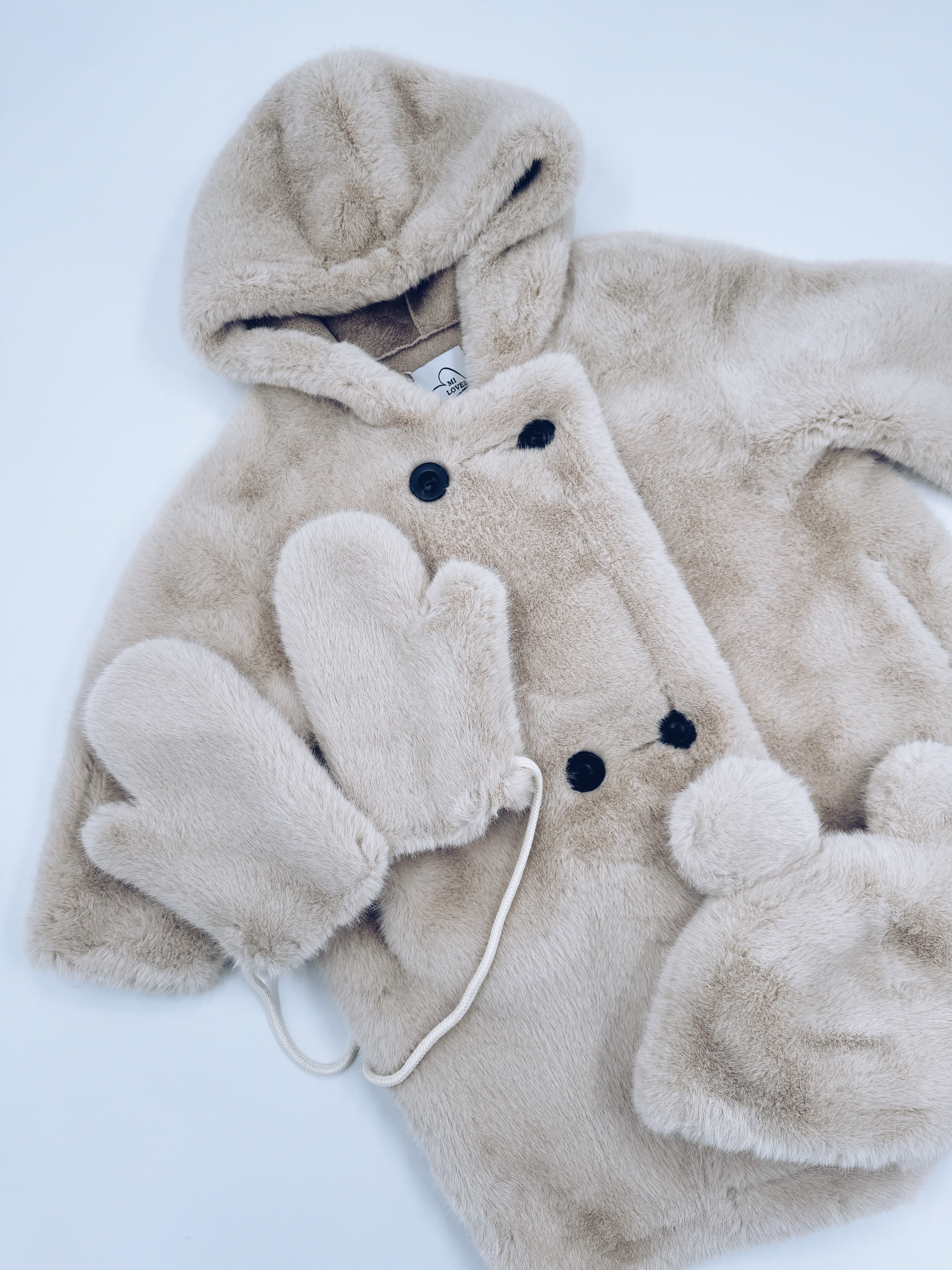 MI LOVES Signature Cream Bear coat 3 piece set.Set include hooded coat,matching bear hat and matching mittens.Oversized/Loose fit.