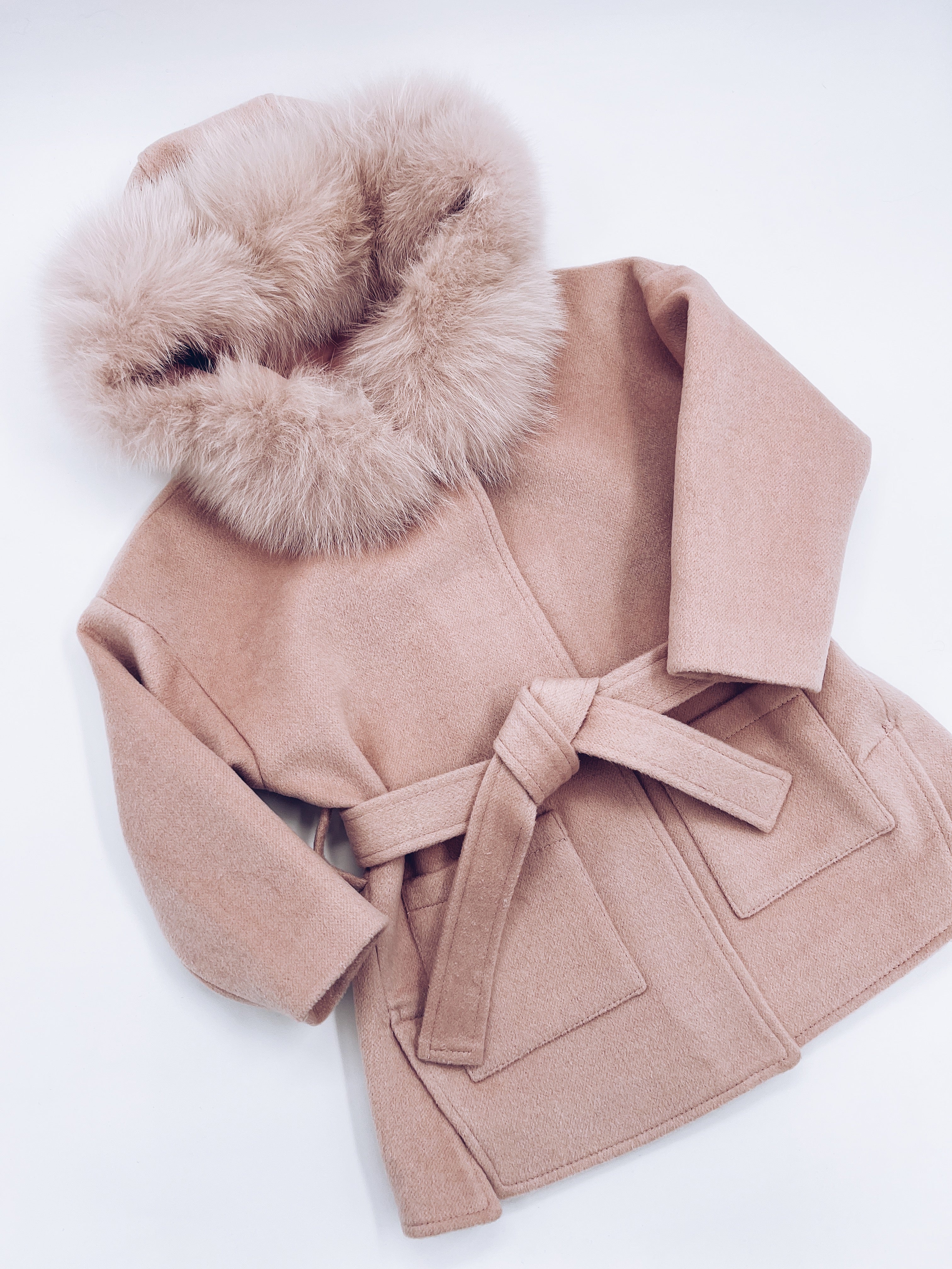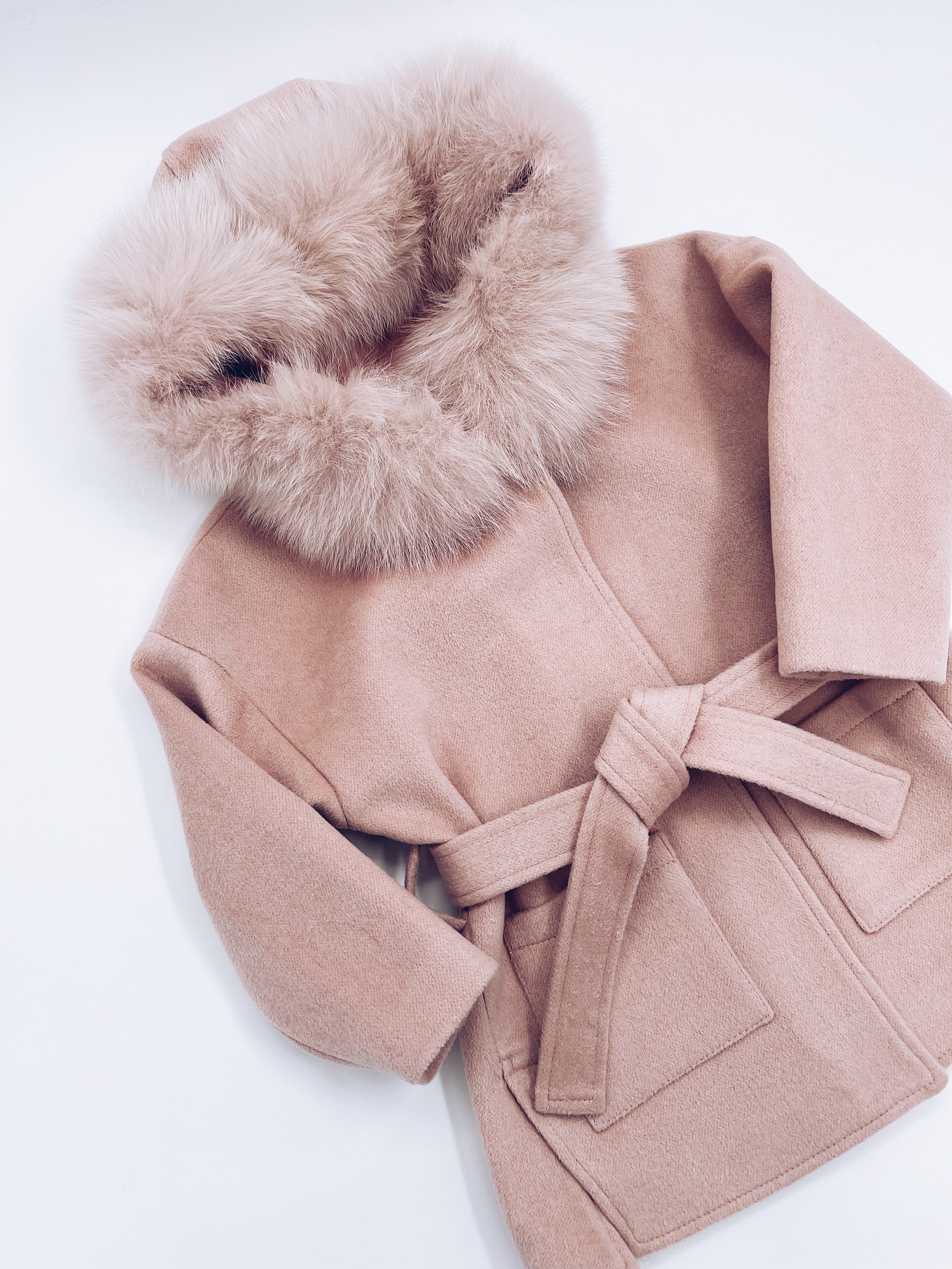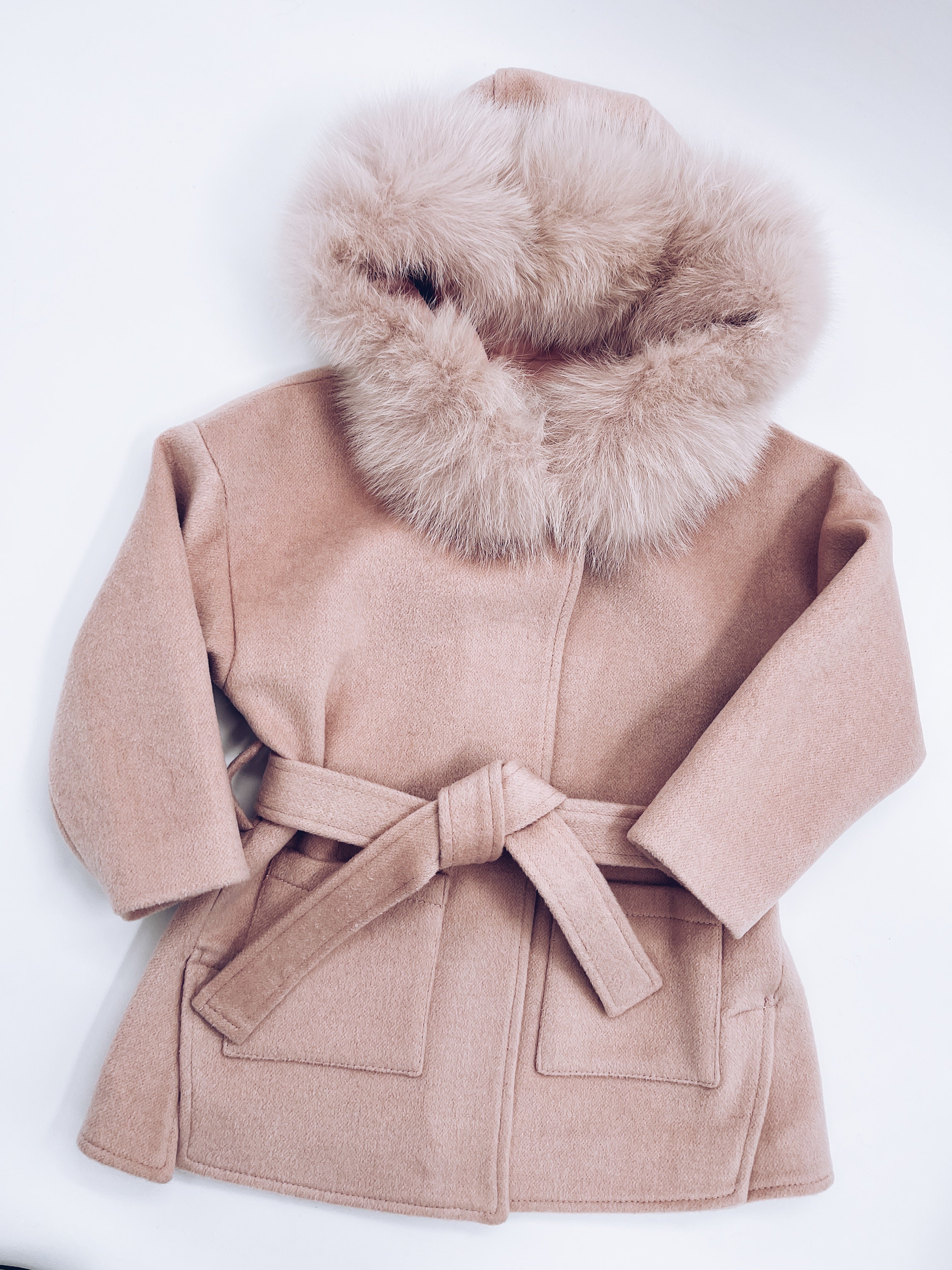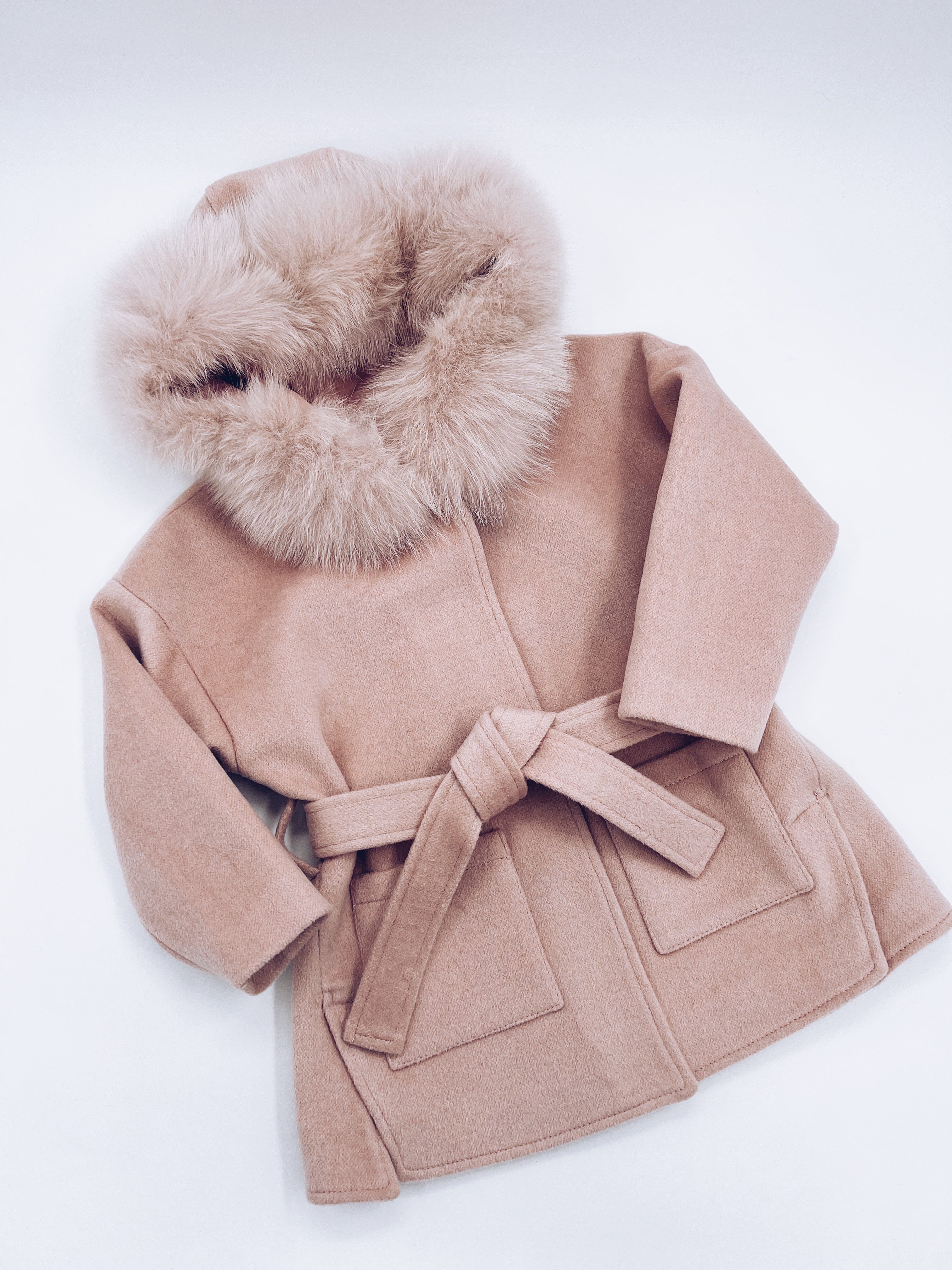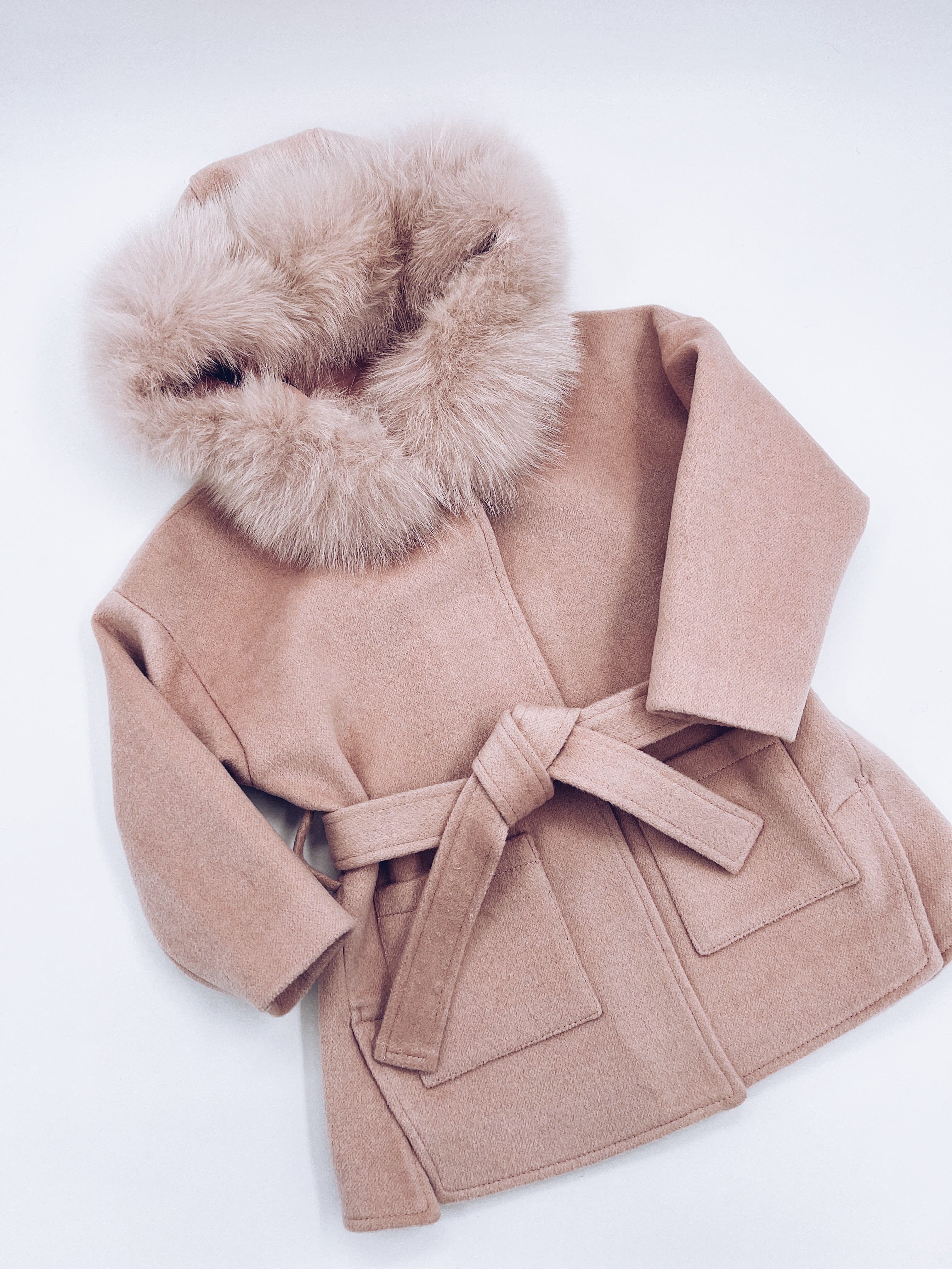 MI LOVES SIGNATURE Luxurious wool kids coat with Fox fur trim in Cappuccino/Dusty pink colour.
