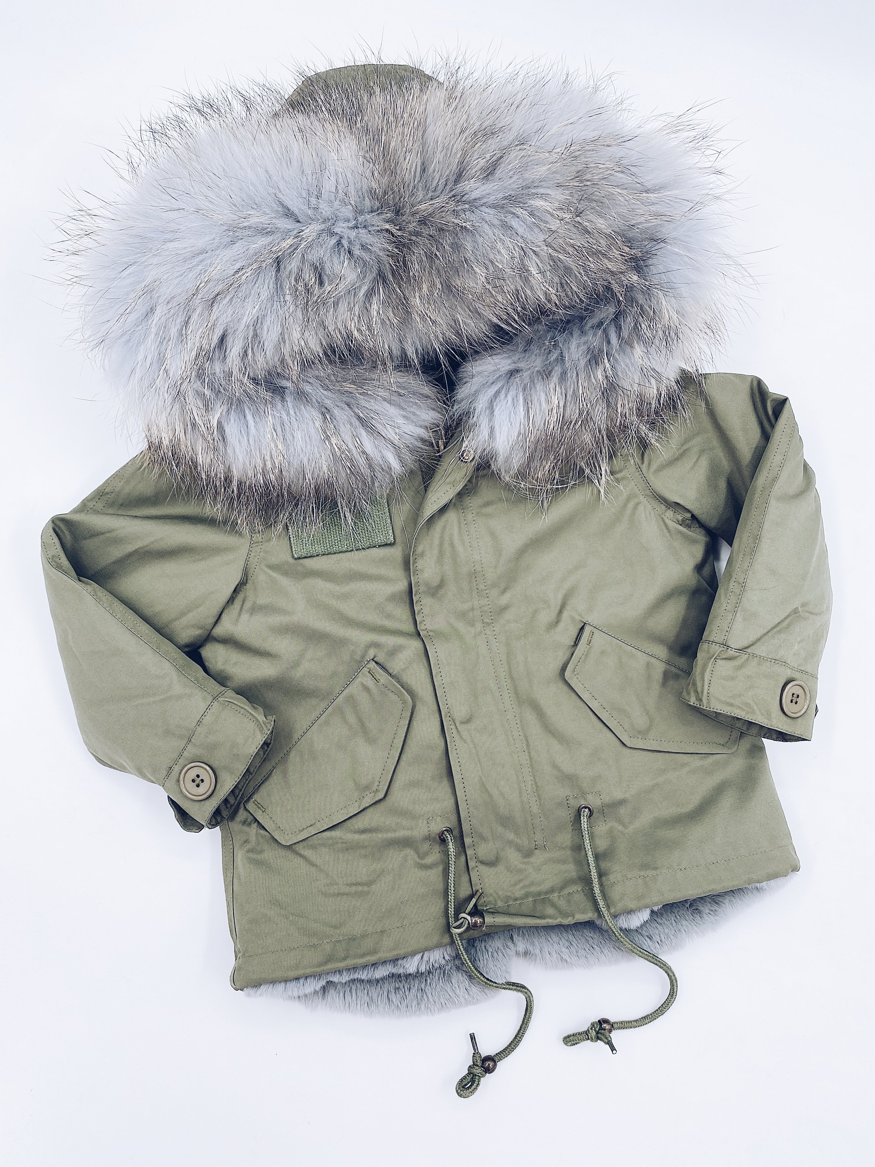 MI LOVES SIGNATURE Khaki Green parka jacket with Luxurious Grey Racoon fur trim.