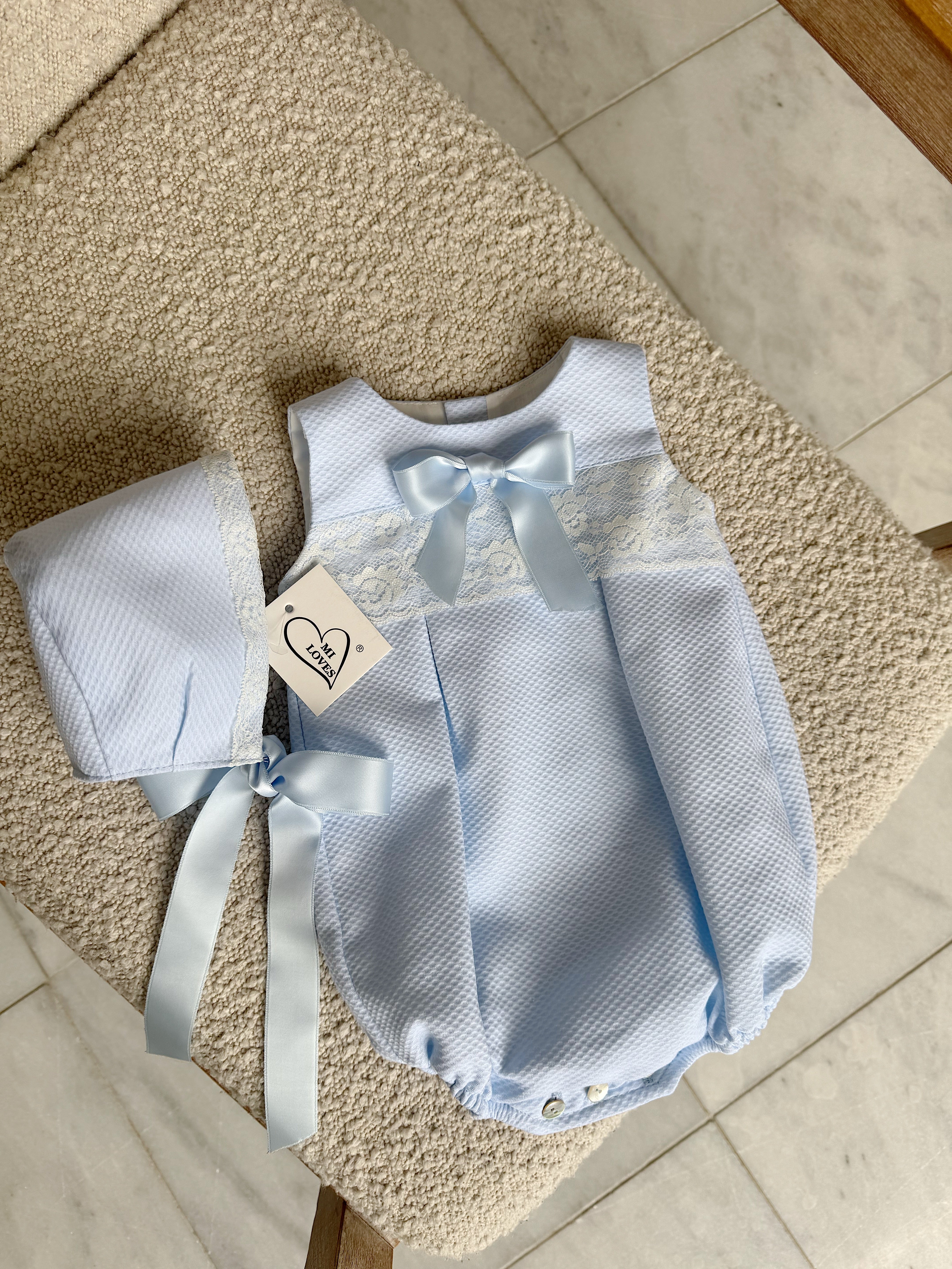 MI LOVES Baby blue Romper/Bonnet 2 piece set with beautiful lace details