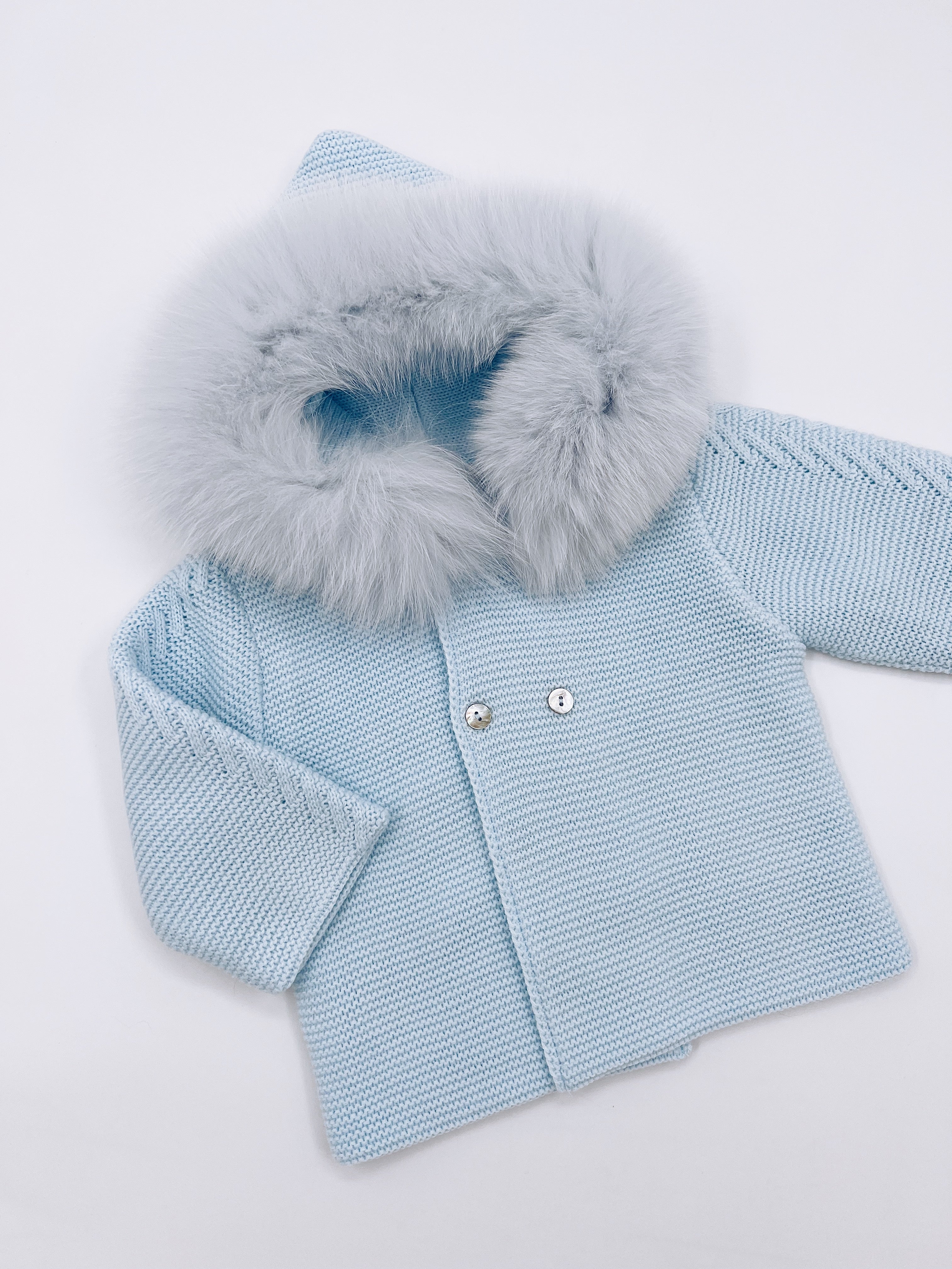 Beautiful Baby Blue Knitted Cardigan with Luxurious fur trim.