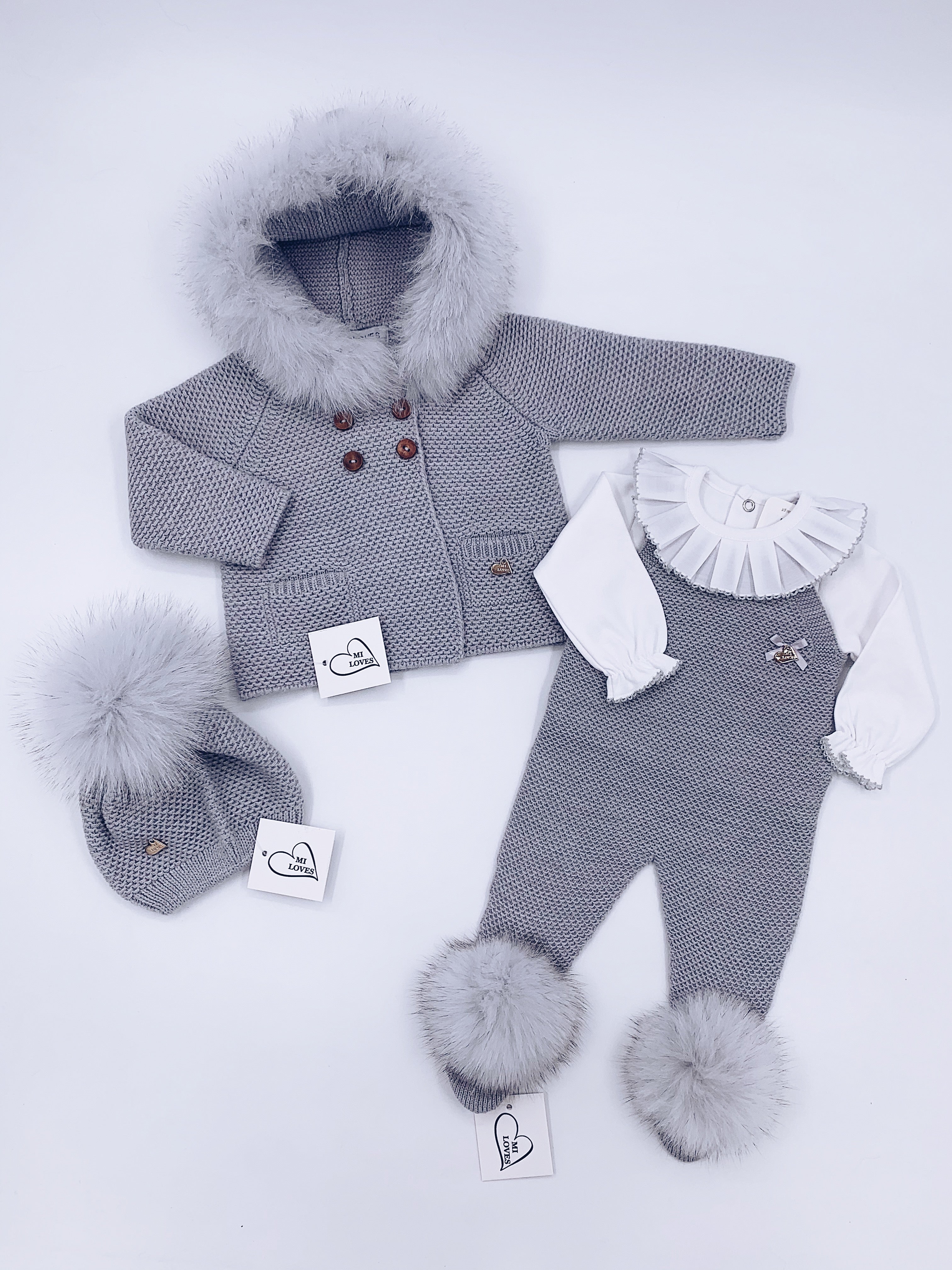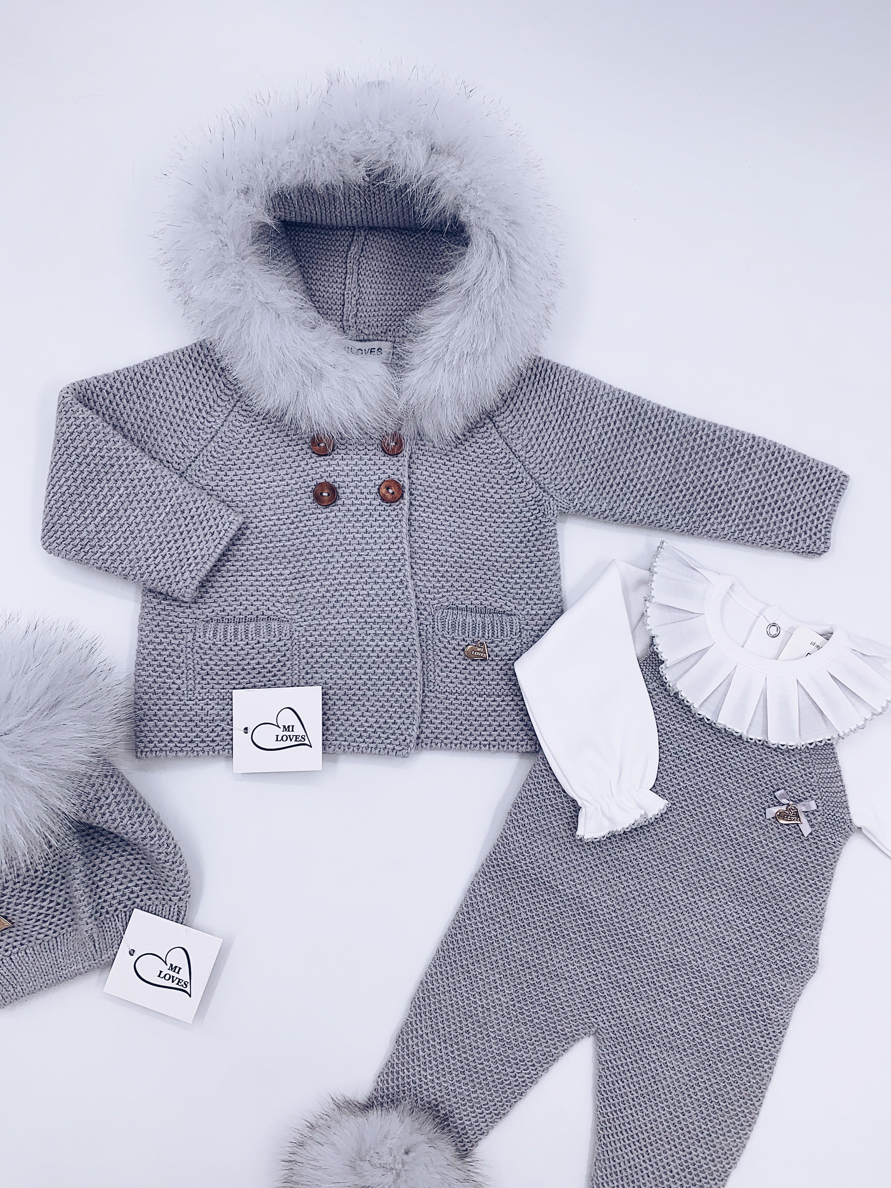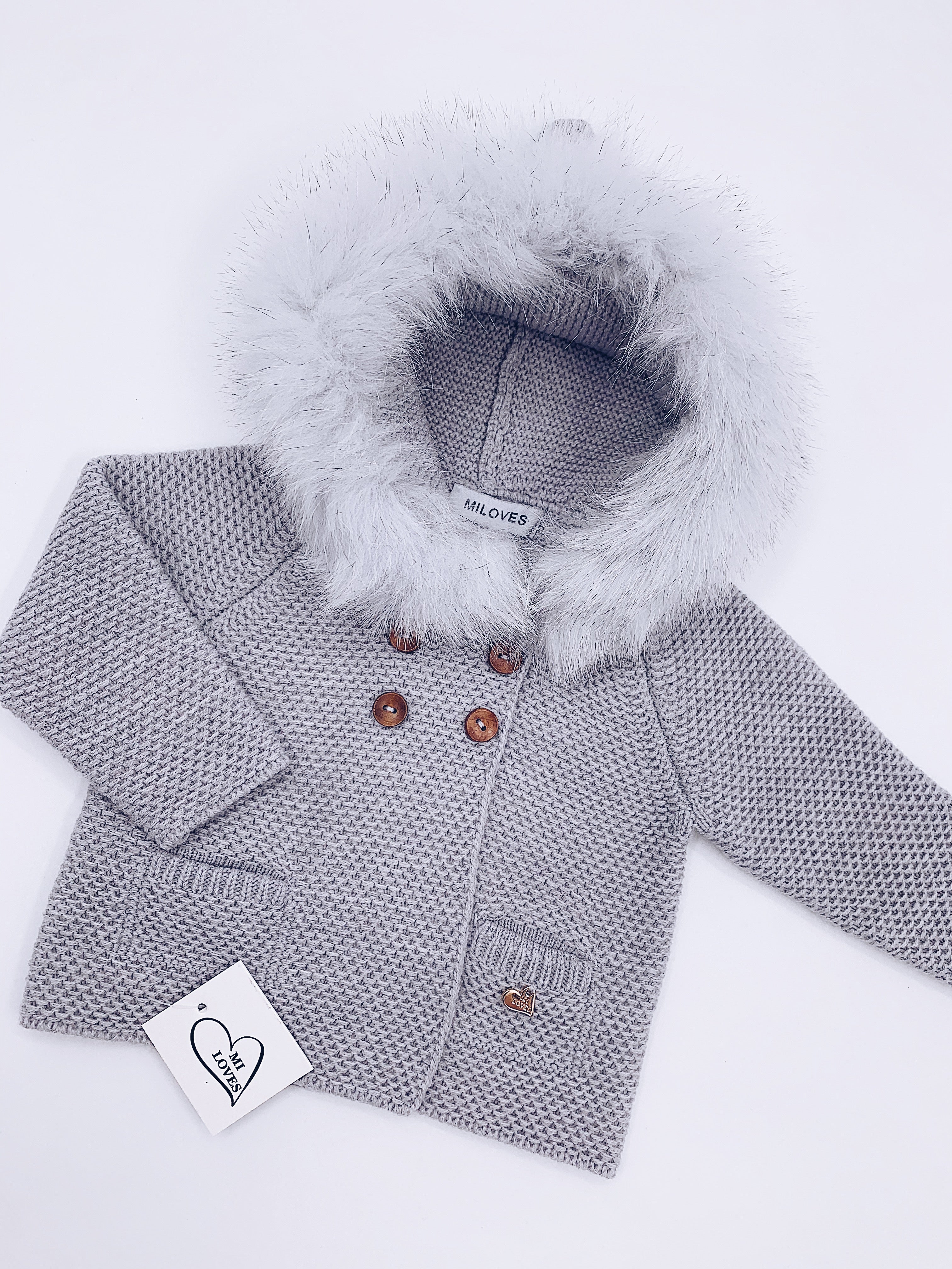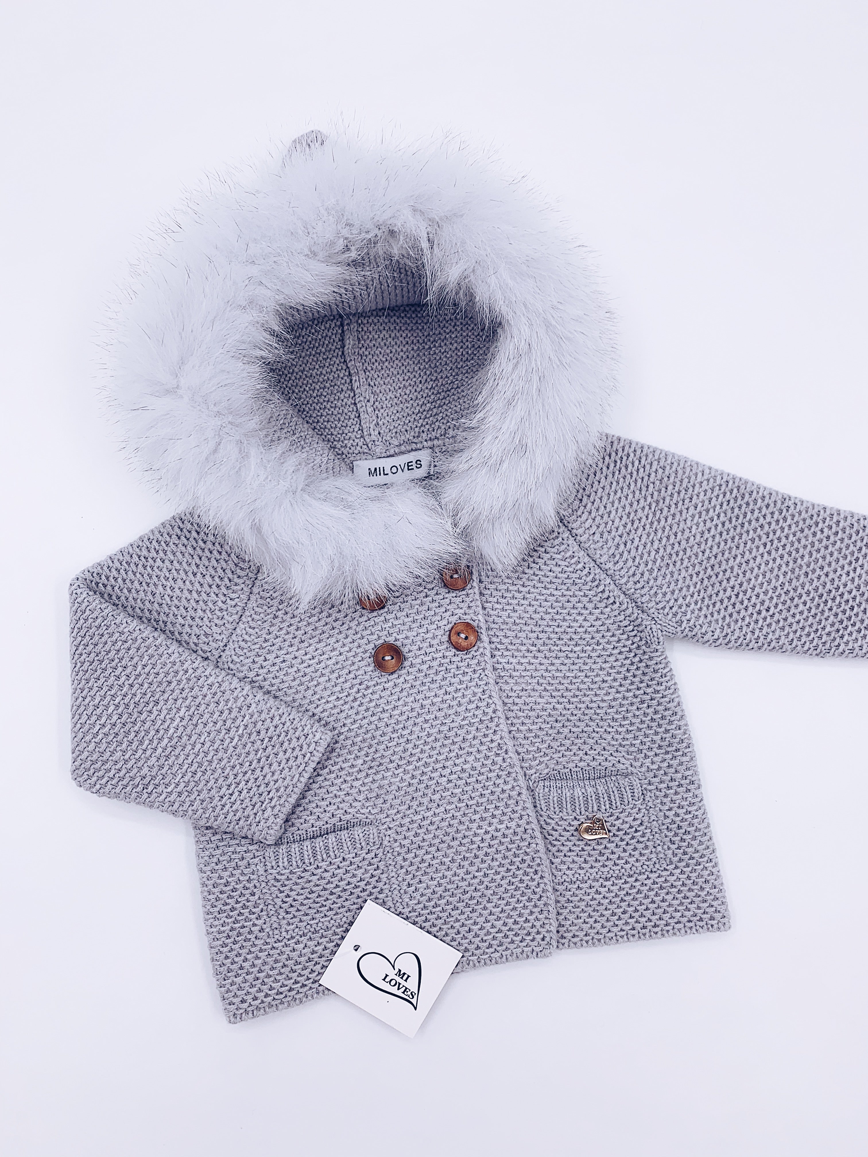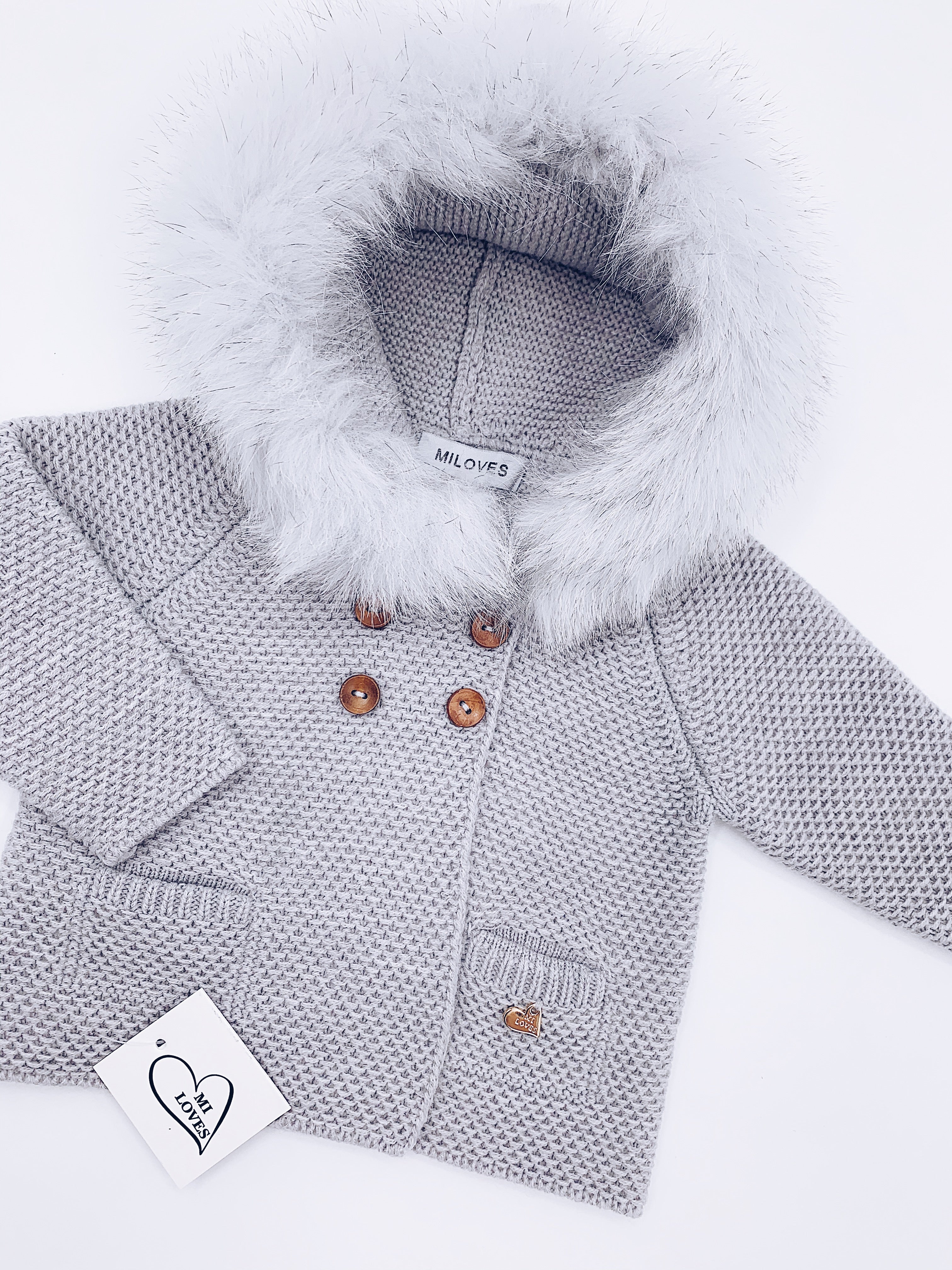 MI LOVES SIGNATURE Luxurious knitted cardigan with fox fur trim in Grey.