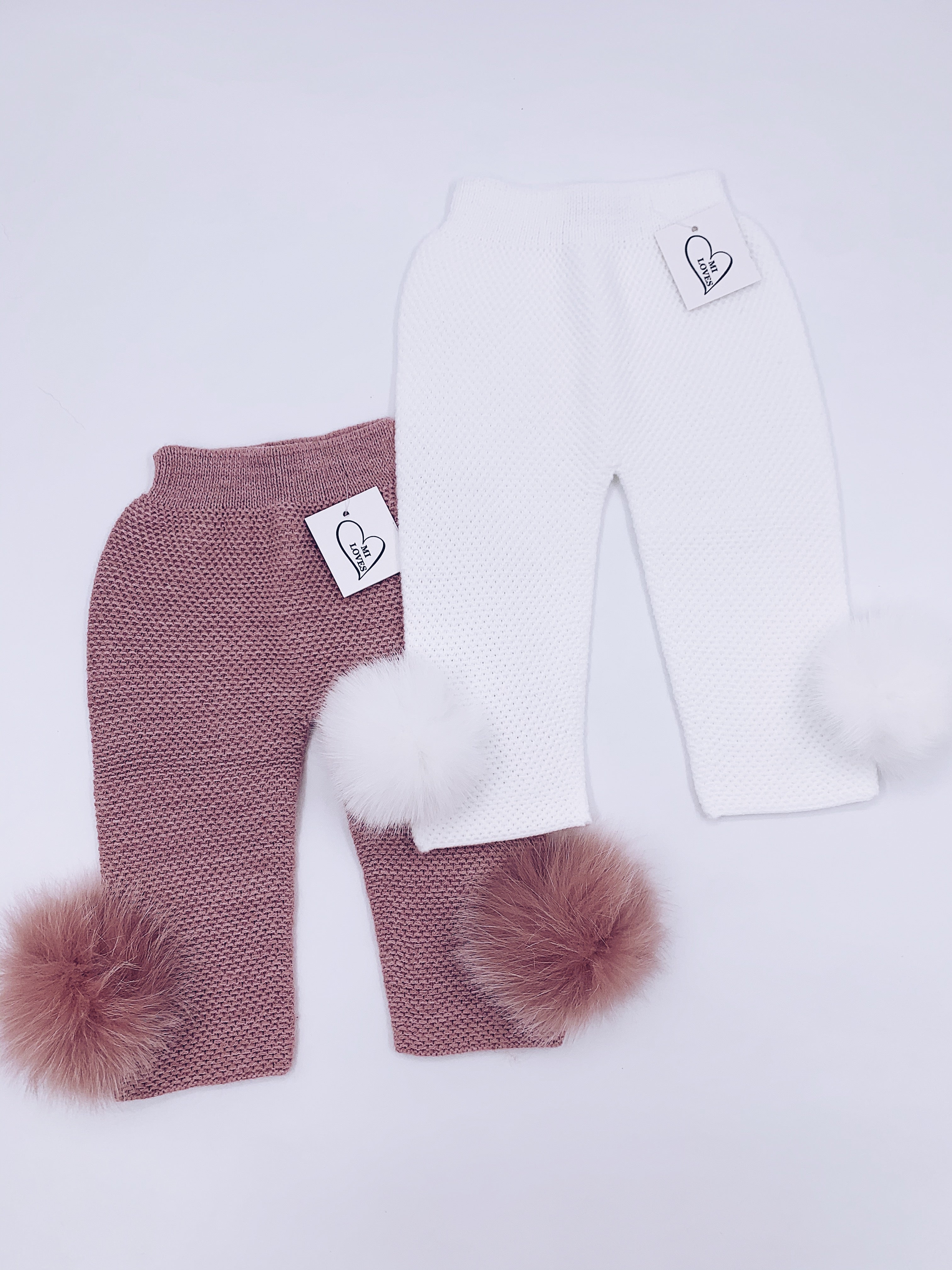 MI LOVES SIGNATURE Luxurious knitted Trousers with fox fur pompoms(ALL COLOURS )