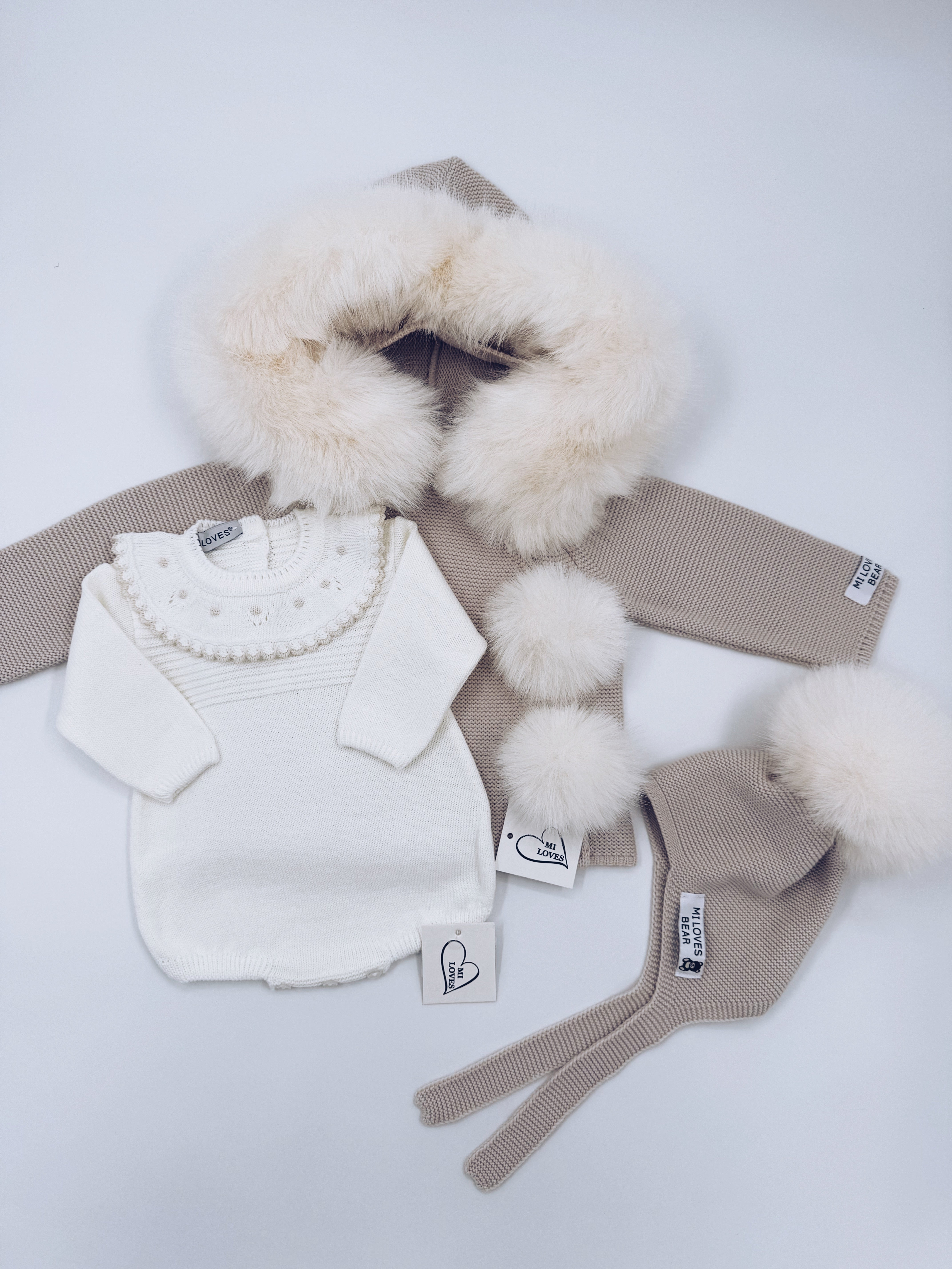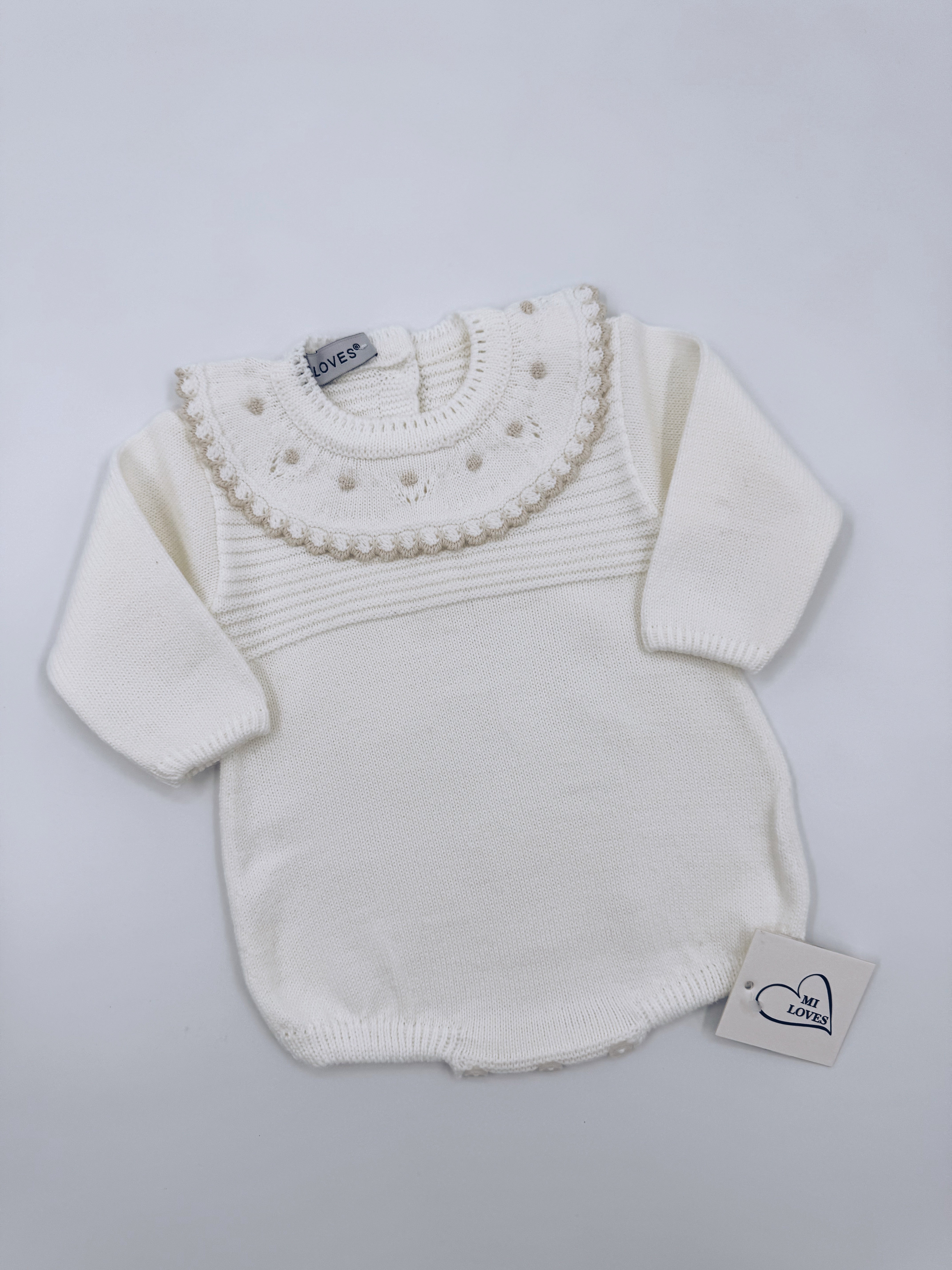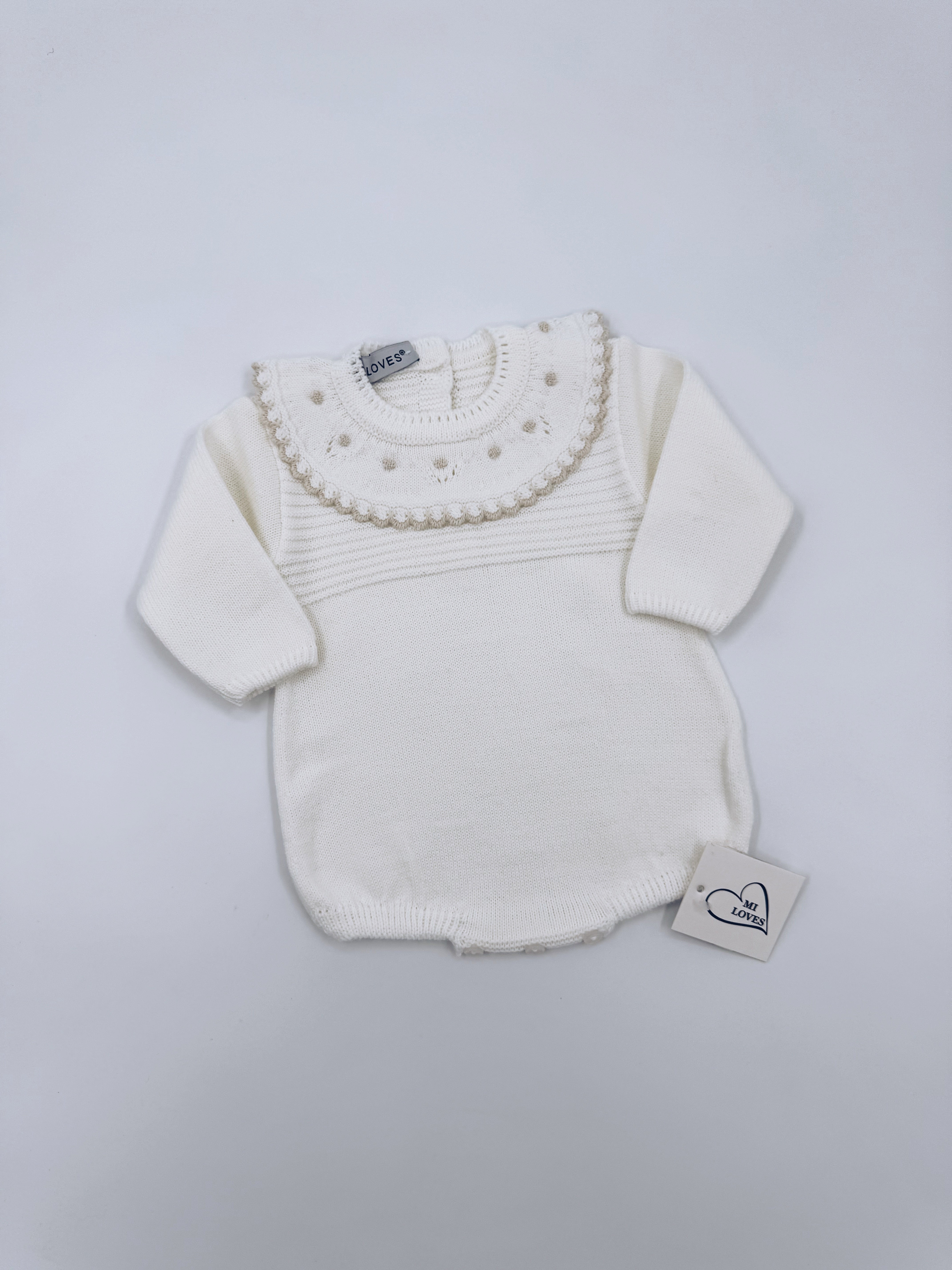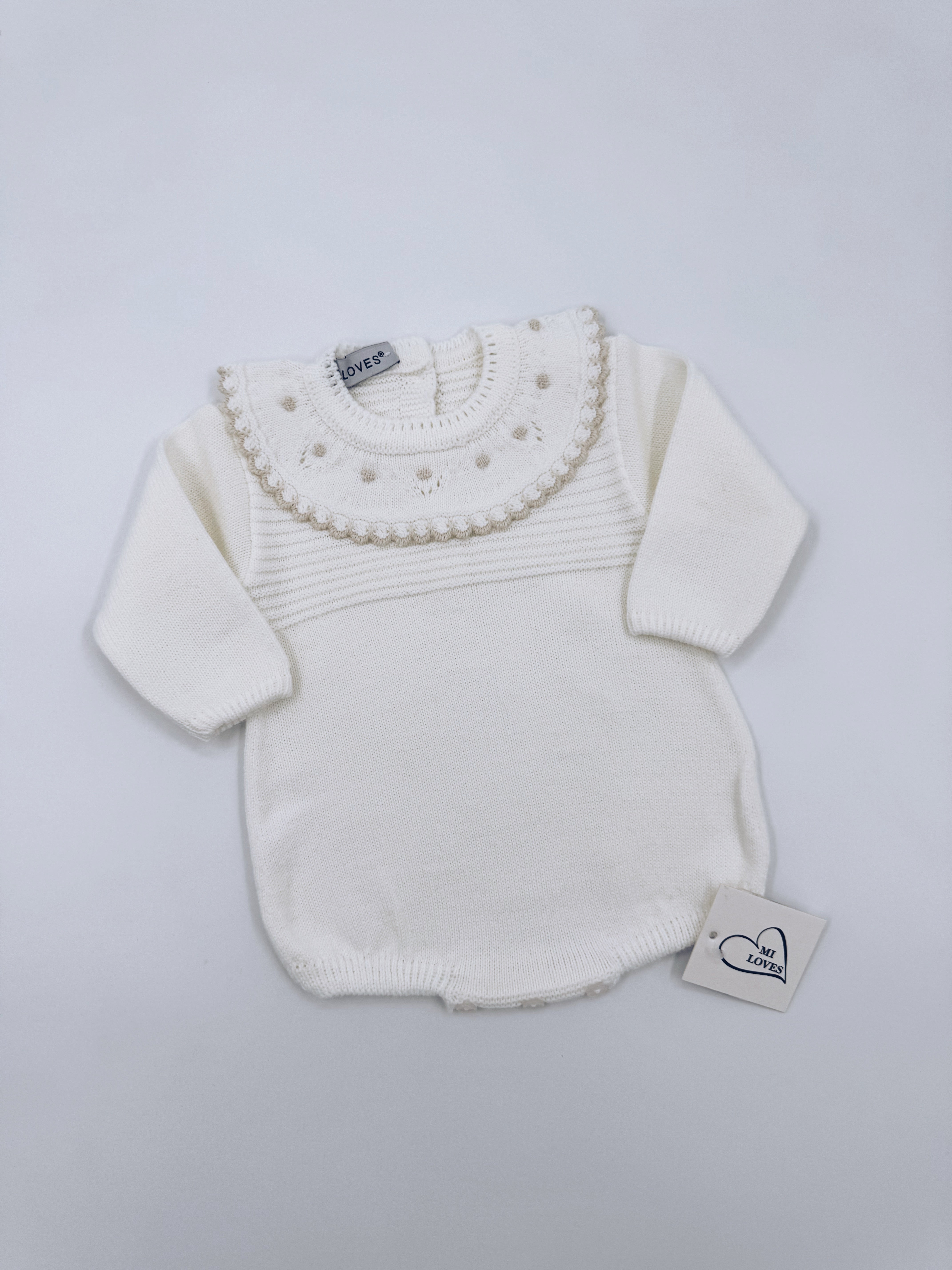 MI LOVES ivory knitted baby romper with cream trim on the frill
