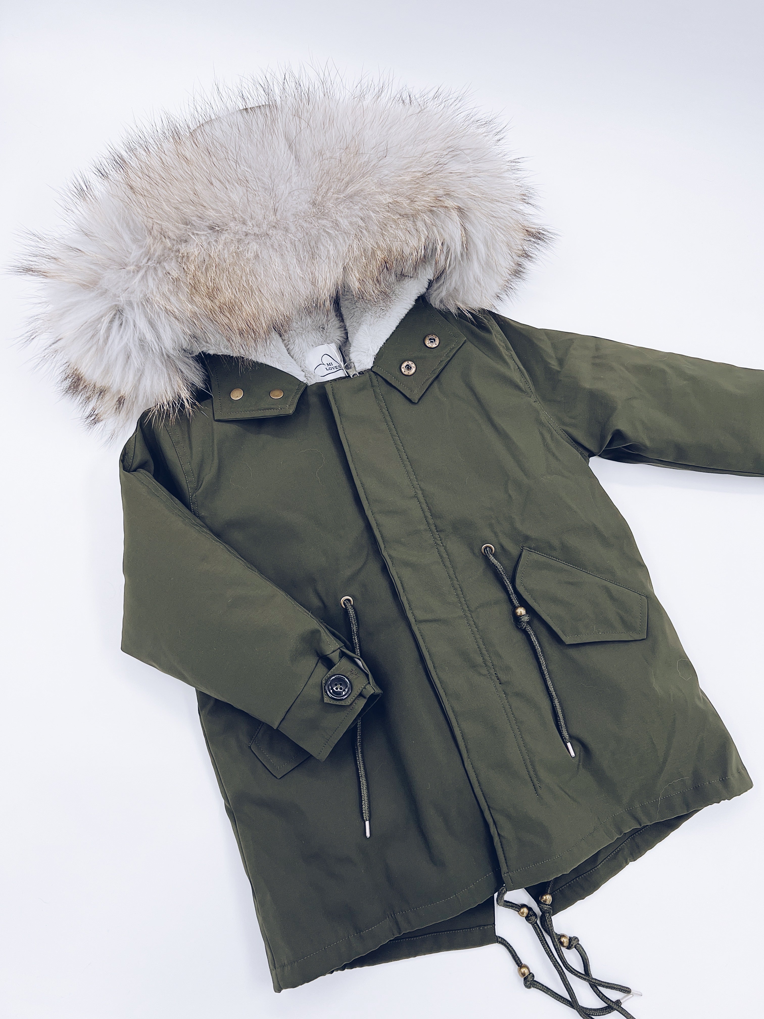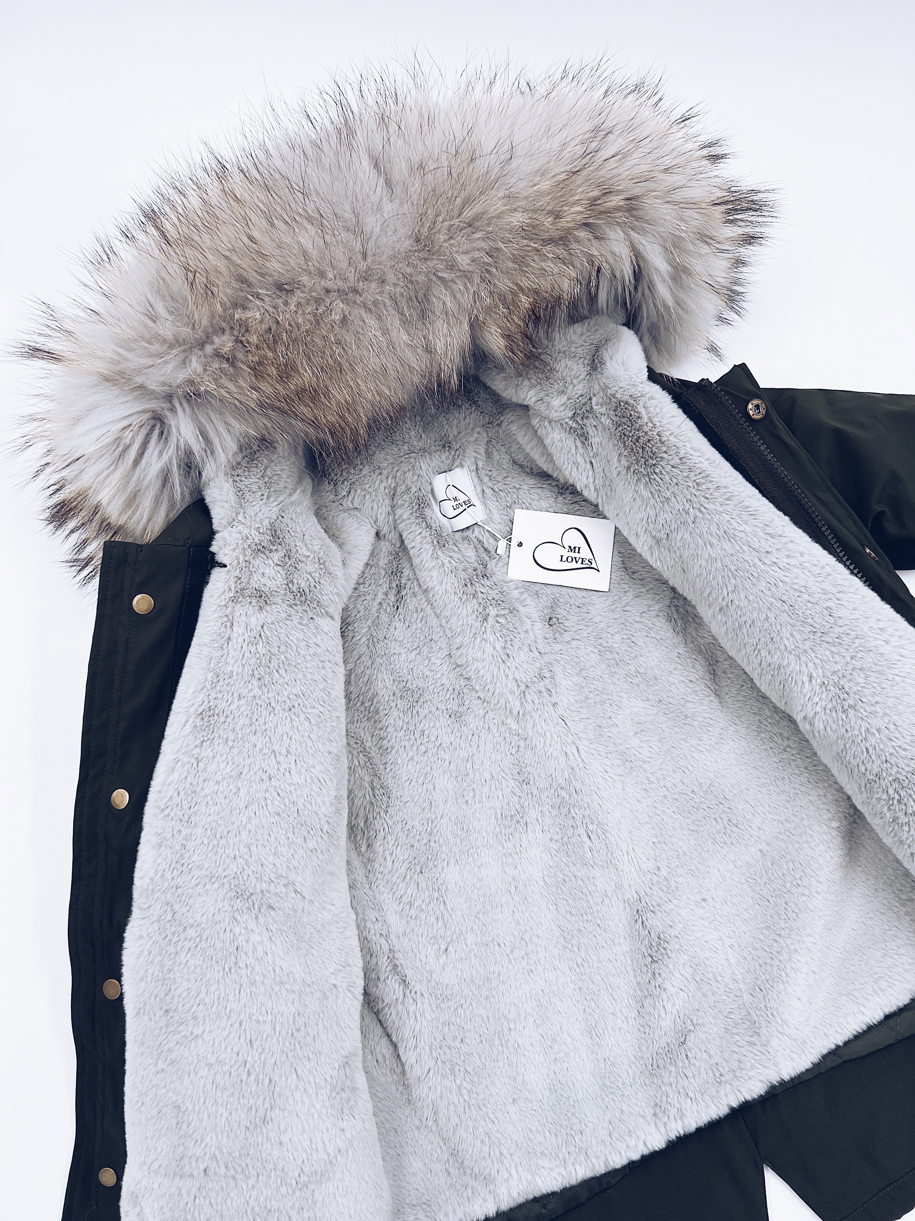 MI LOVES SIGNATURE Khaki Green parka jacket with Luxurious Grey Racoon Fur trim and Synthetic fur lining though out the whole body for extra warmth!Beautiful Luxury Fur trim and lining can be detached if weather get warmer!!