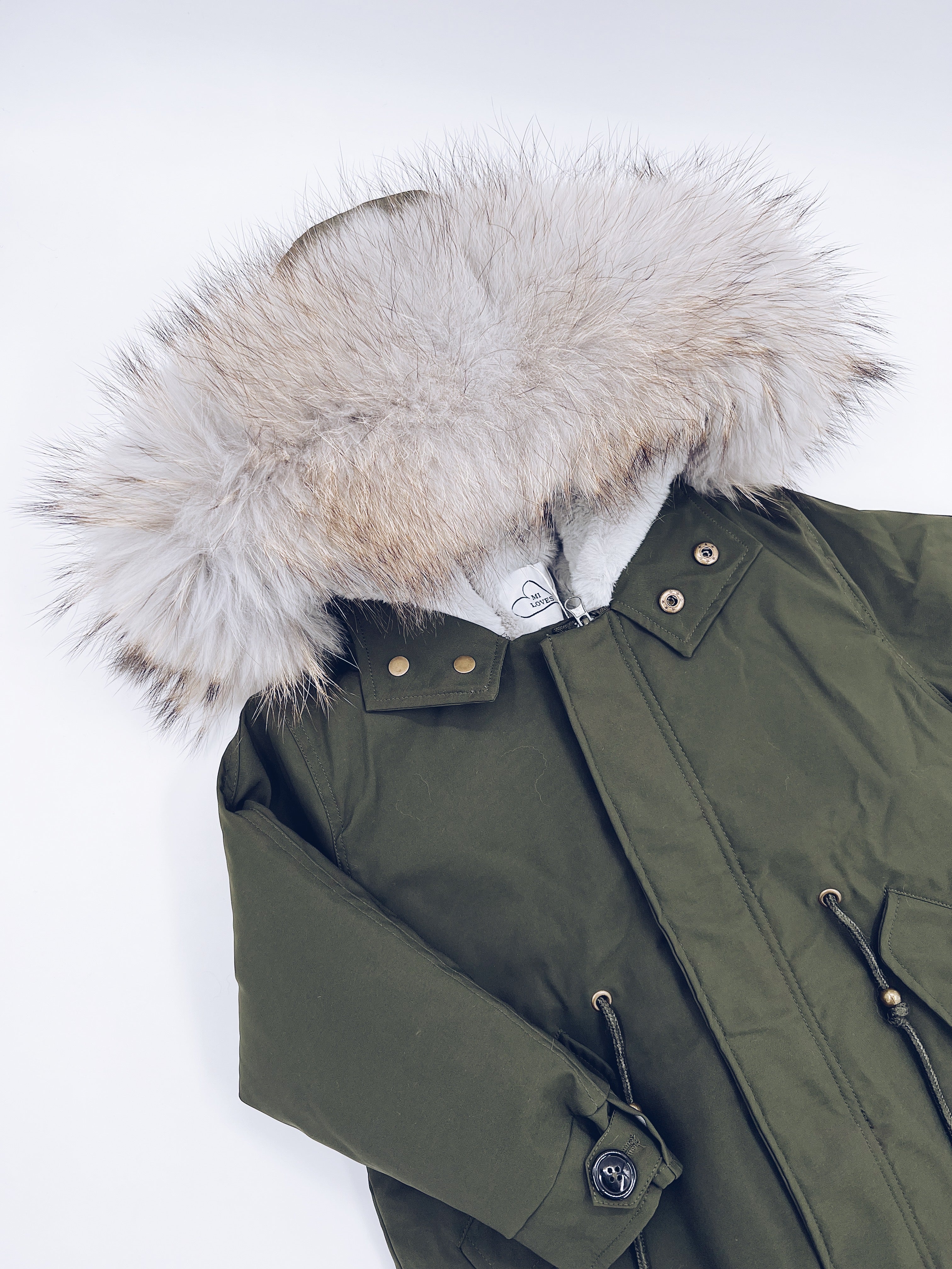 MI LOVES SIGNATURE Khaki Green parka jacket with Luxurious Grey Racoon Fur trim