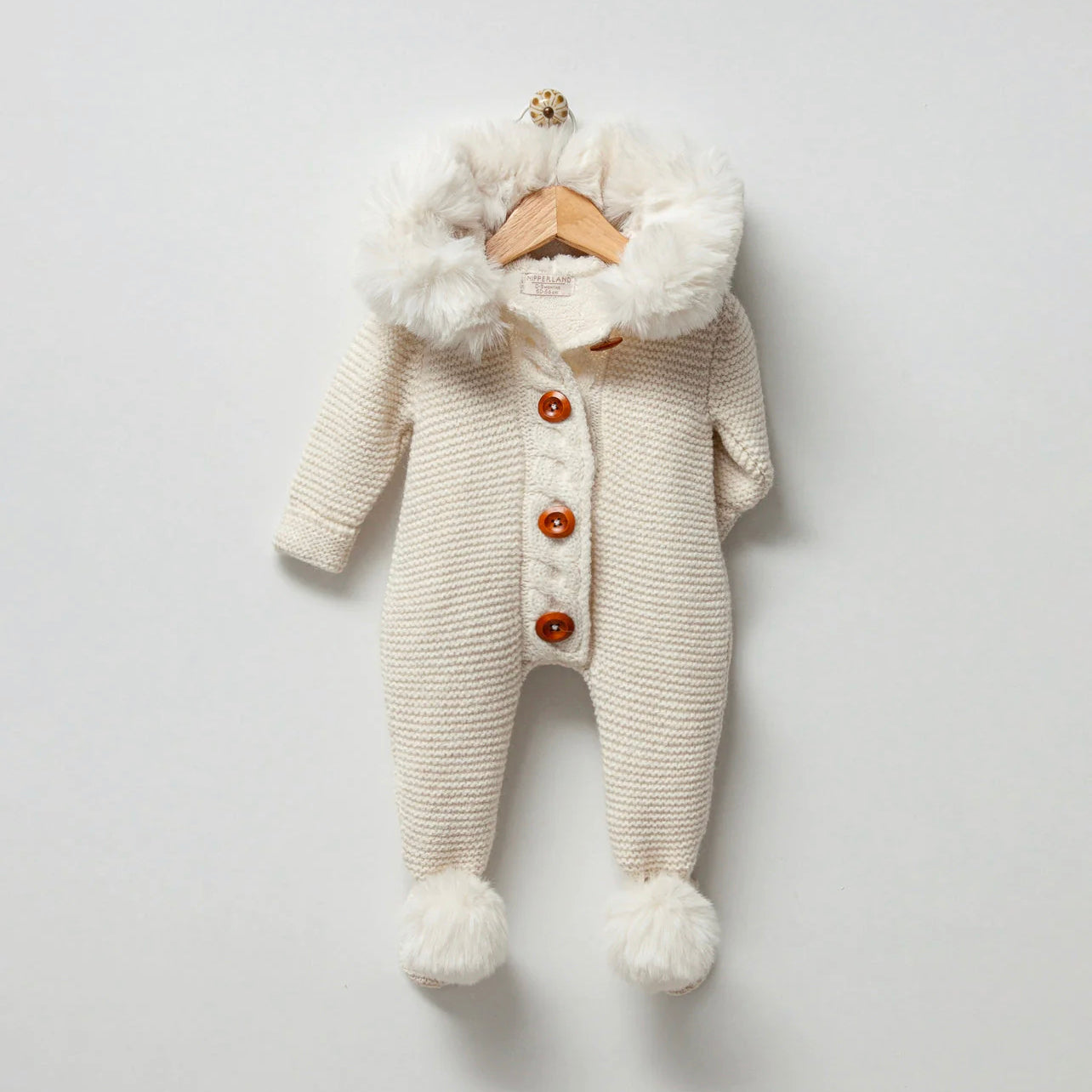 Ivory Knitted Pramsuit with Synthetic fur trim/pompoms.