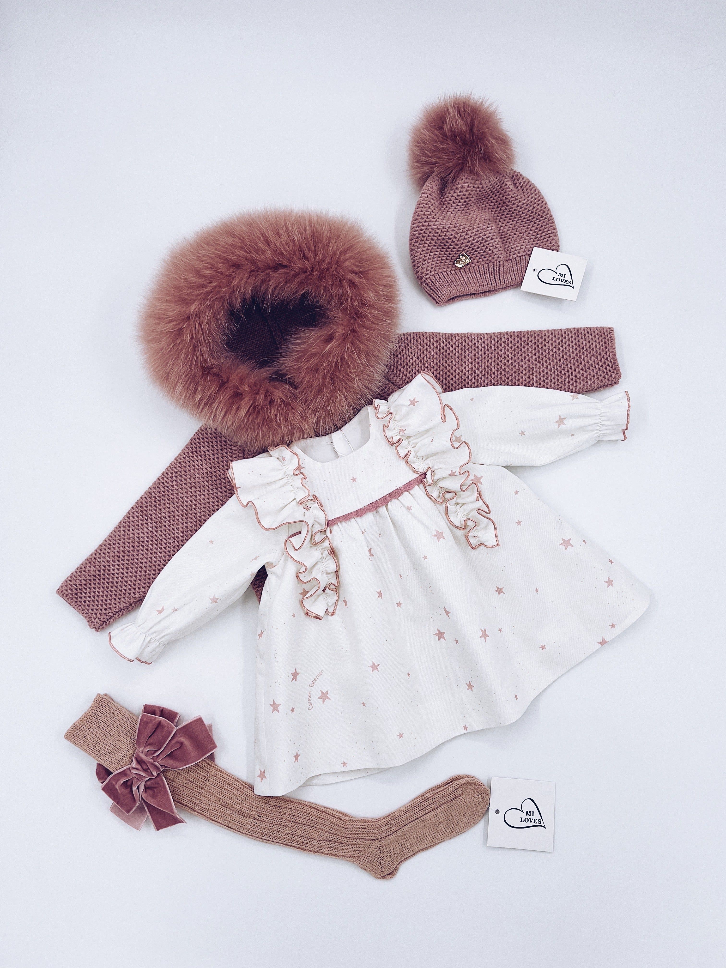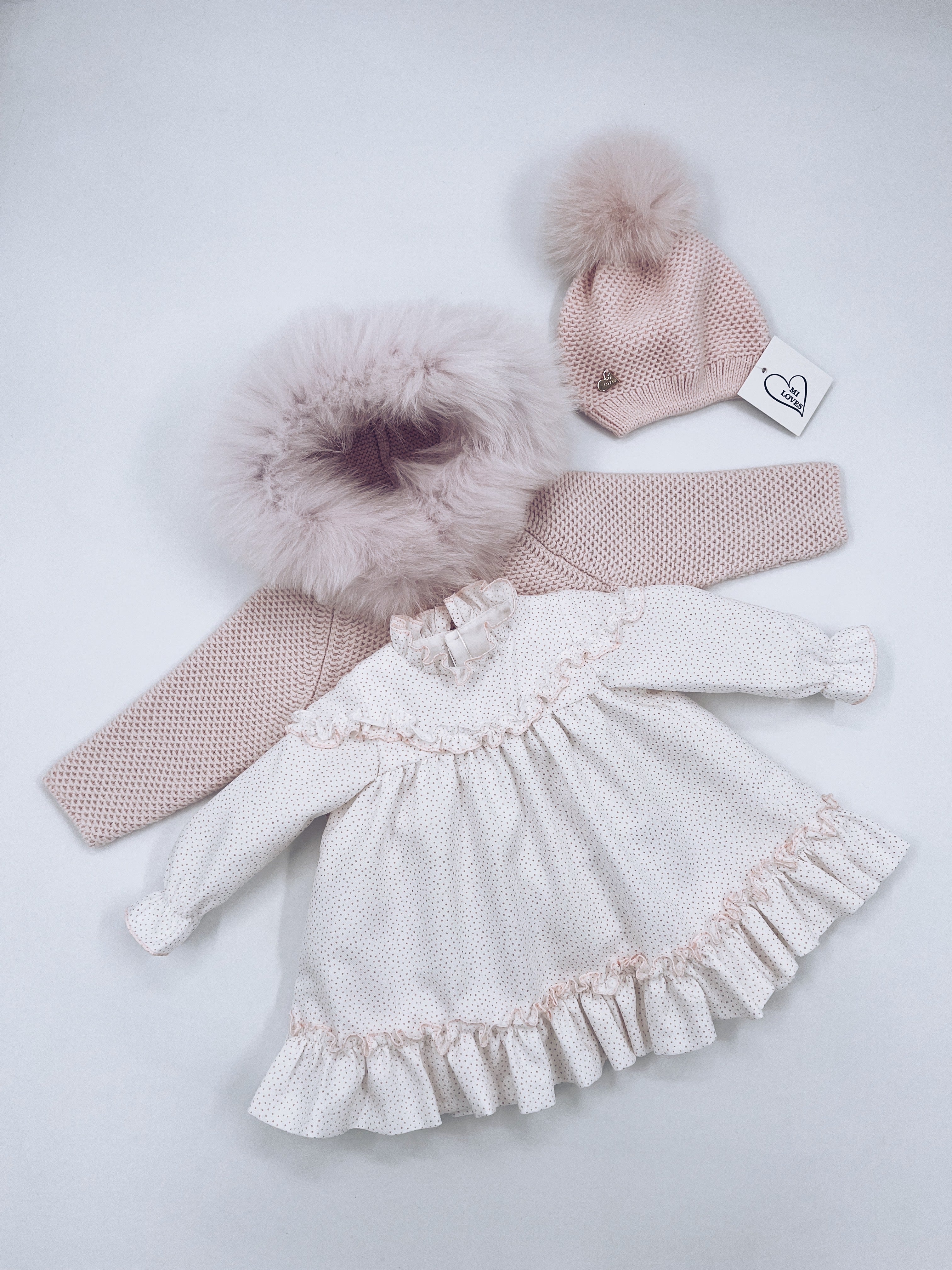 Beautiful Knitted Baby pink 3 piece set with frill details.