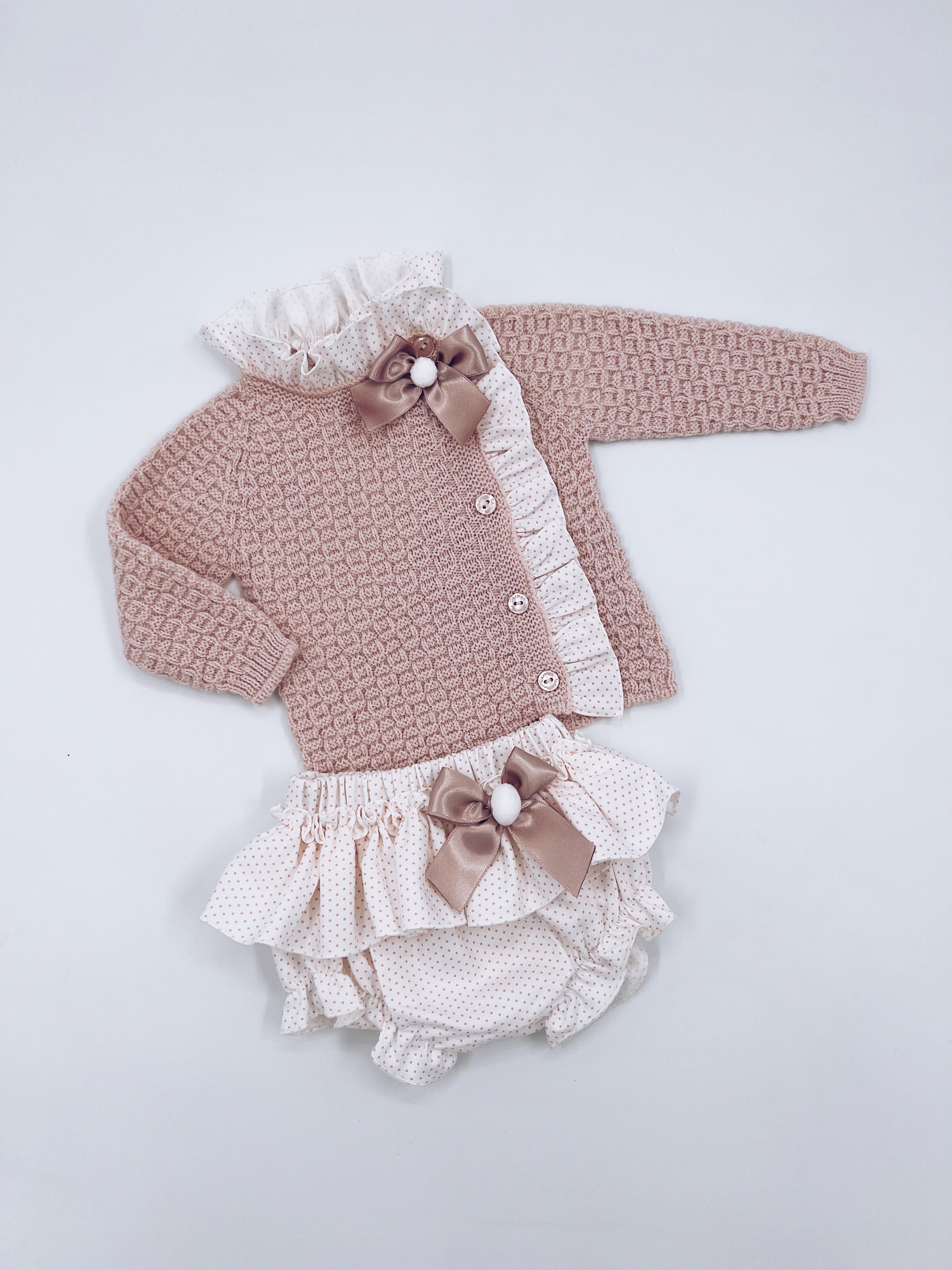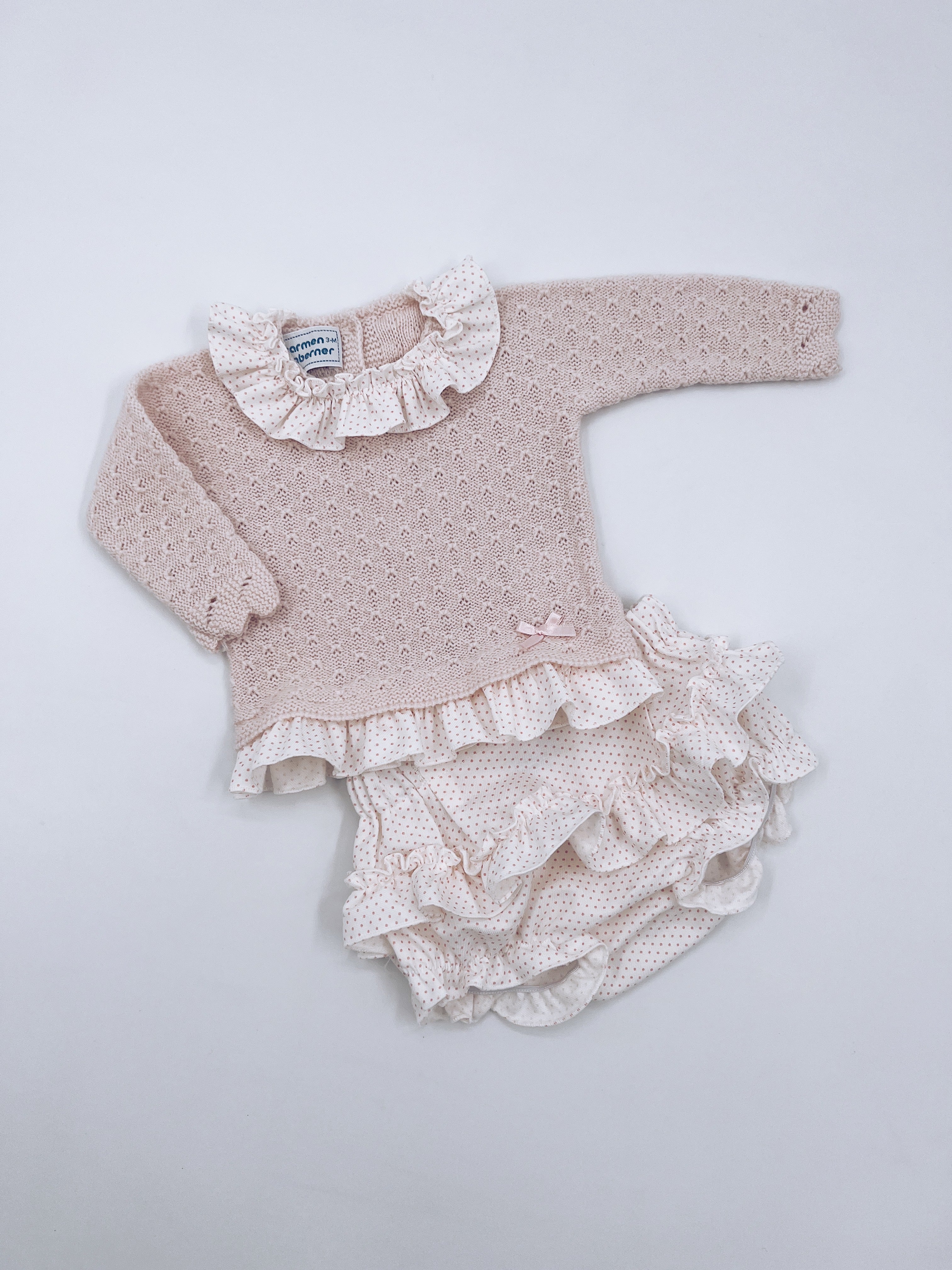 Beautiful Knitted top and bloomers 2 piece set with bow and frill details.