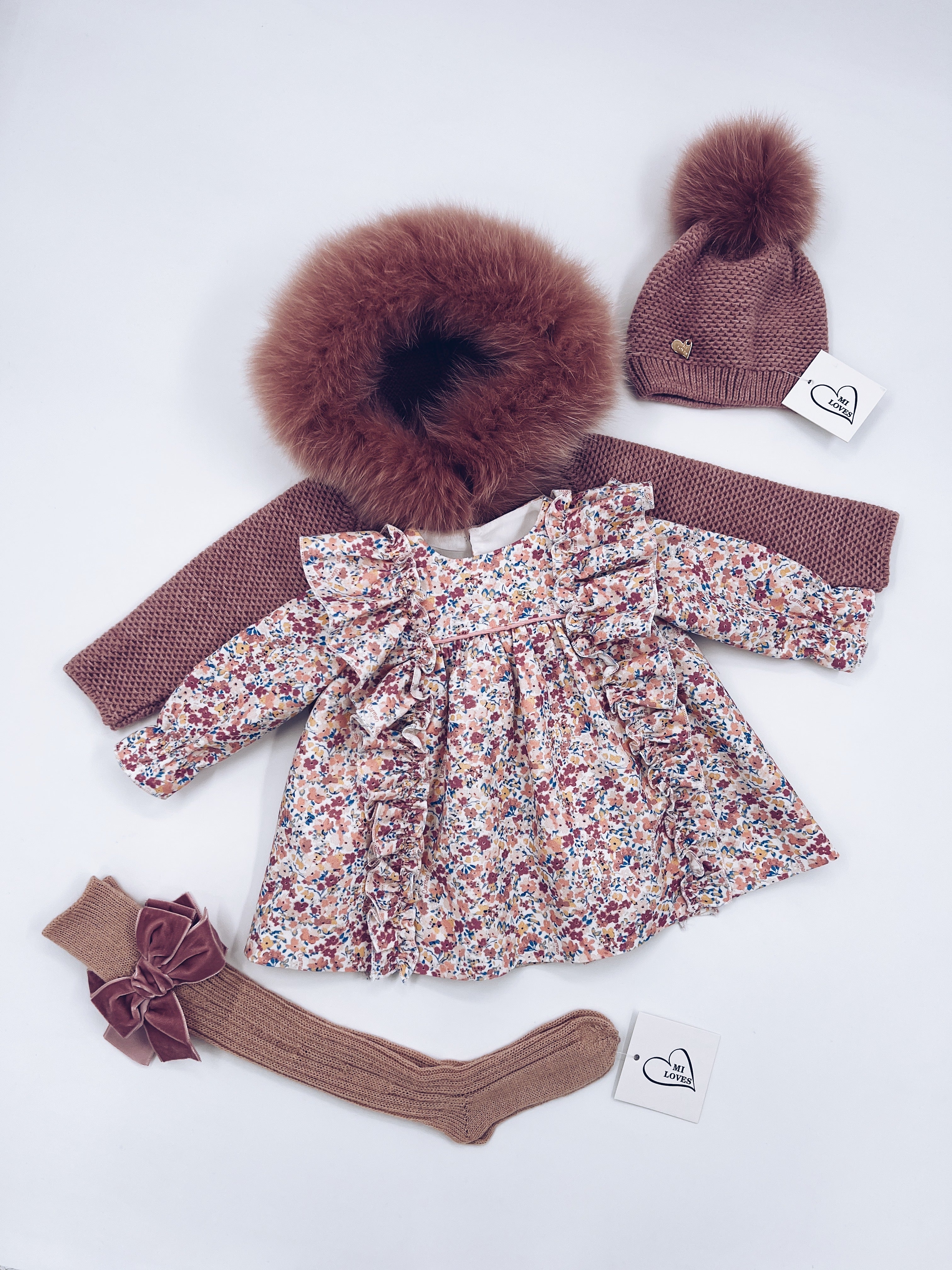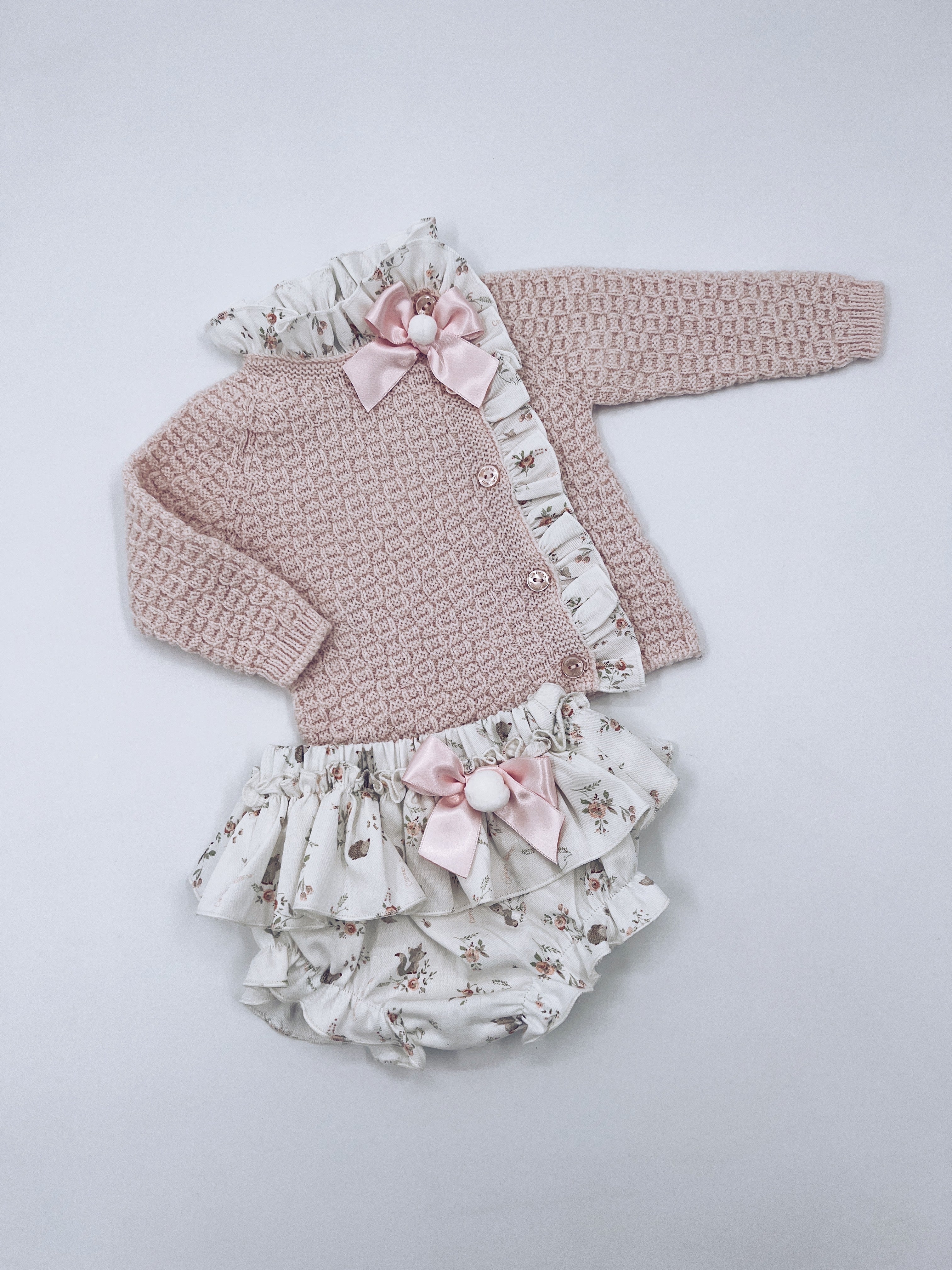 Beautiful Knitted top and floral print bloomers 2 piece set with bow and frill details.