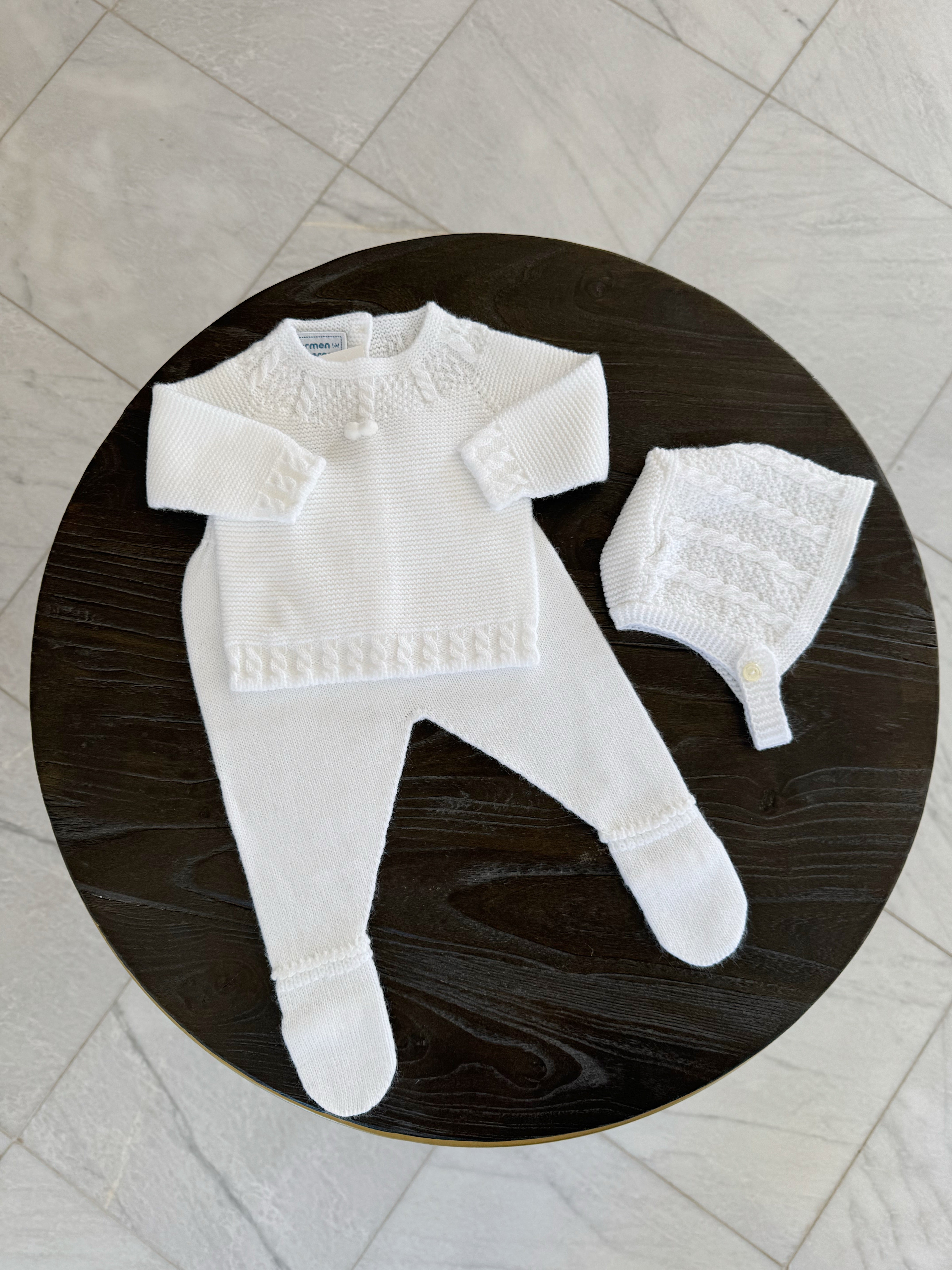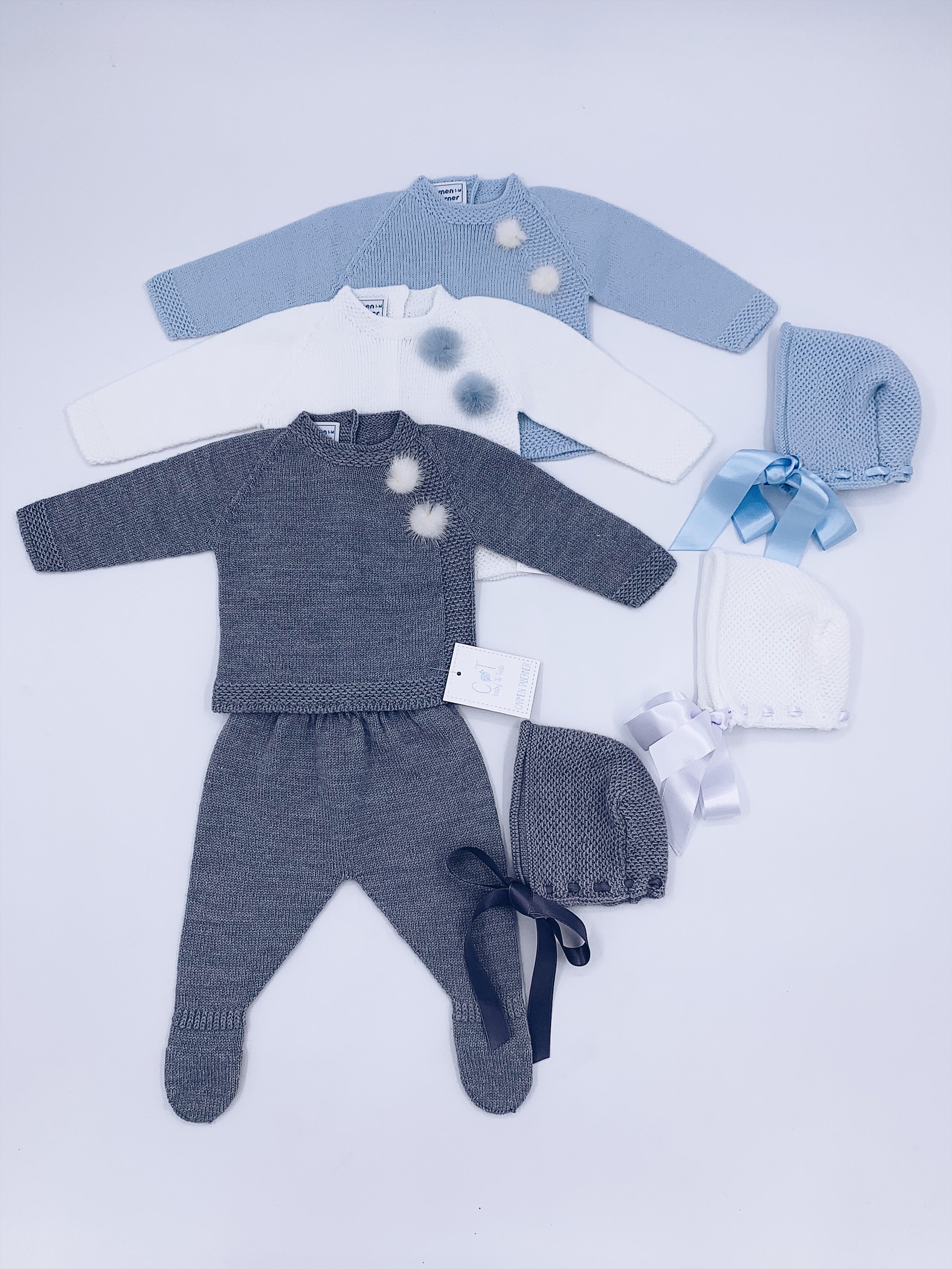 Beautiful Carmen Taberner baby knitted 3 piece set with pom-poms