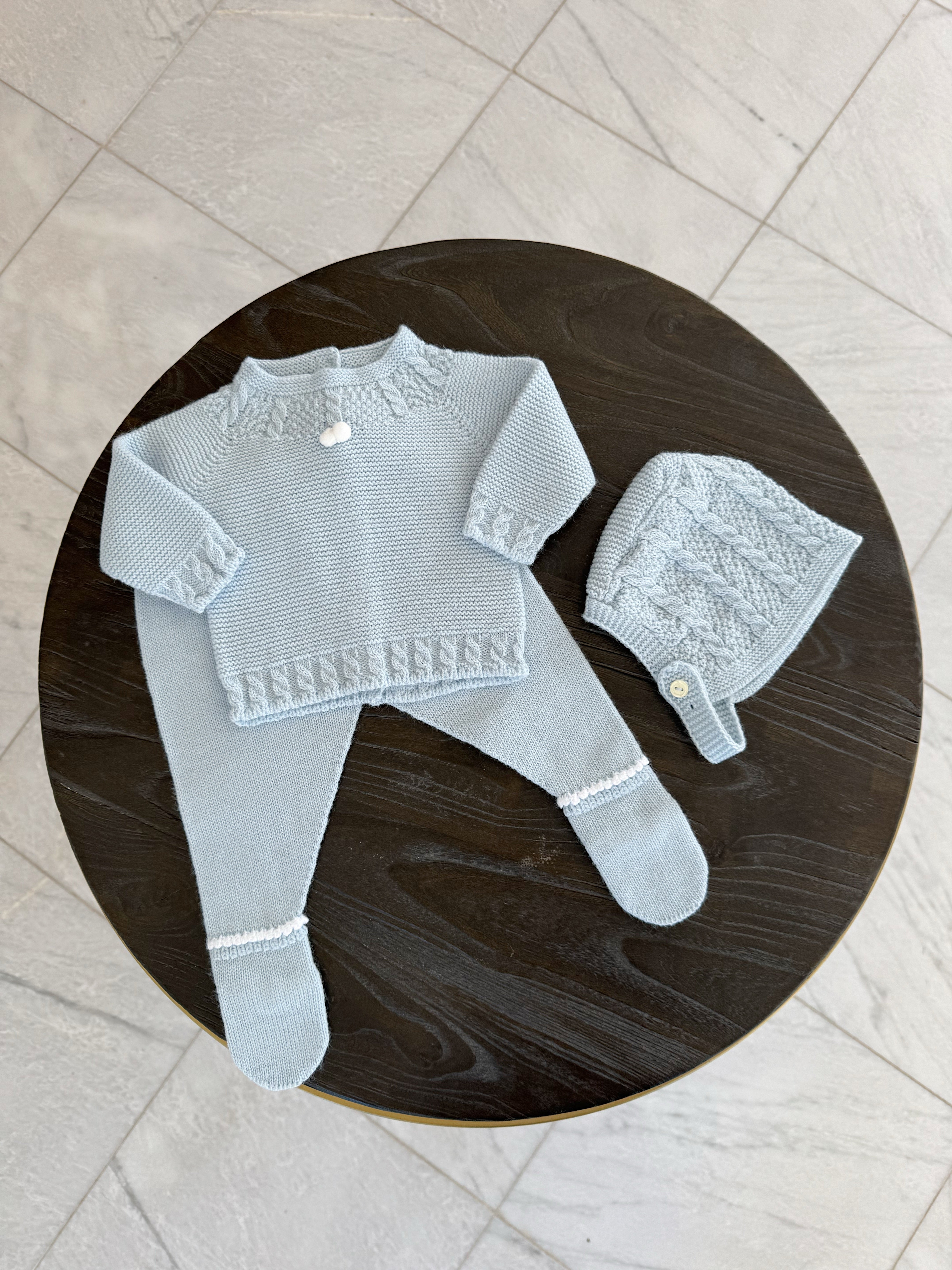 Beautiful Knitted 3 piece set with bow and pom-pom details