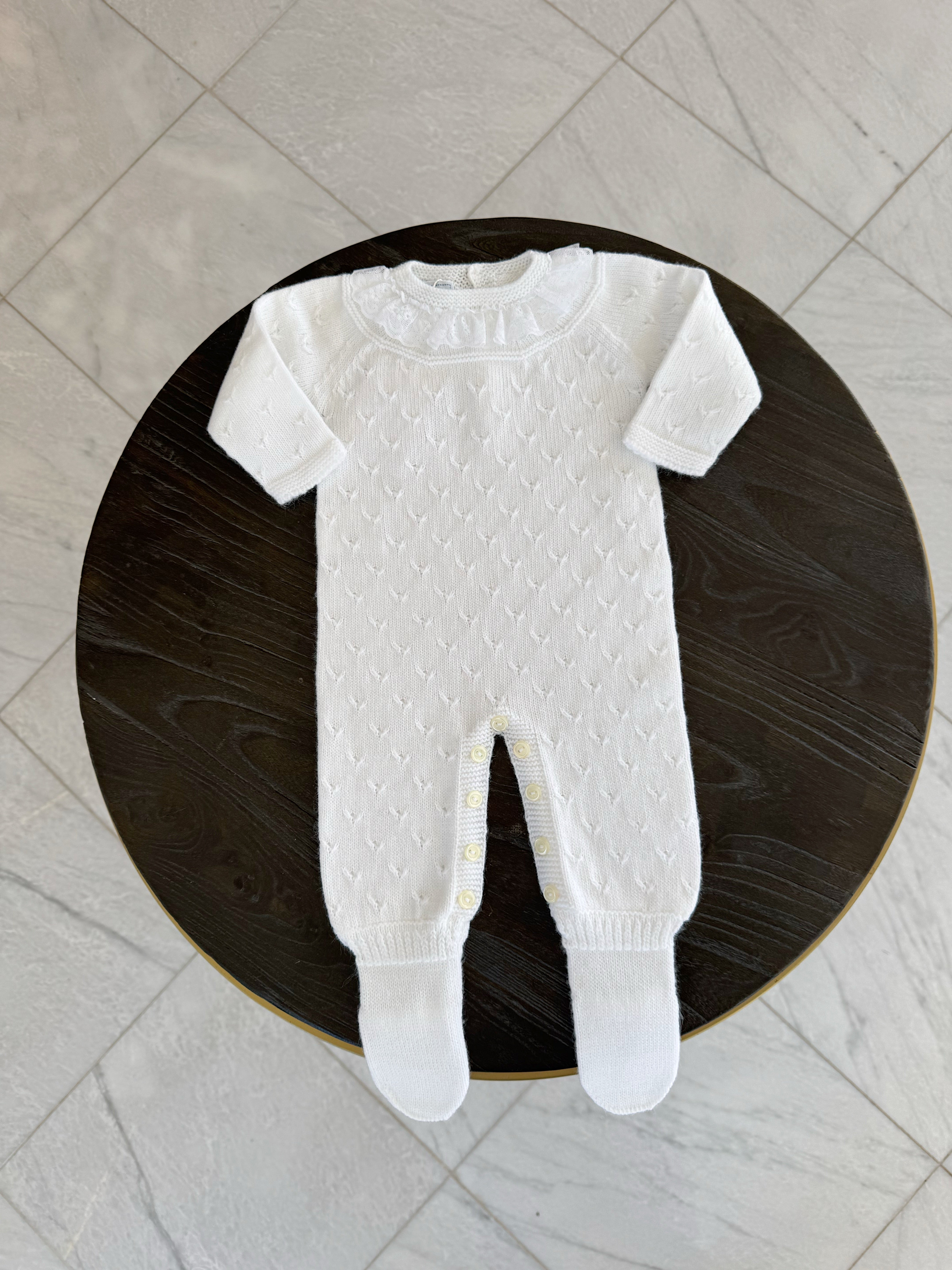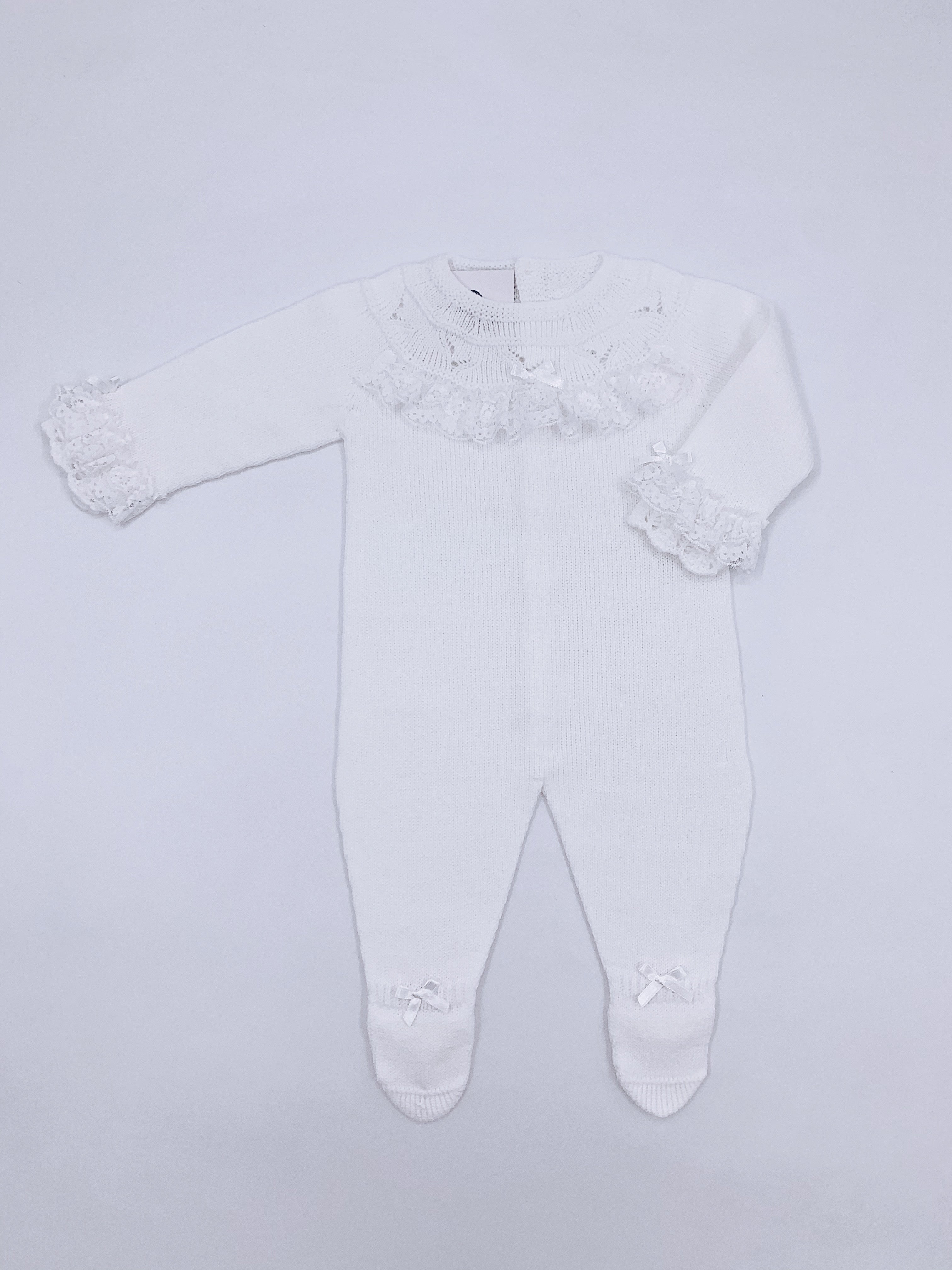 Beautiful Knitted ivory knitted baby grow with lace details.