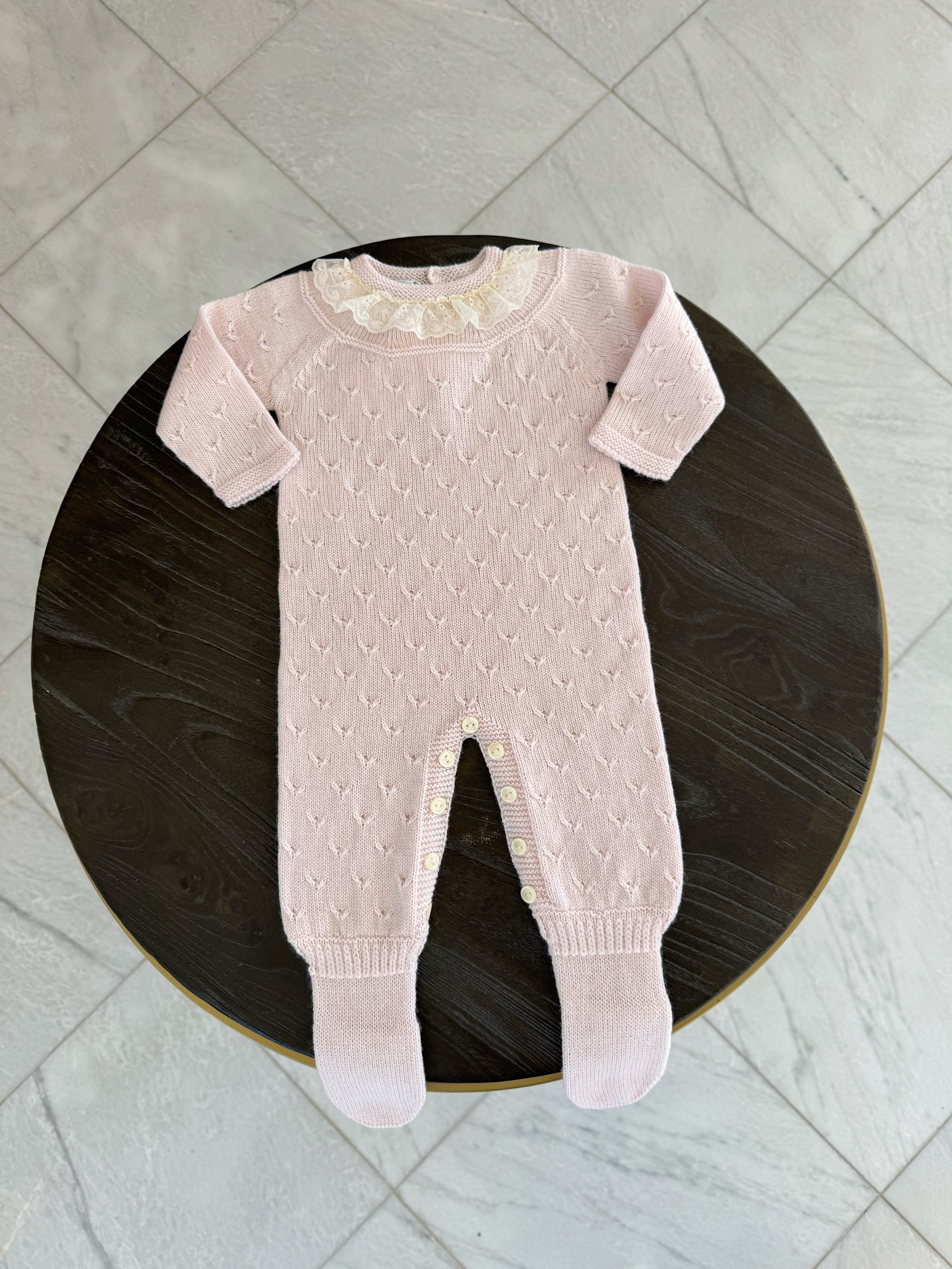 Beautiful Knitted Pink knitted baby grow with lace details.
