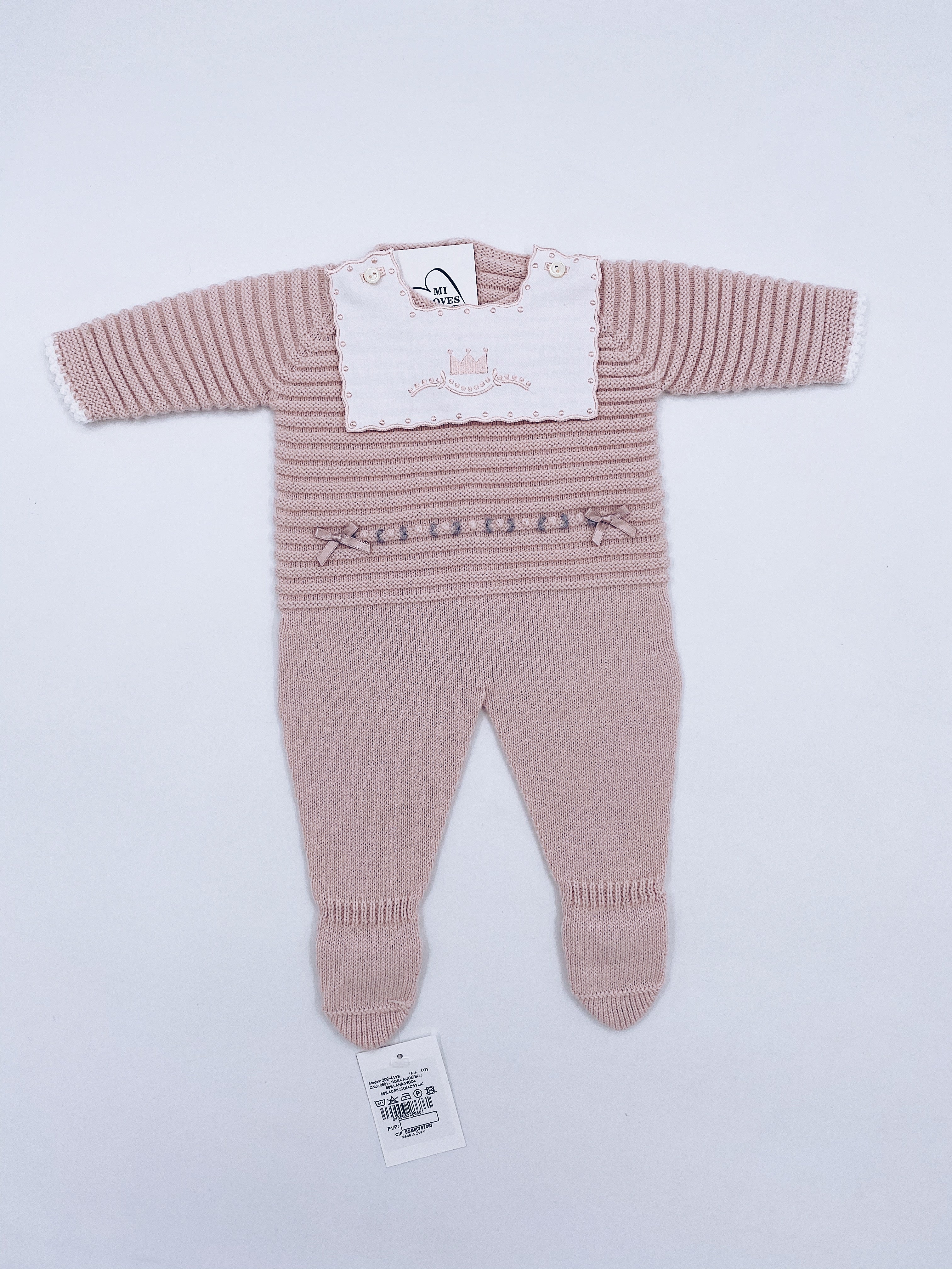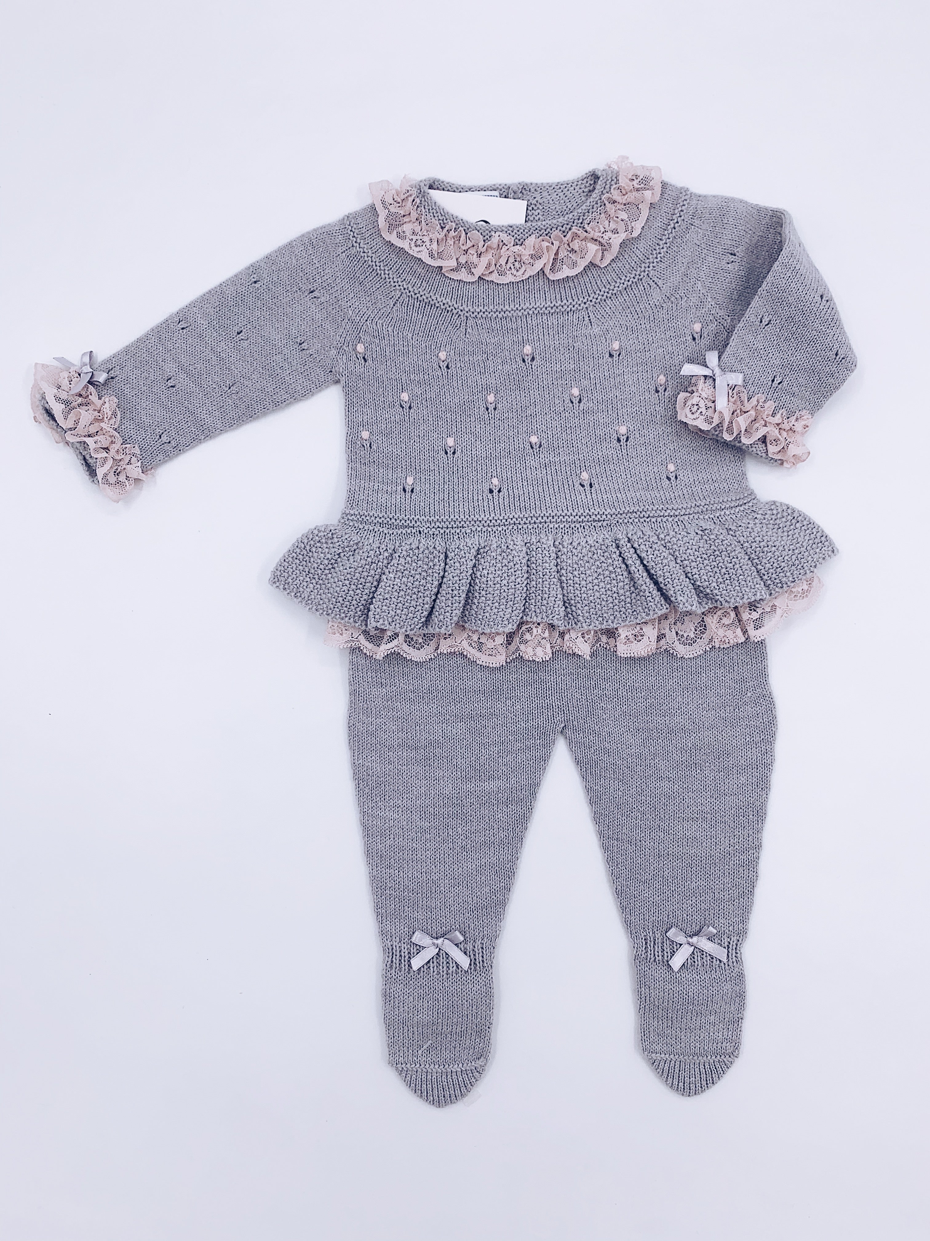 Beautiful grey knitted babygrow with Dusty pink lace and bow details