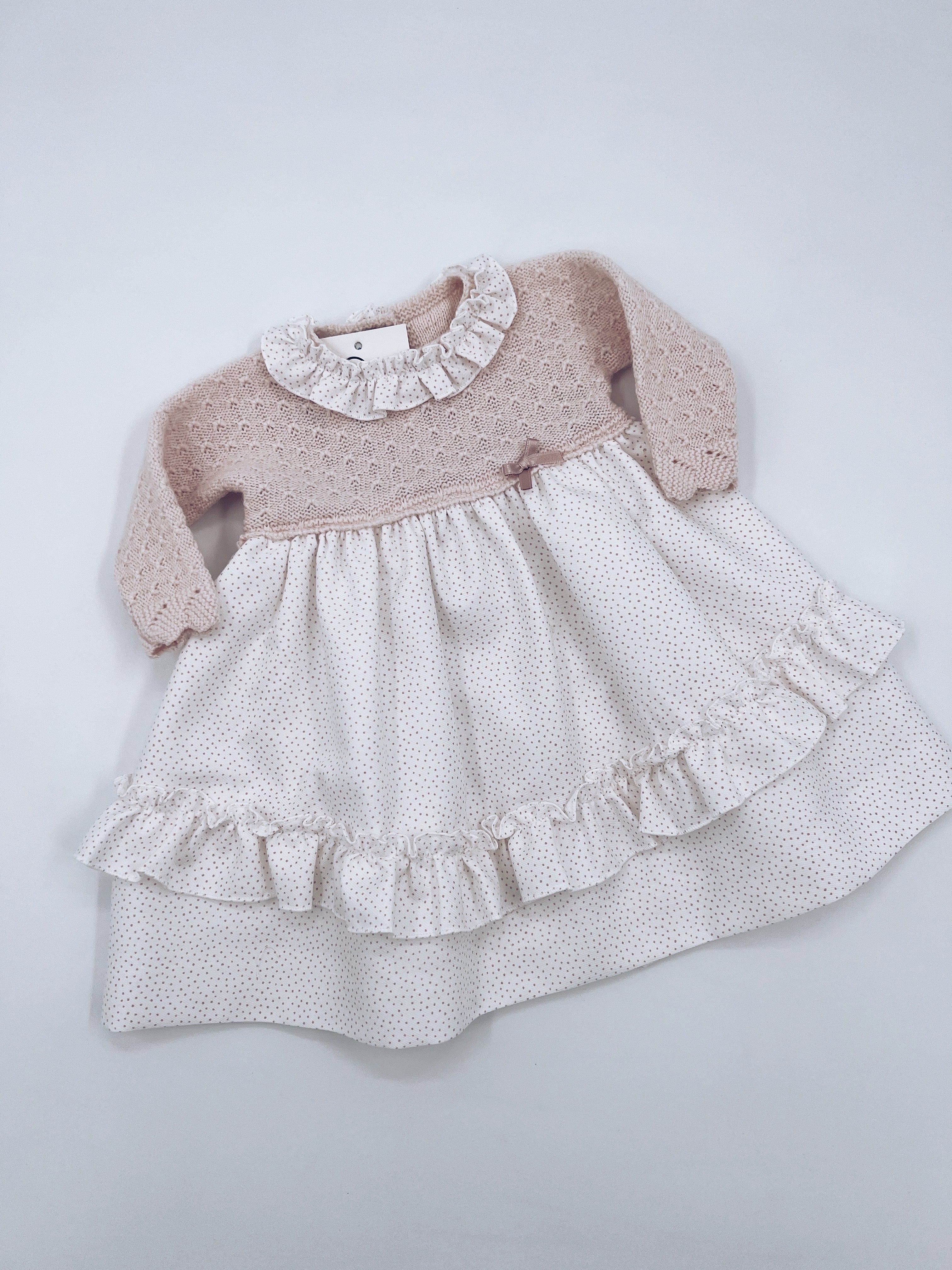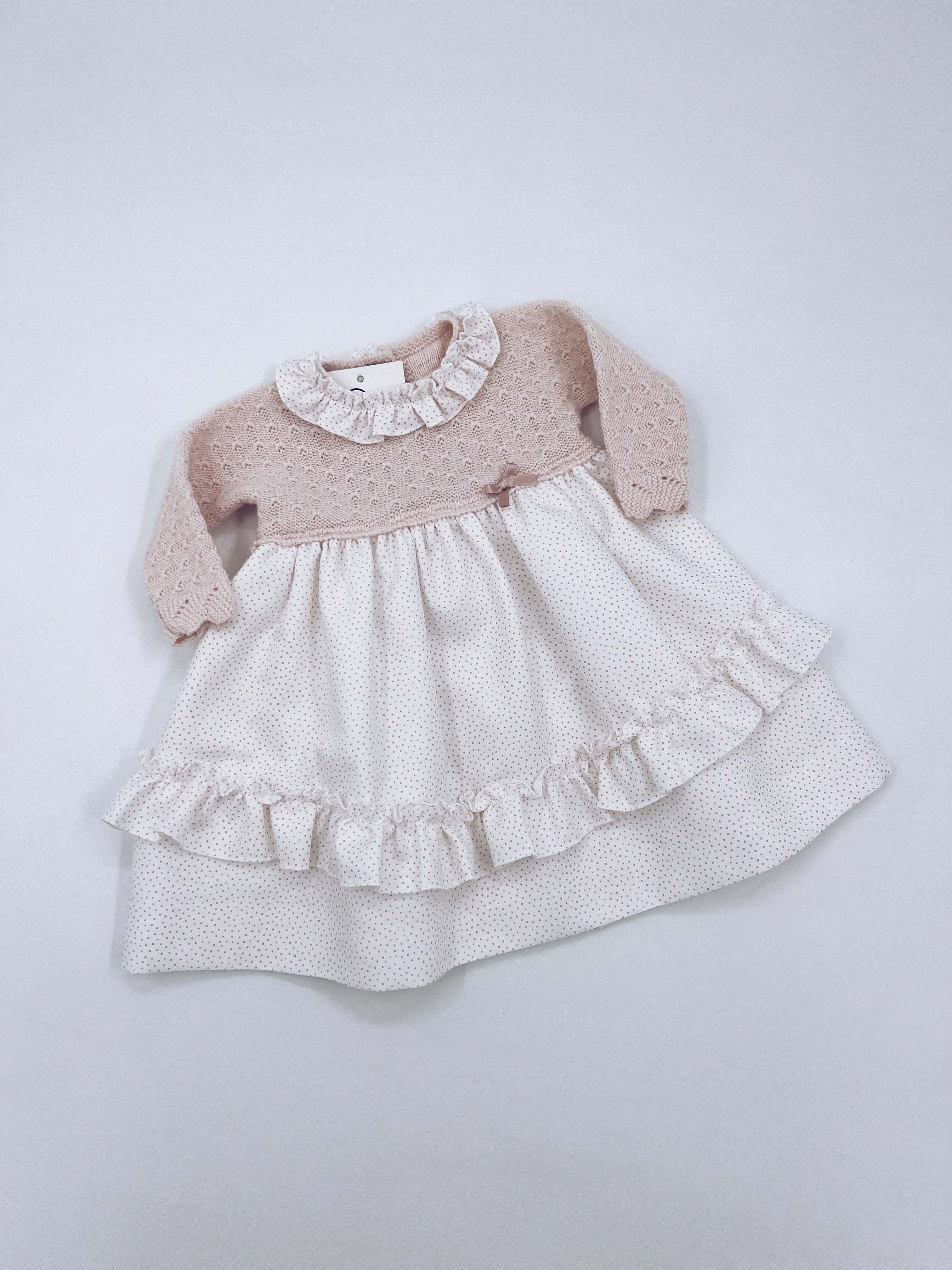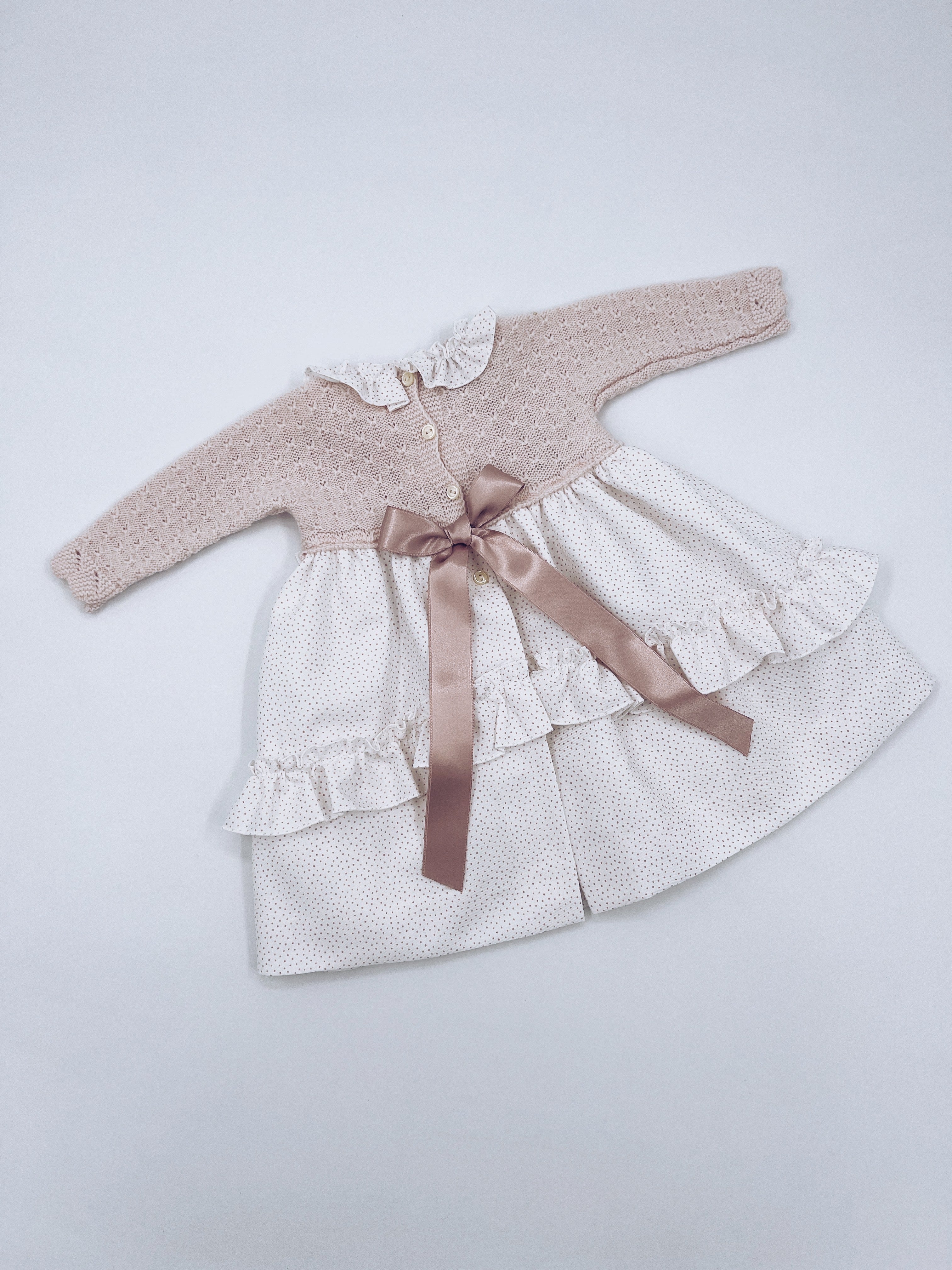 Beautiful Pink and Ivory Polka dot print dress with Dusty Pink Bow details on the back.