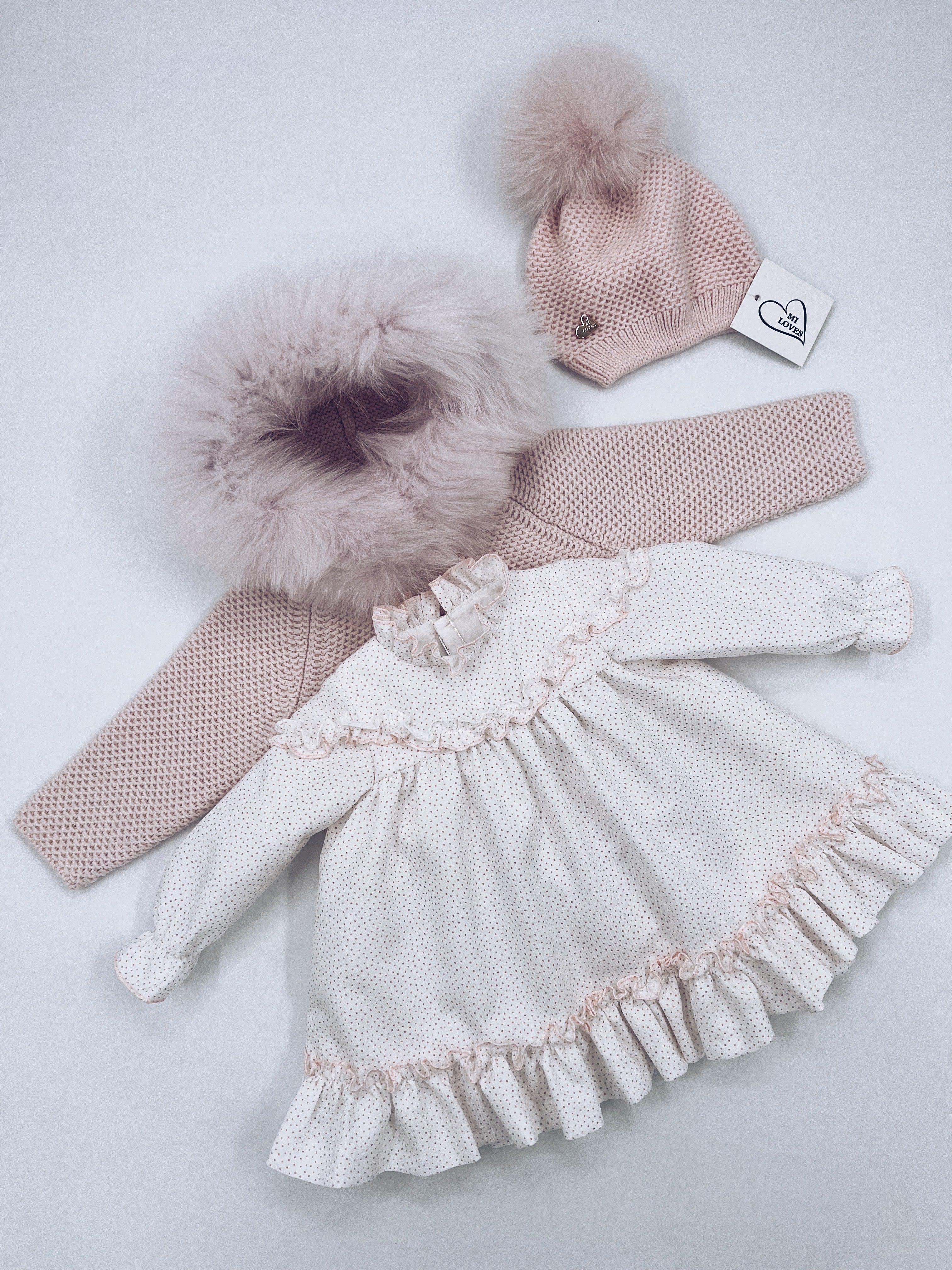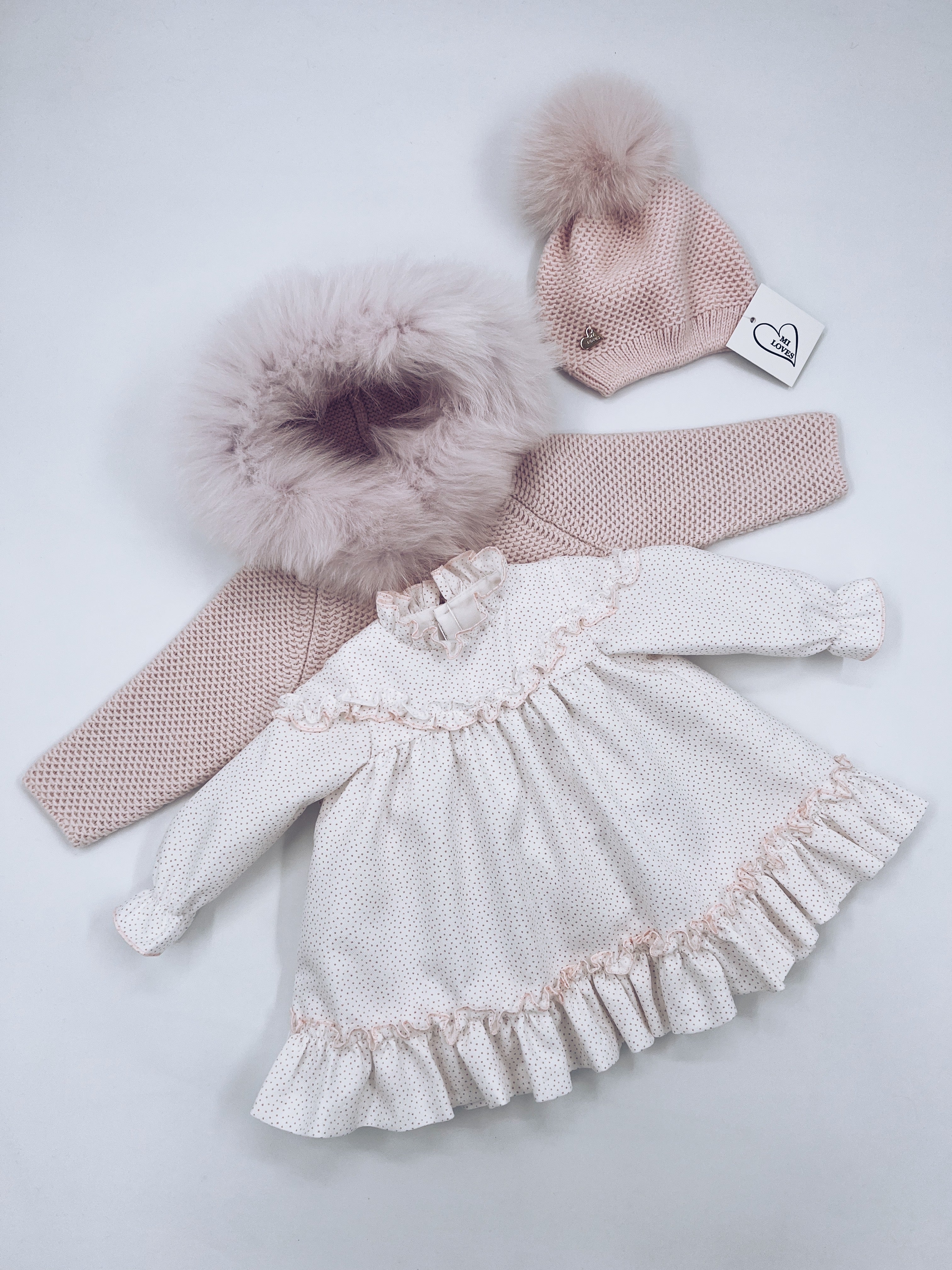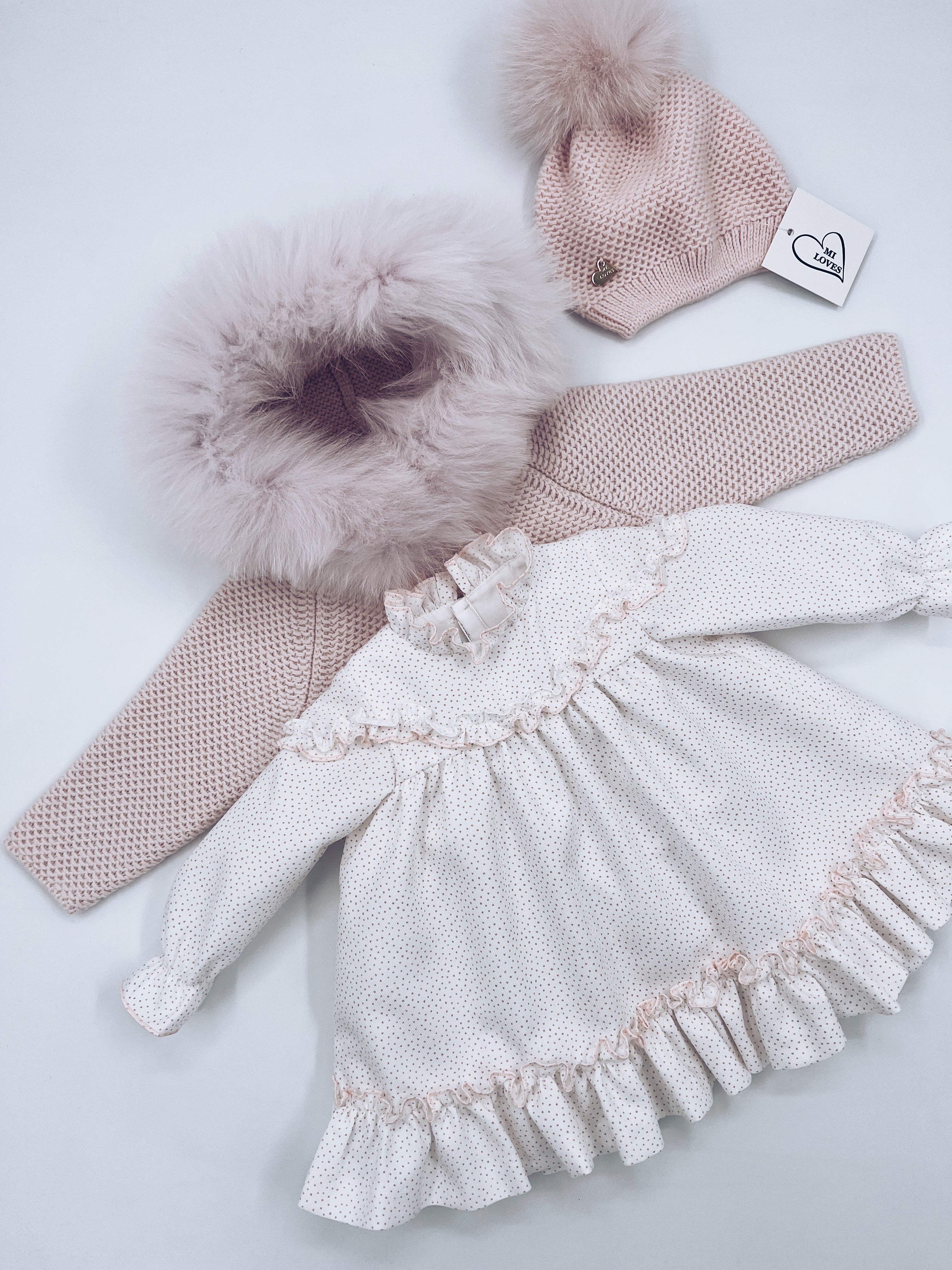 Knitted Cardigan and matching pompom hat(Sold Separately)also available on the website.