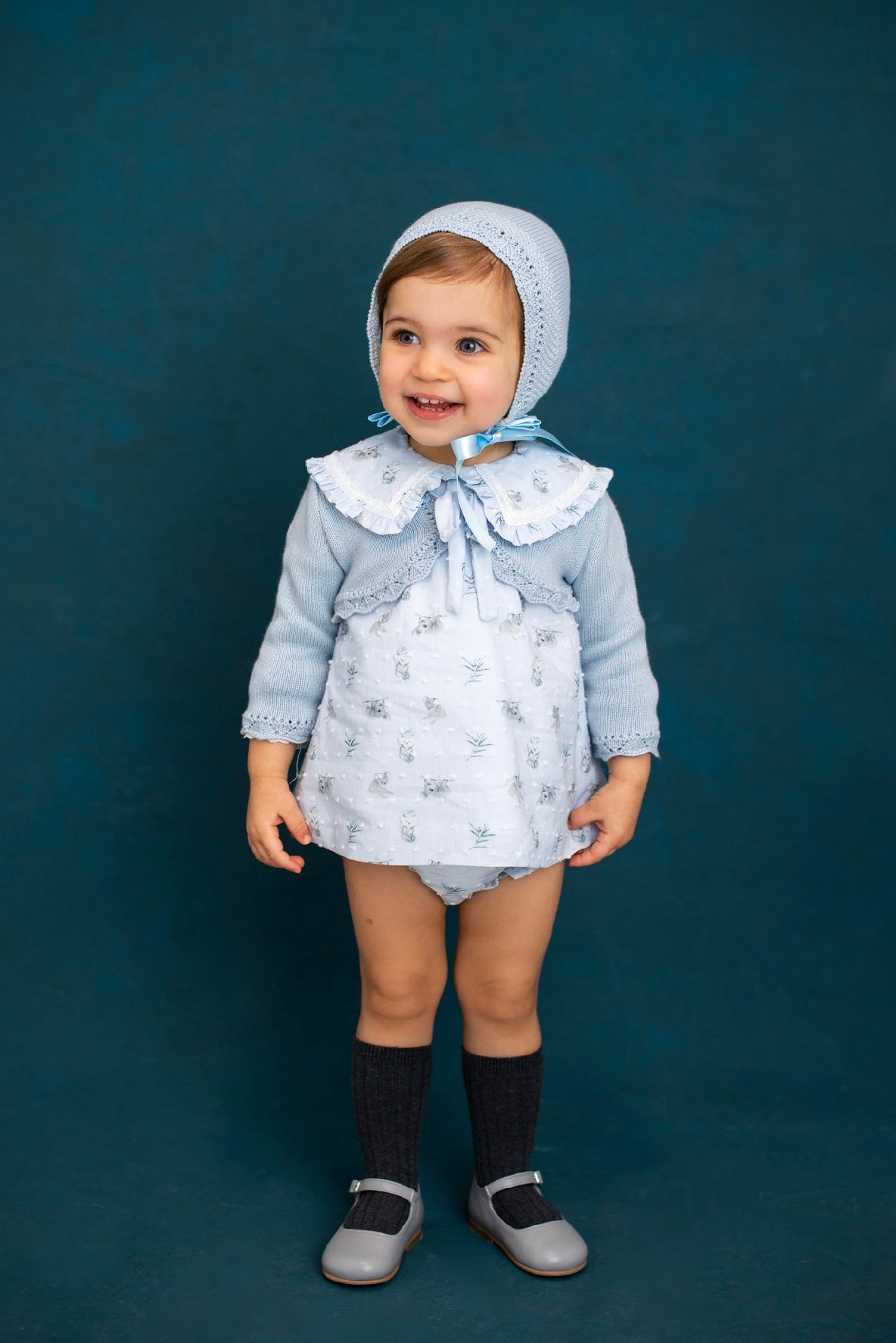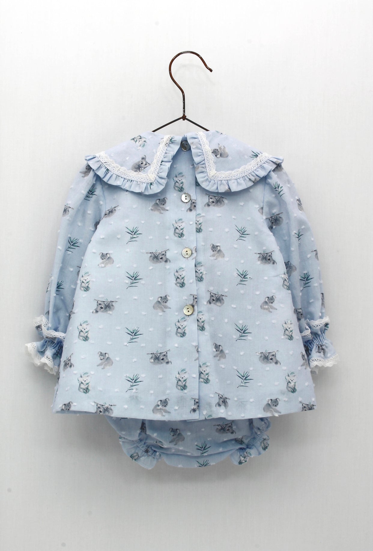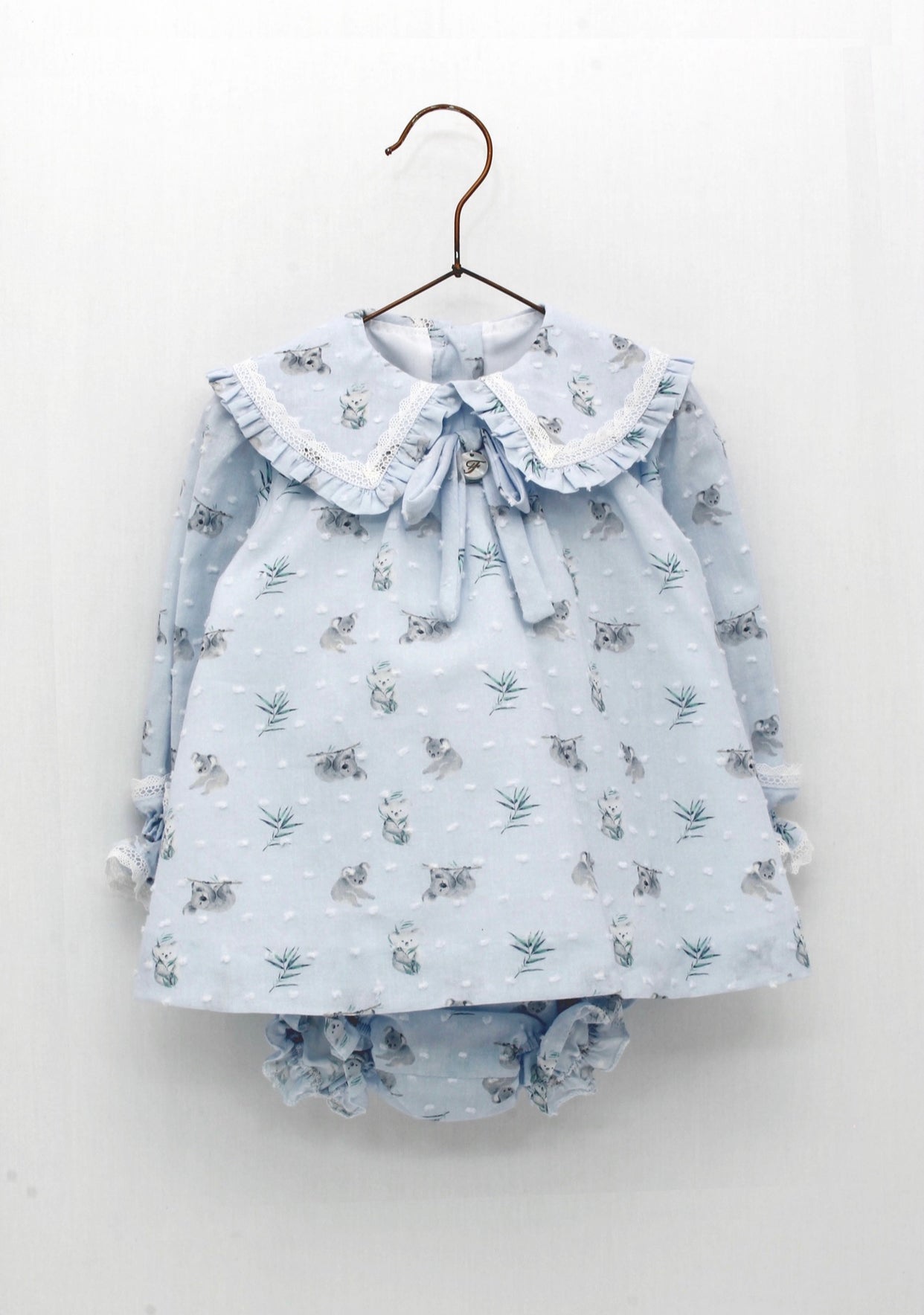 Pale blue dress and frilly knickers set for baby girls. The dress is patterned with koalas and white threaded dots, and there is a pretty ruffle collar with a lace trim. Along with a button fastening on the back and white lining, there is also a decorative bow on the front. The matching knickers have an elasticated waist and frilly leg trims.