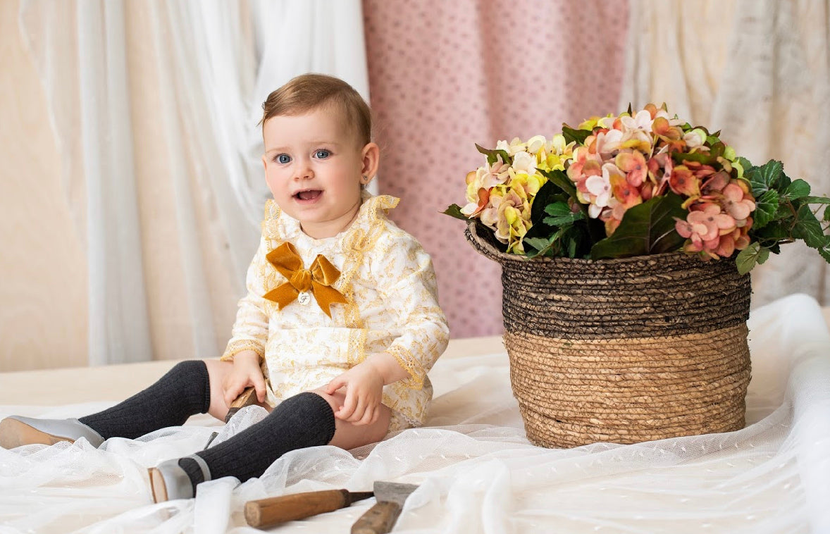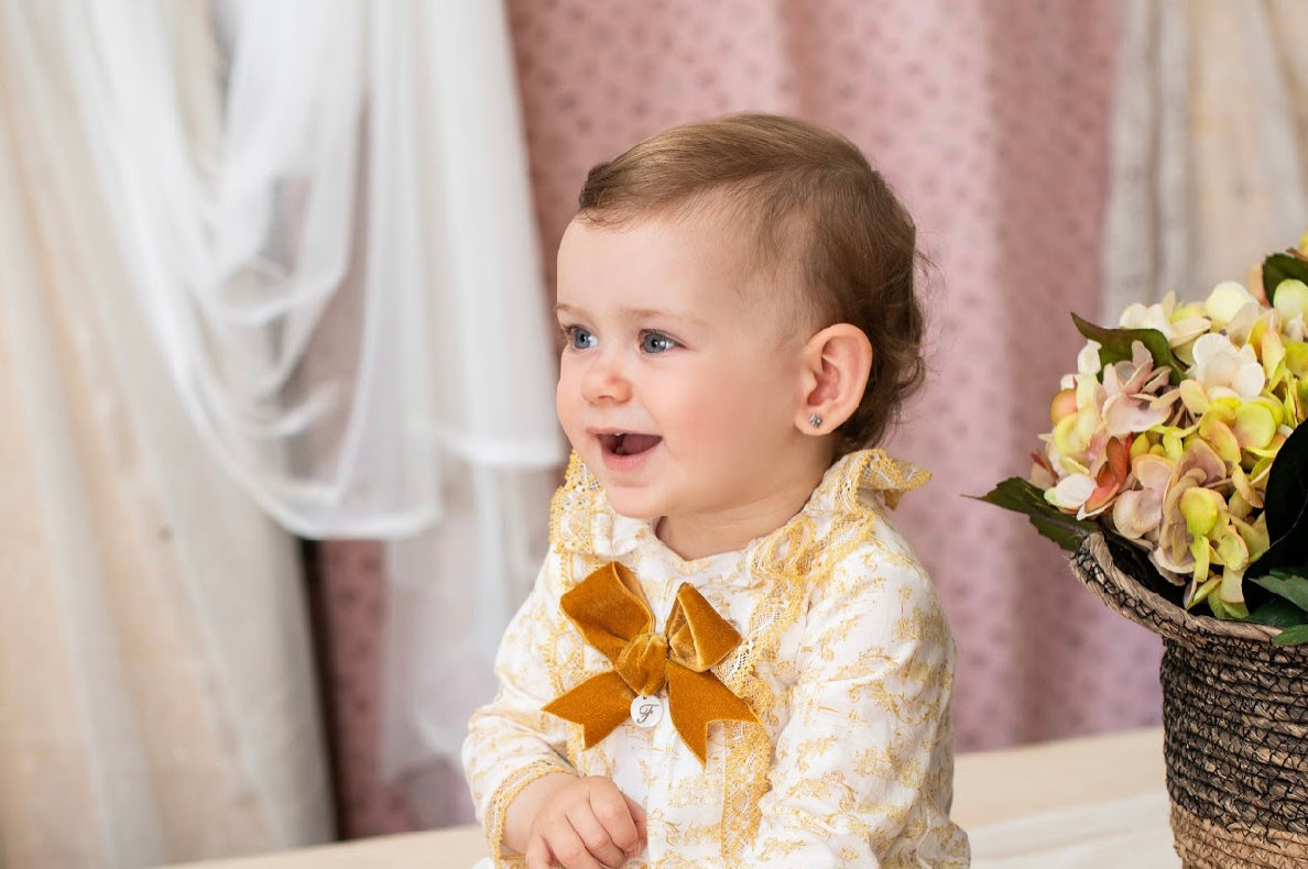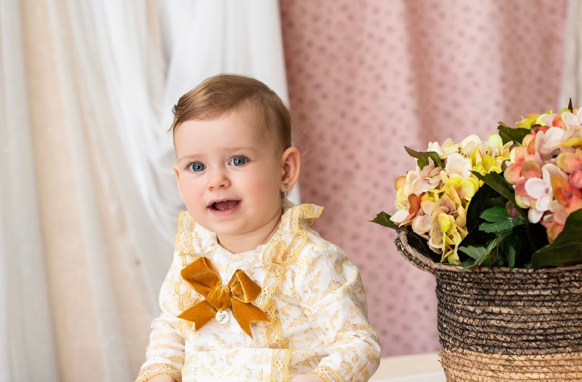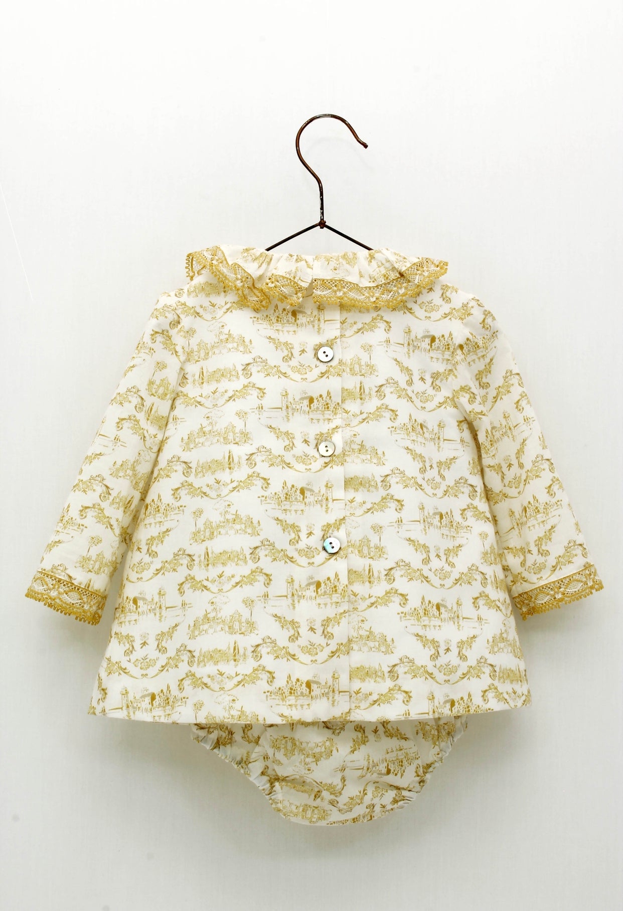 Ivory and mustard yellow dress set for little girls. The soft cotton fabric has a beautiful toile de jouy print, with white and yellow lace trims and a lovely velvet bow on the front. Fully lined, it comes with a matching pair of knickers to complete the look.