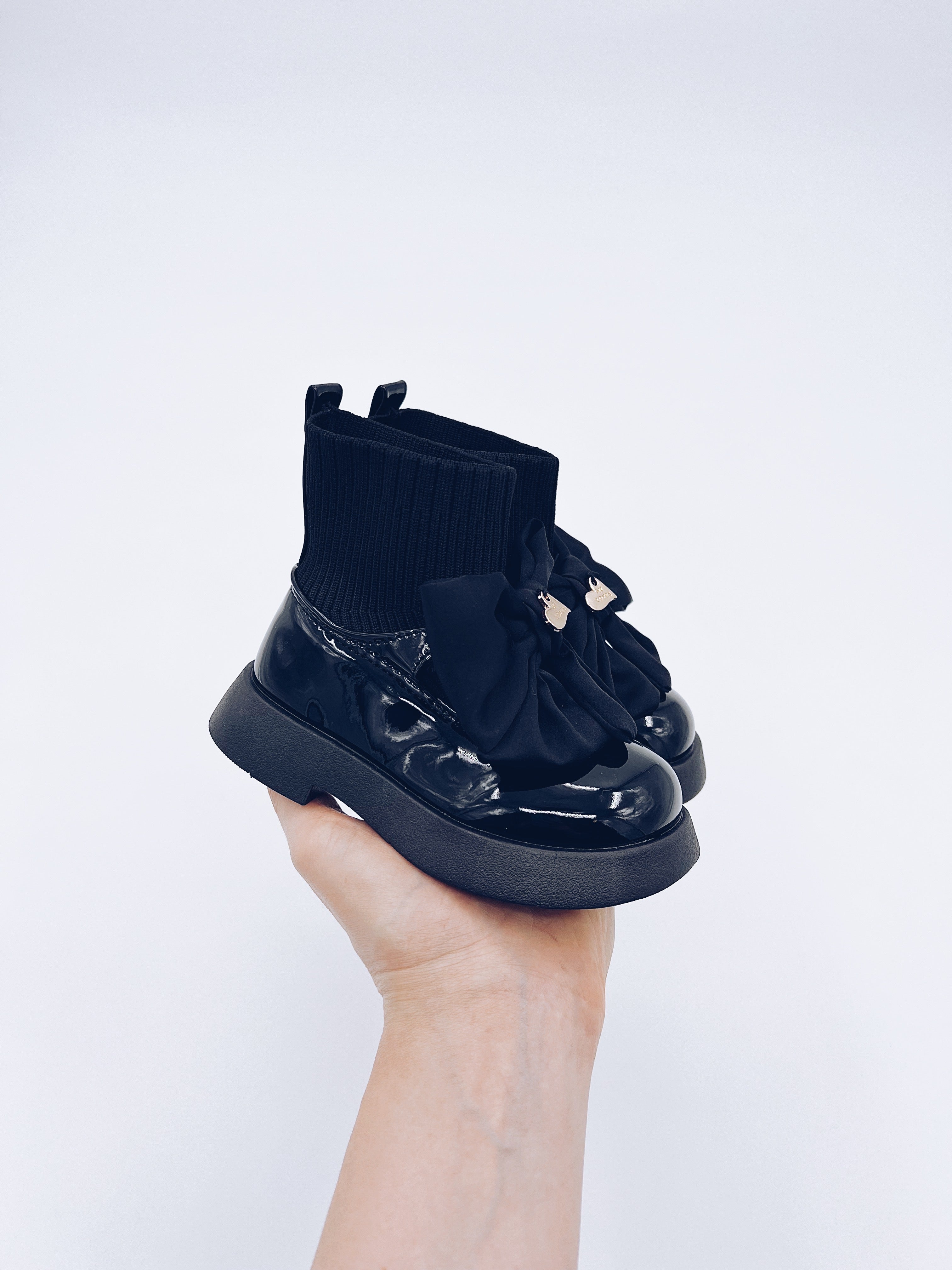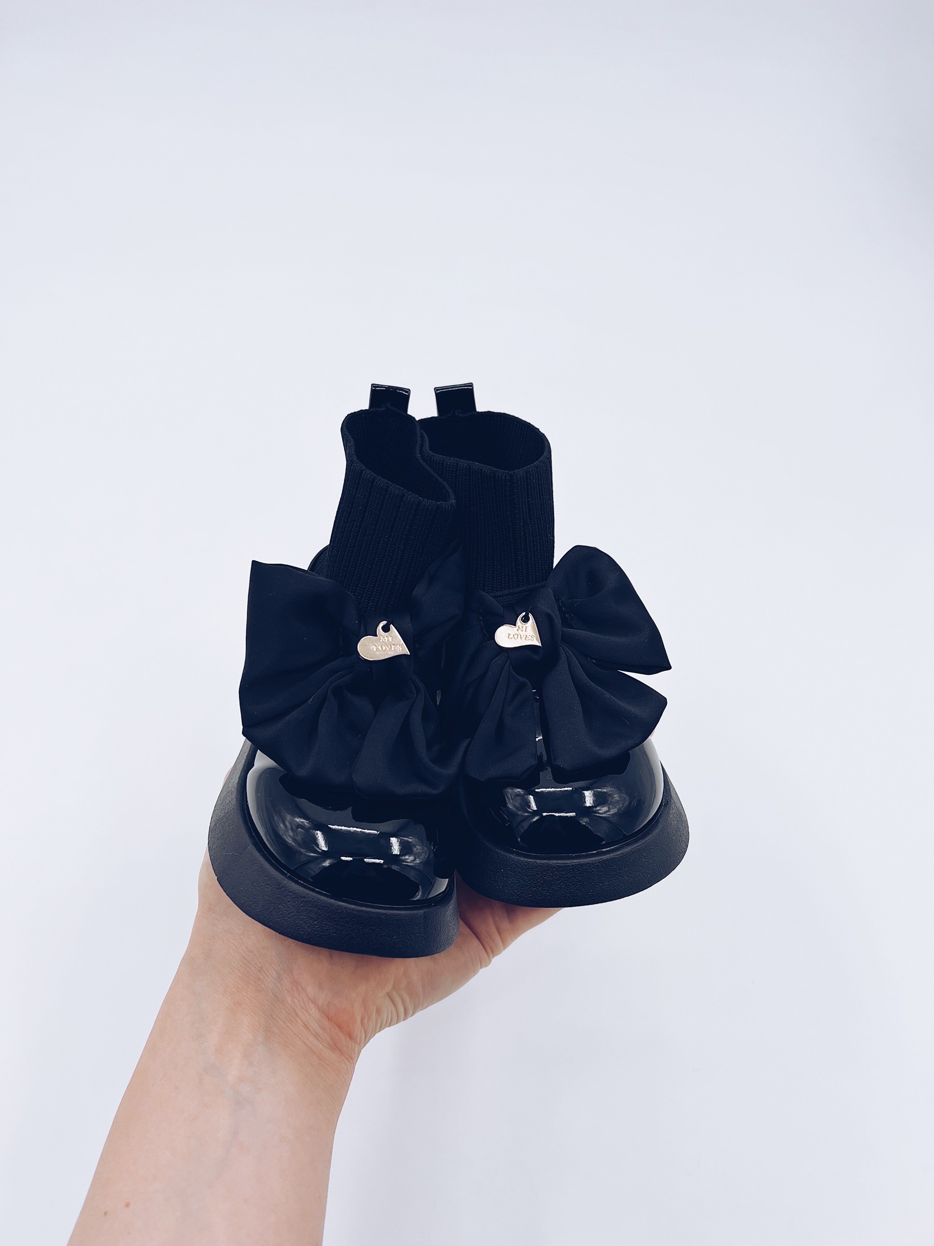 Beautiful Black Sock-Boots made in shiny patent faux leather. Big Satin Bow details on the front of the boots.