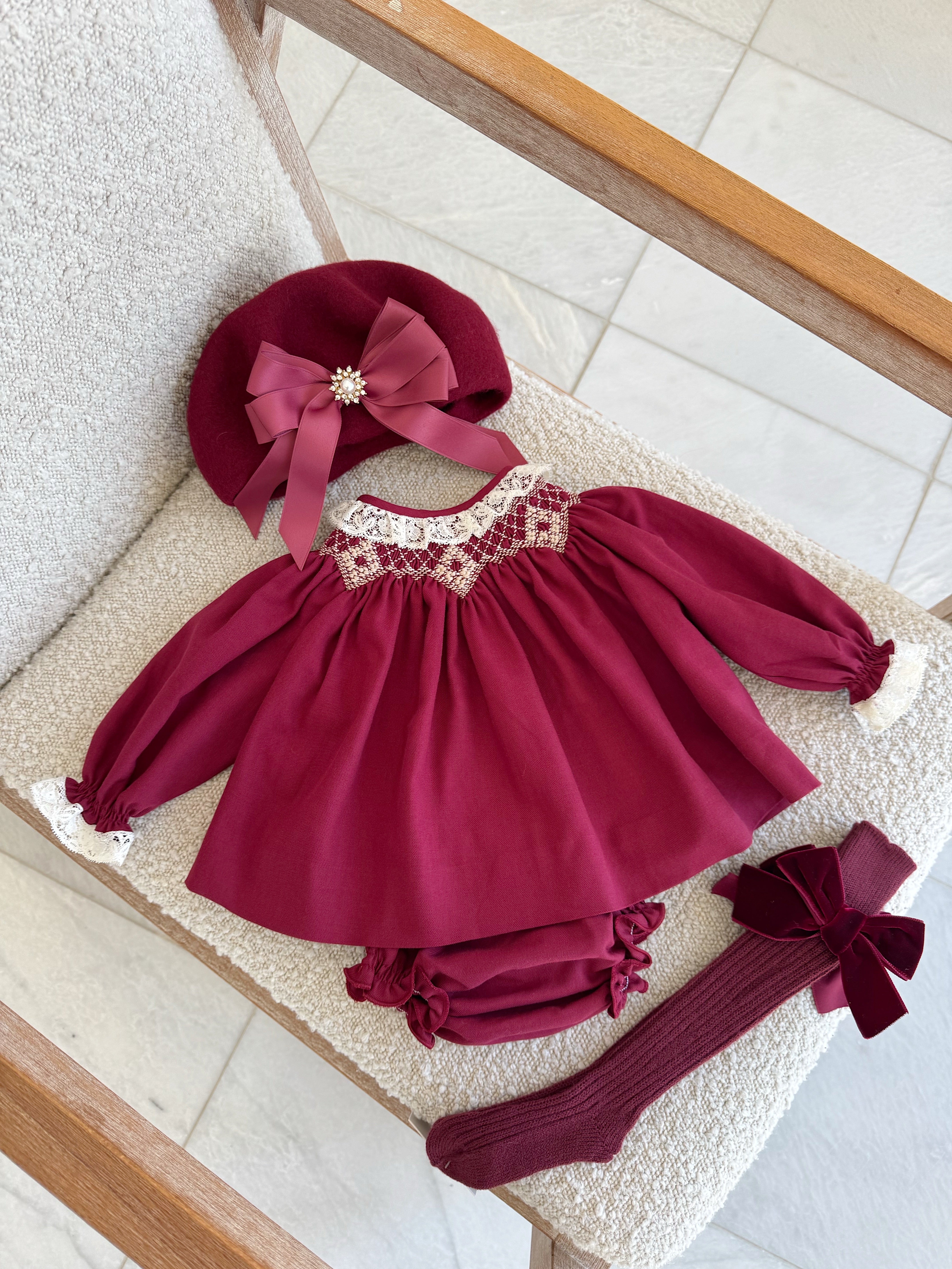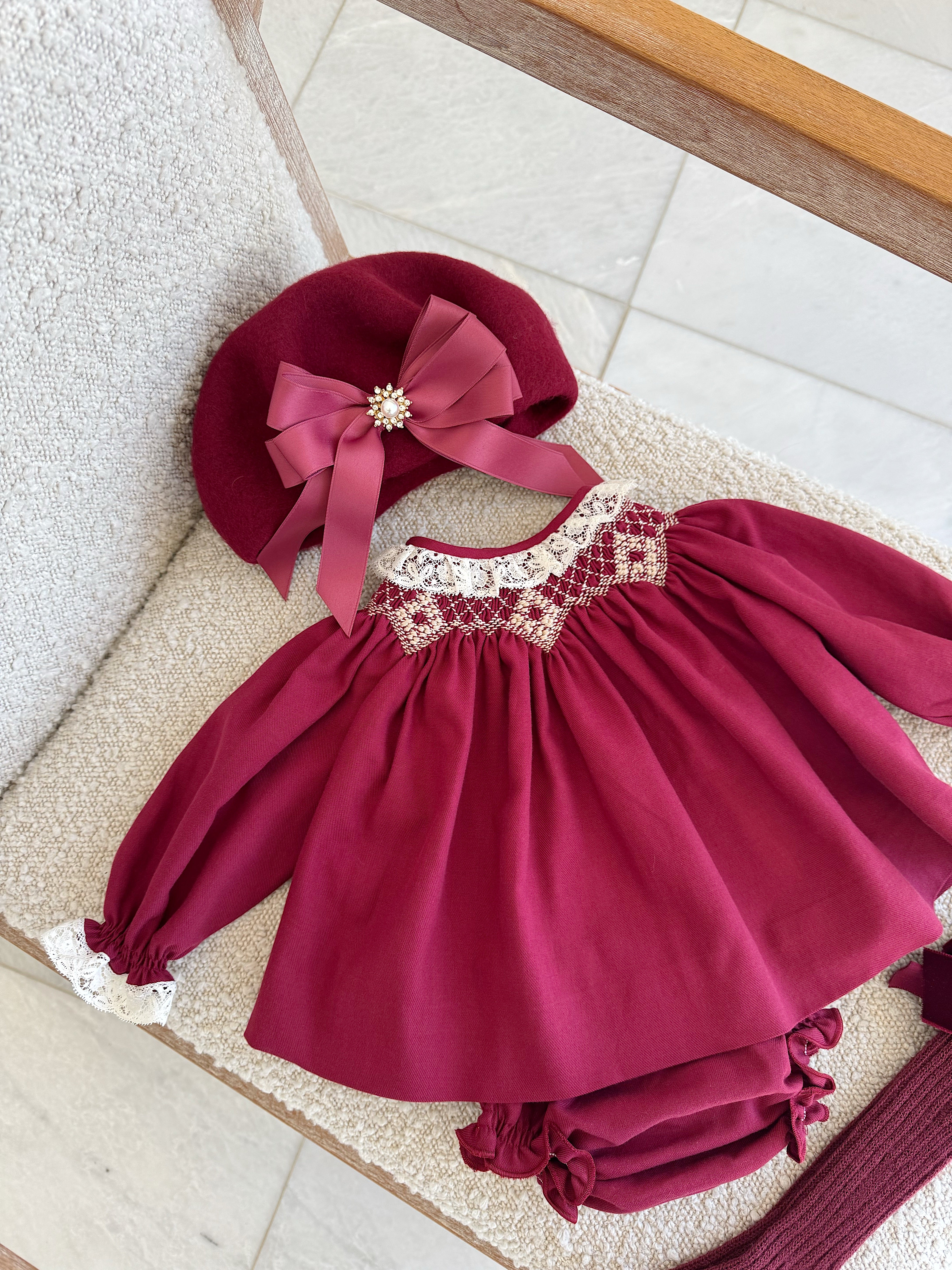 Beautiful Burgundy Dress/Bloomers 2 piece set with Hand Smoke and lace details.
