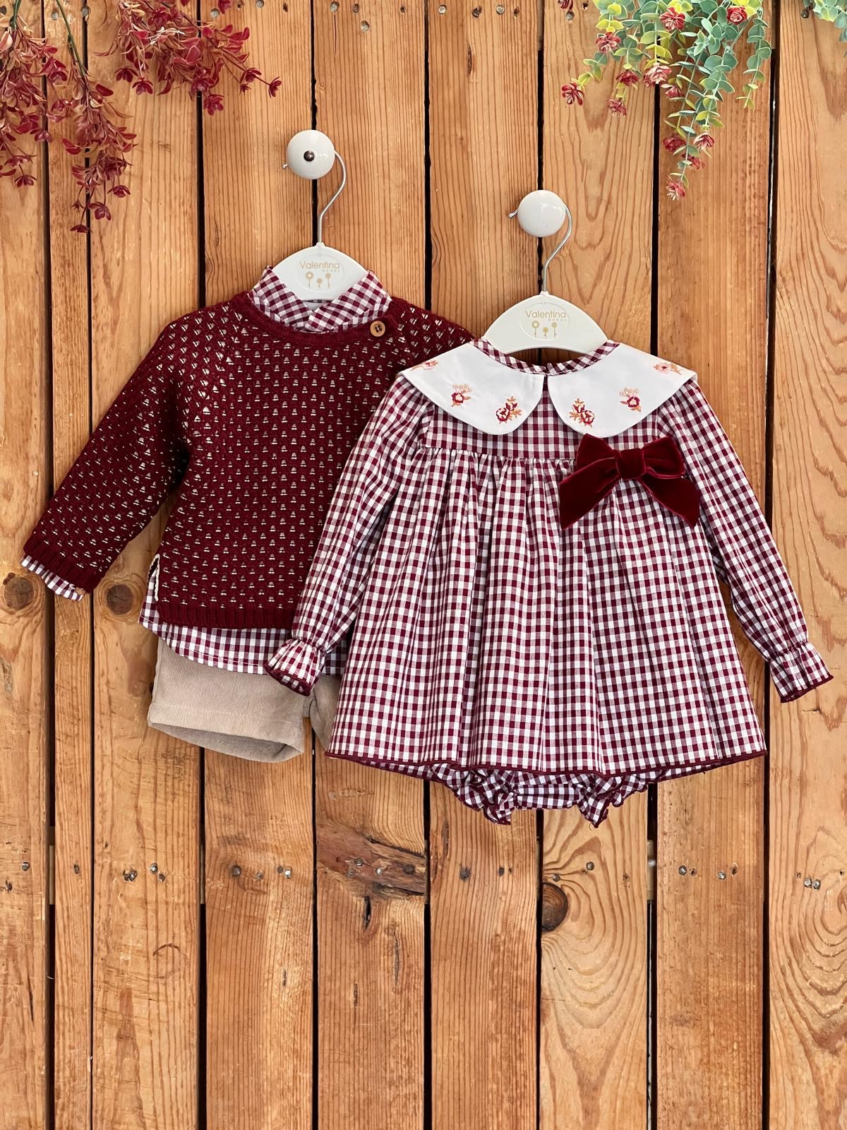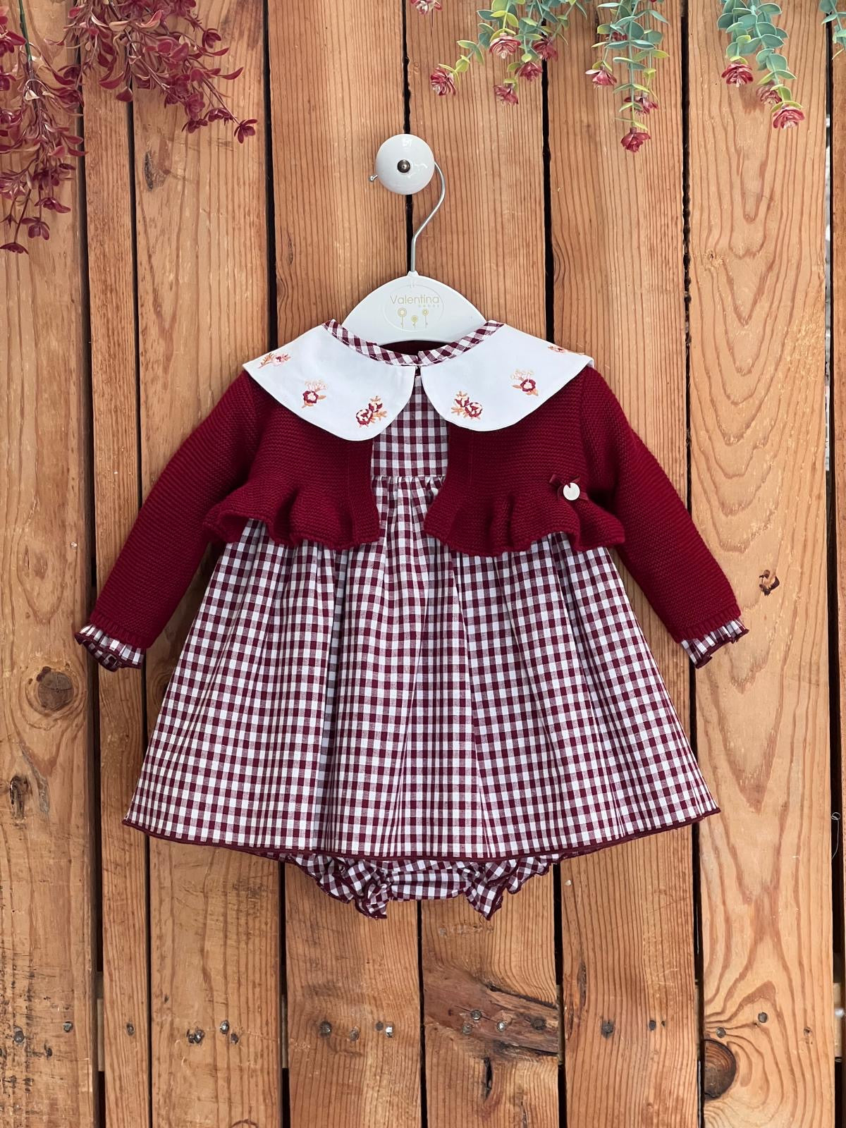 Beautiful Burgundy Gingham Dress/ bloomers set with white collar details.