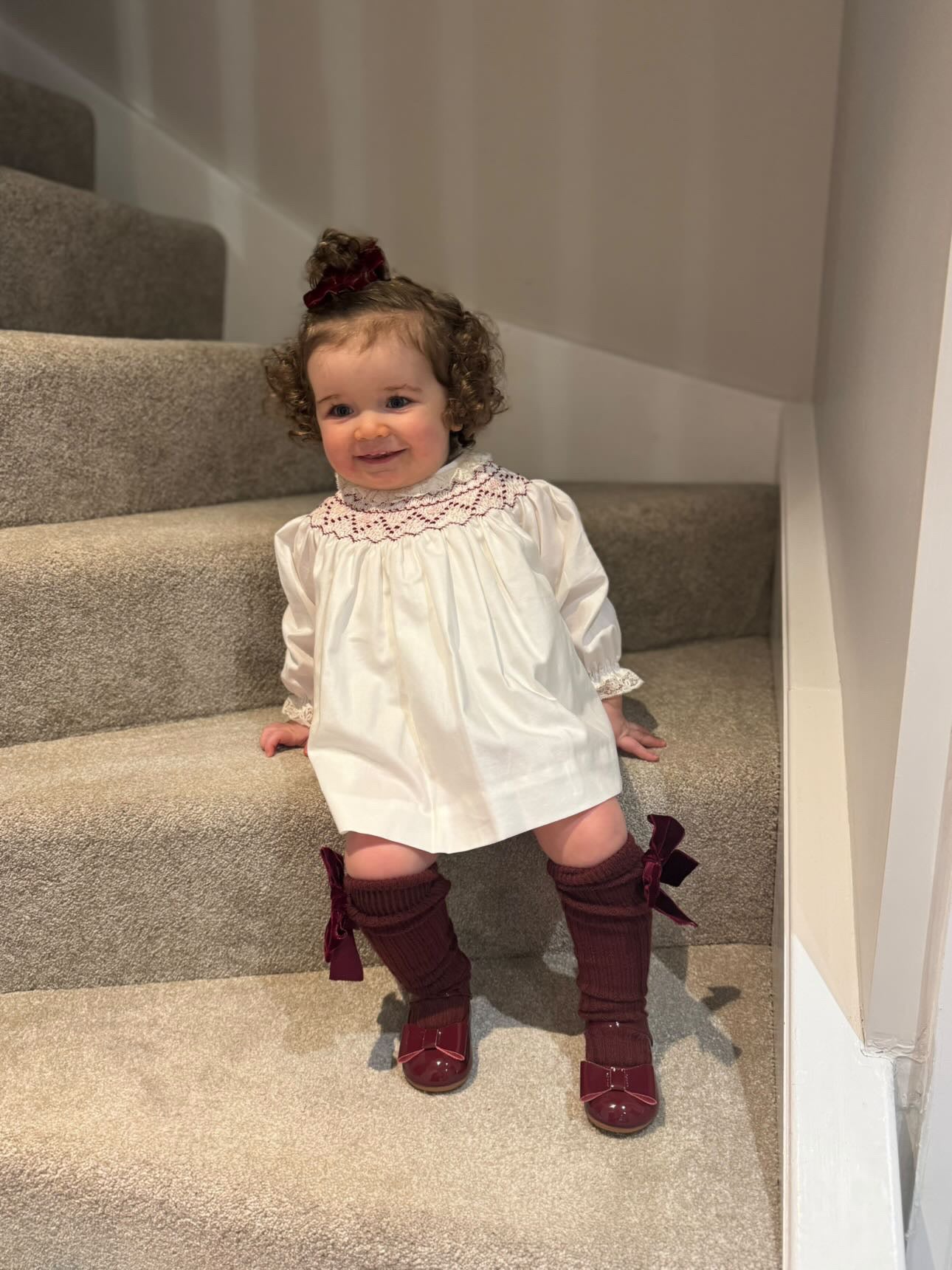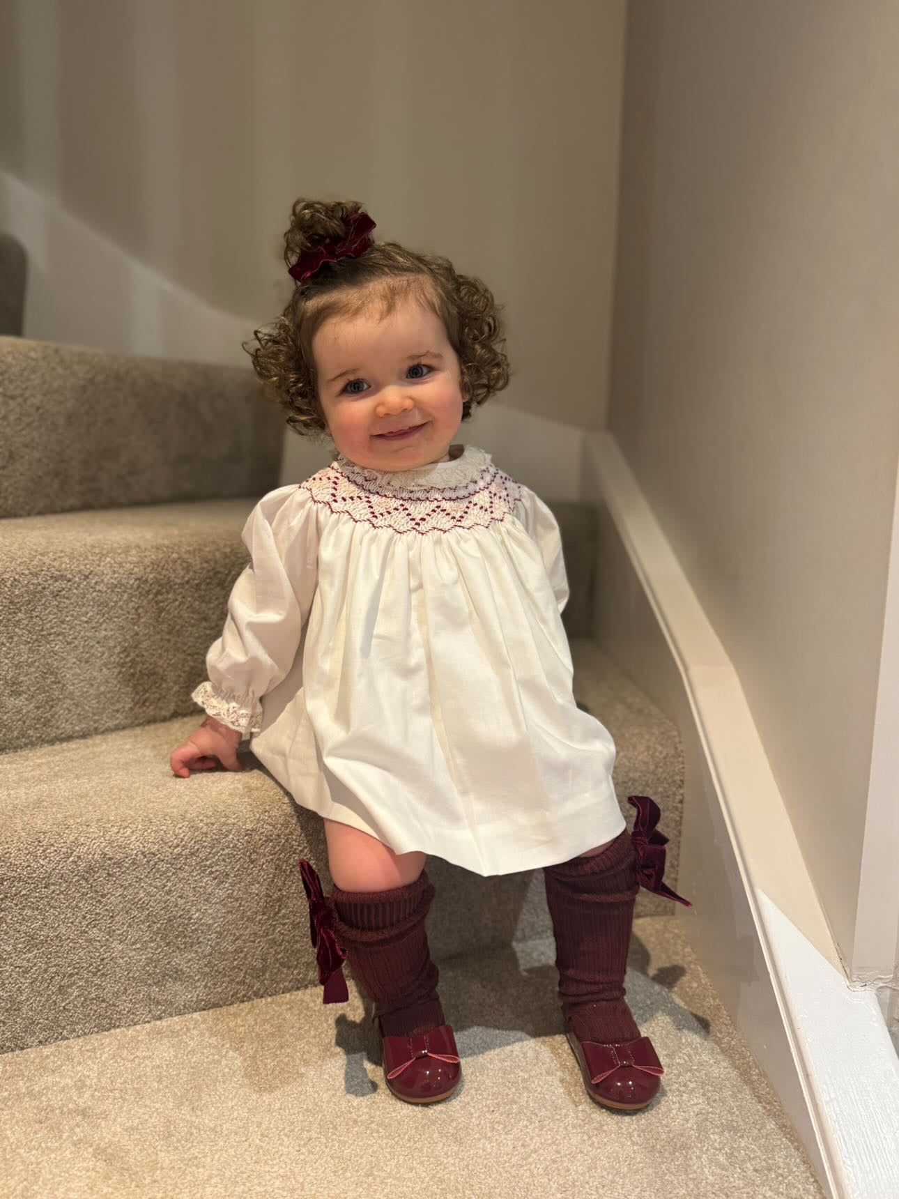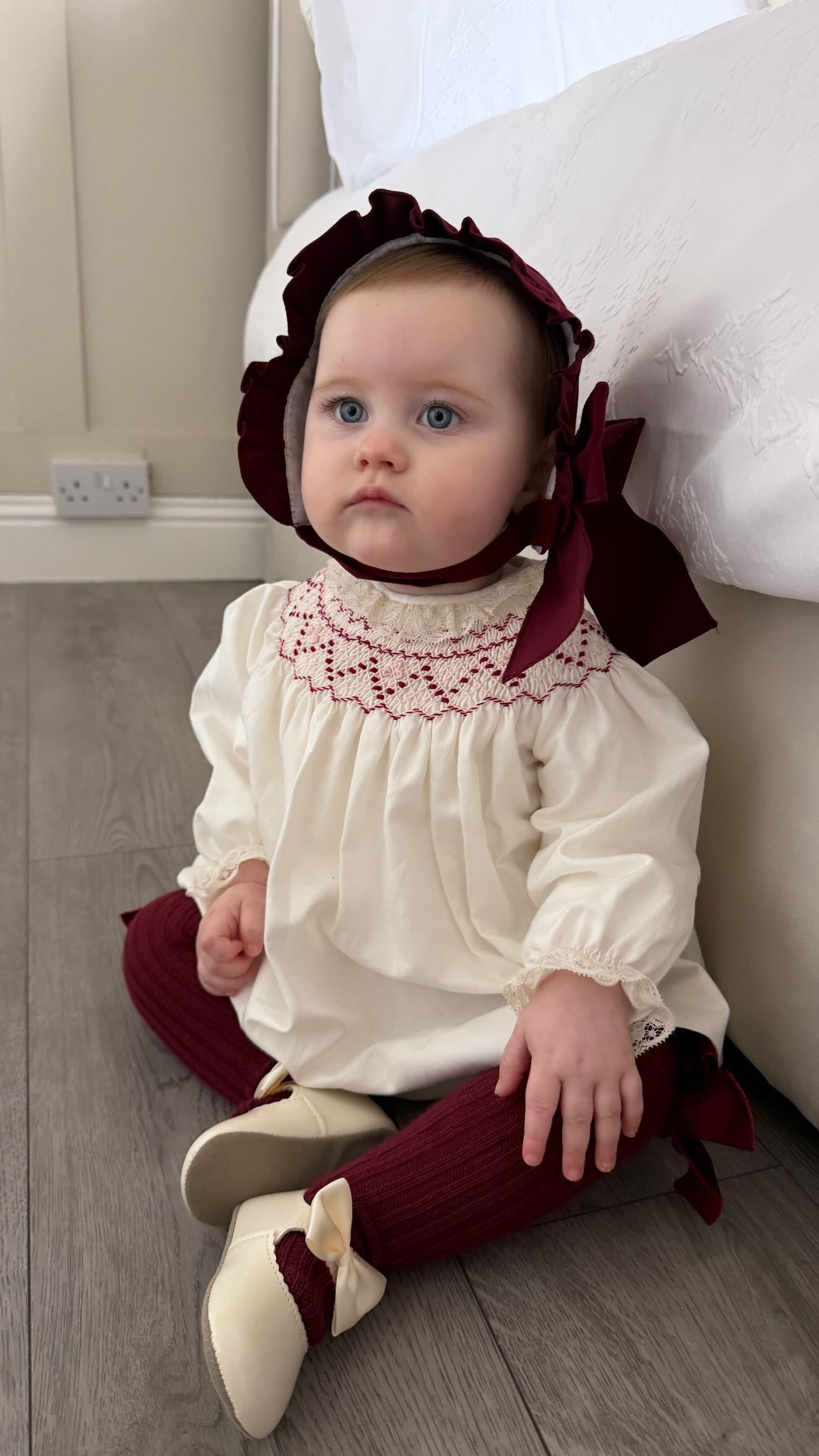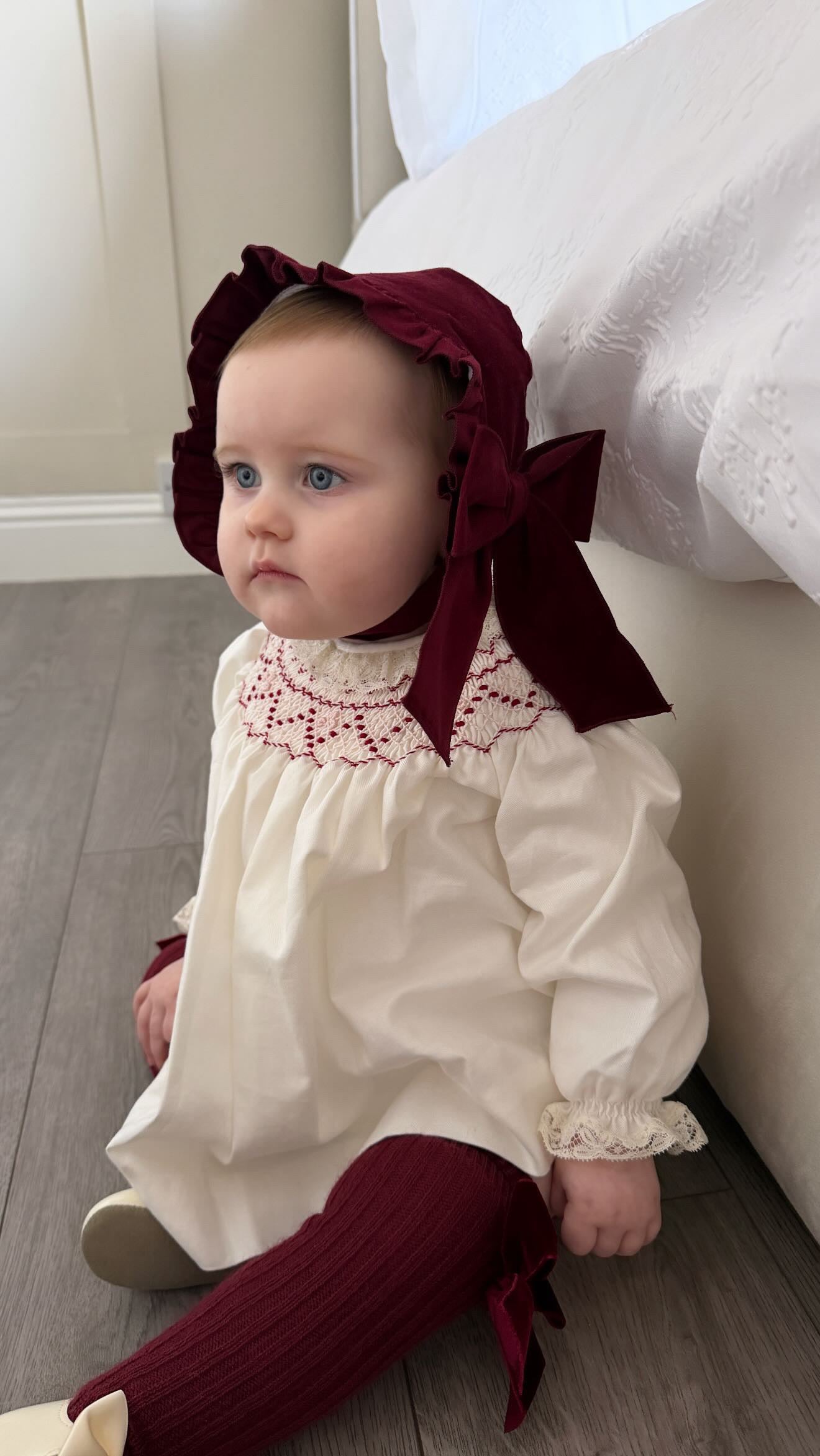 Beautiful Ivory Dress/Bloomers 2 piece set with Hand Smoke and lace details.