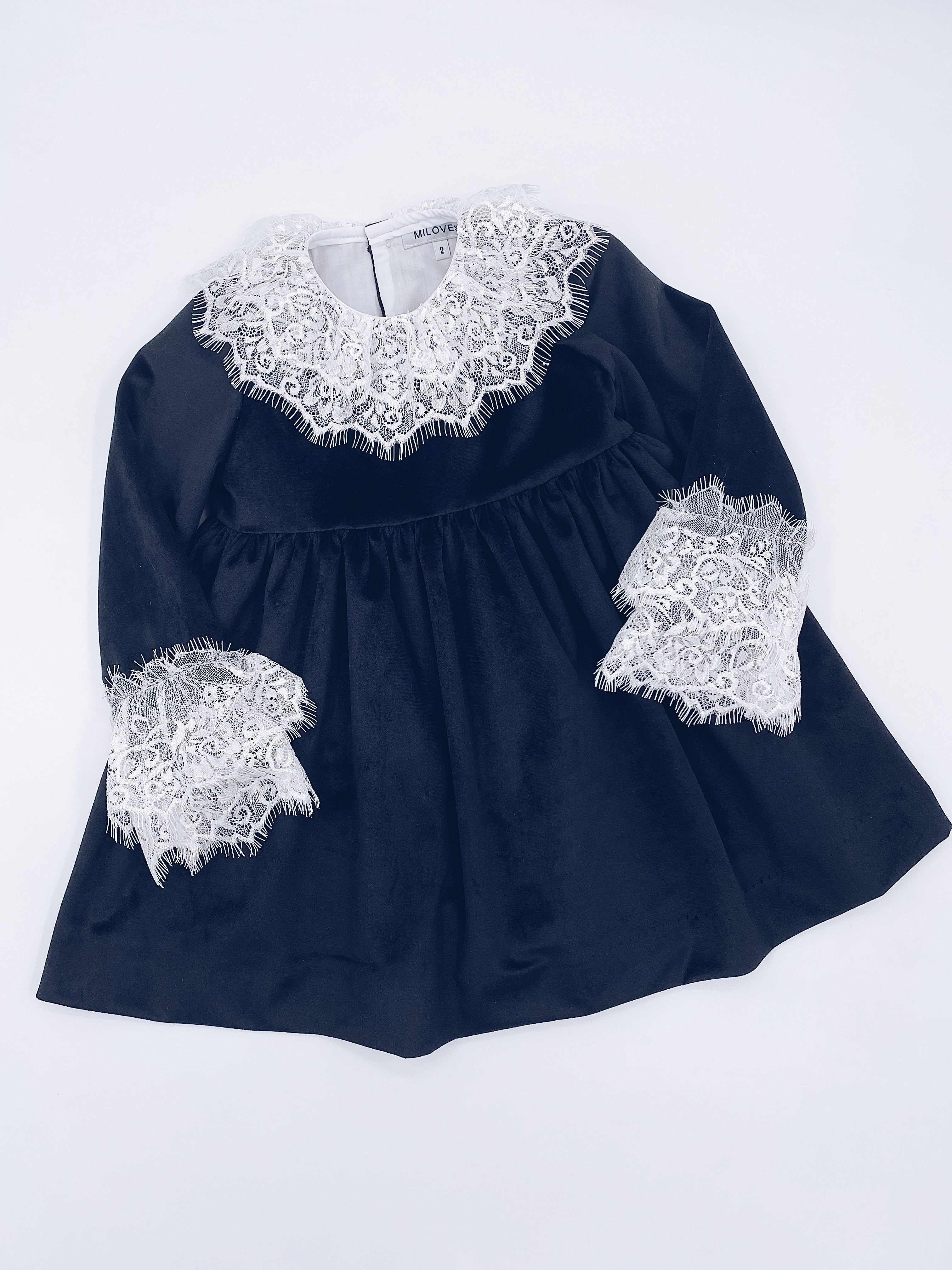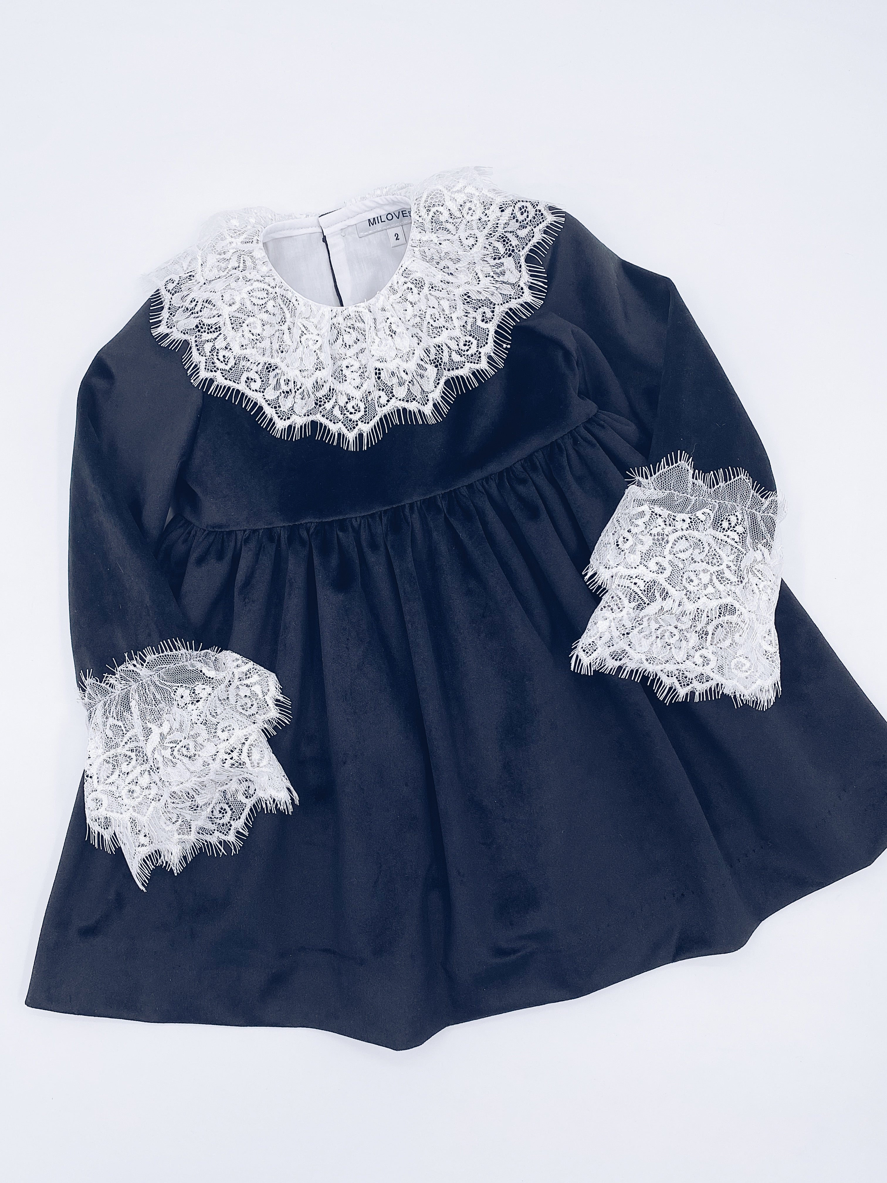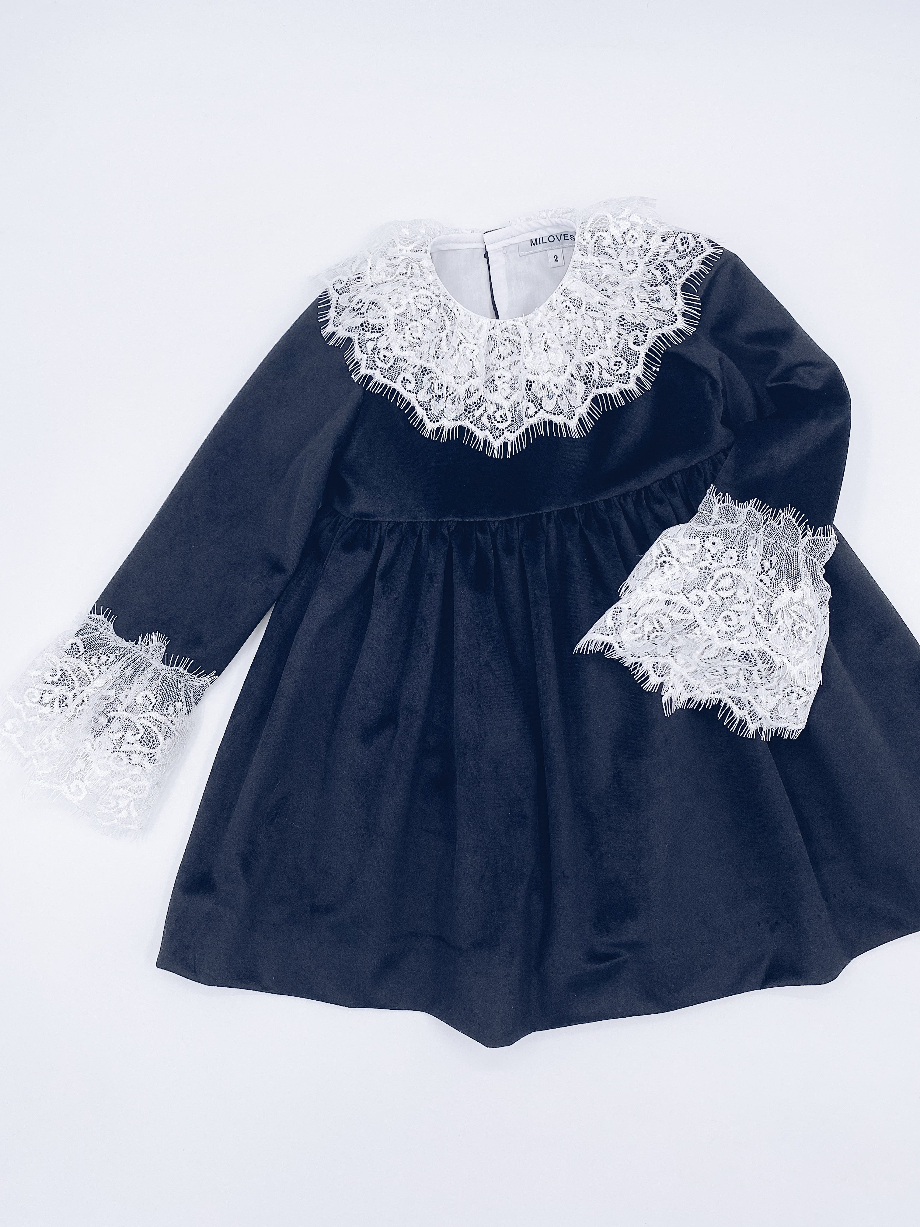 MI LOVES Beautiful Black Velvet Dress with White Lace details on the neck and sleeves.