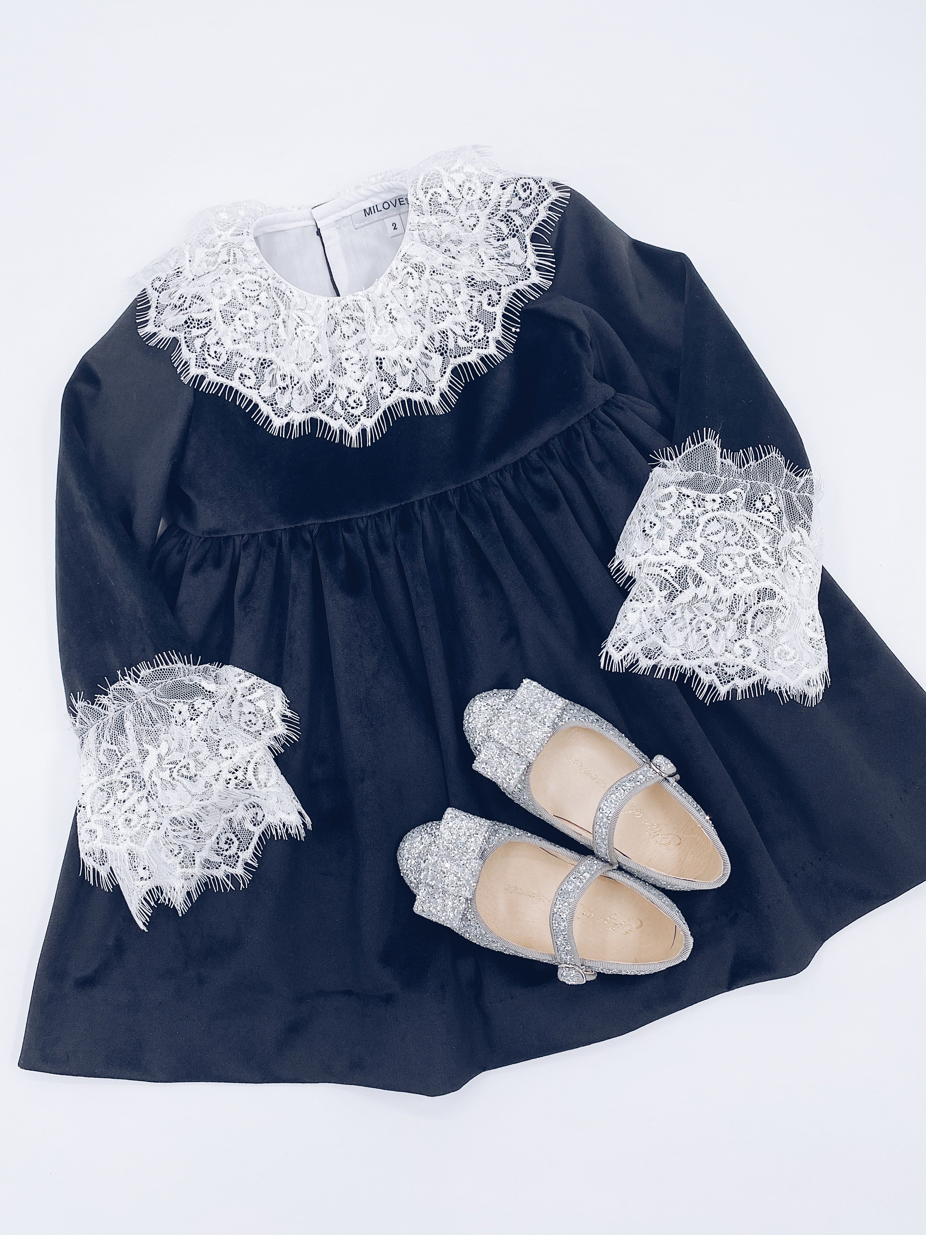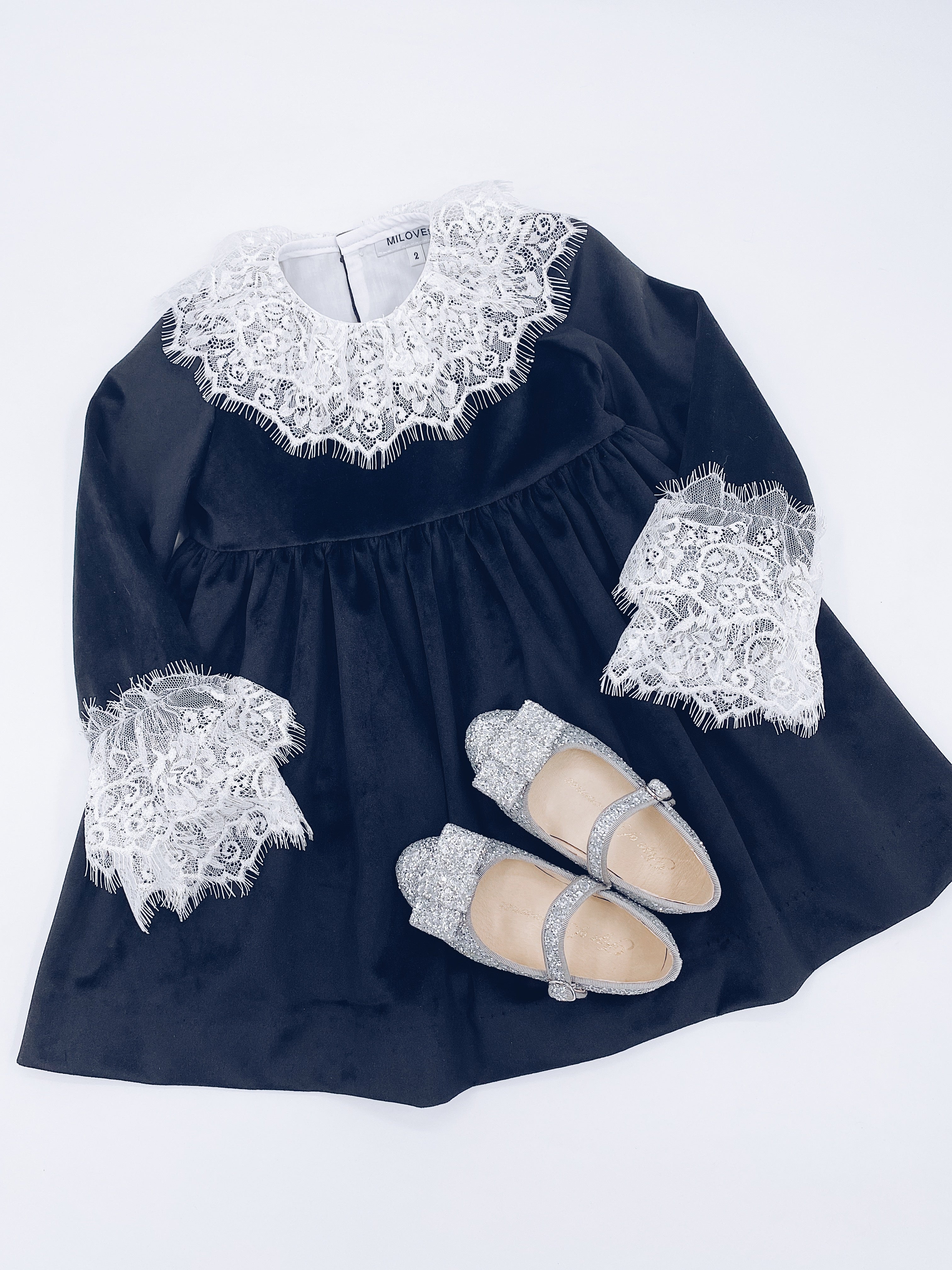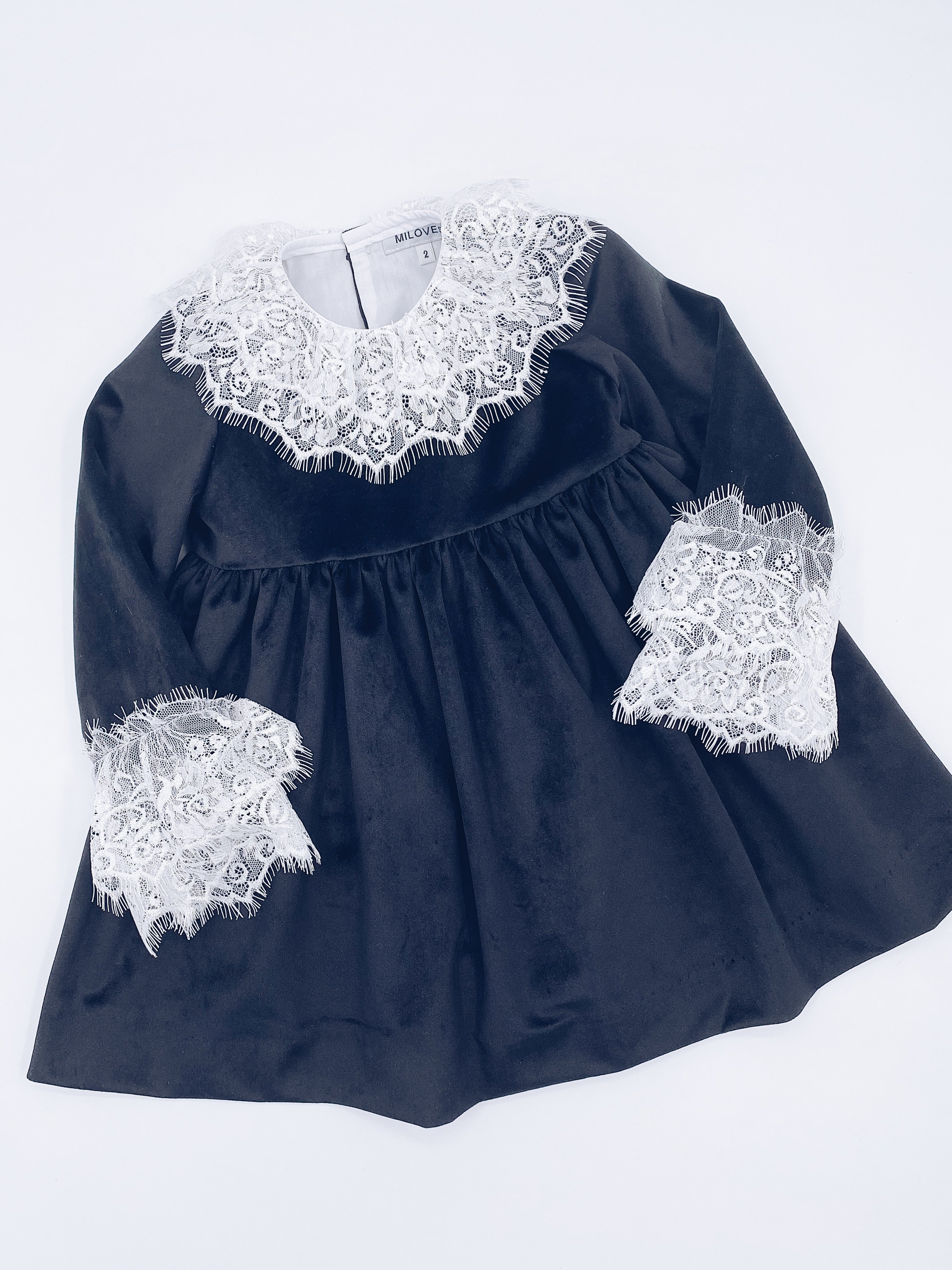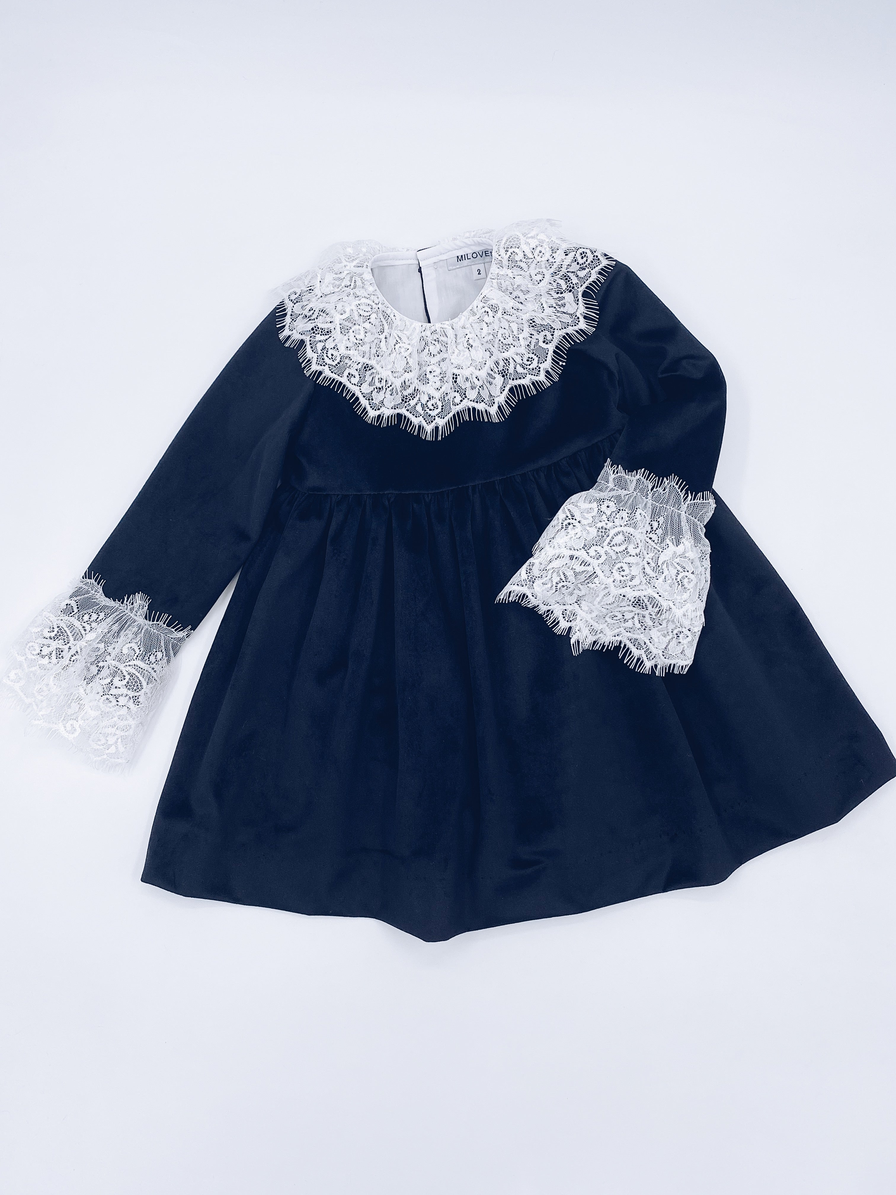 MI LOVES Beautiful Black Velvet Dress with White Lace details on the neck and sleeves.