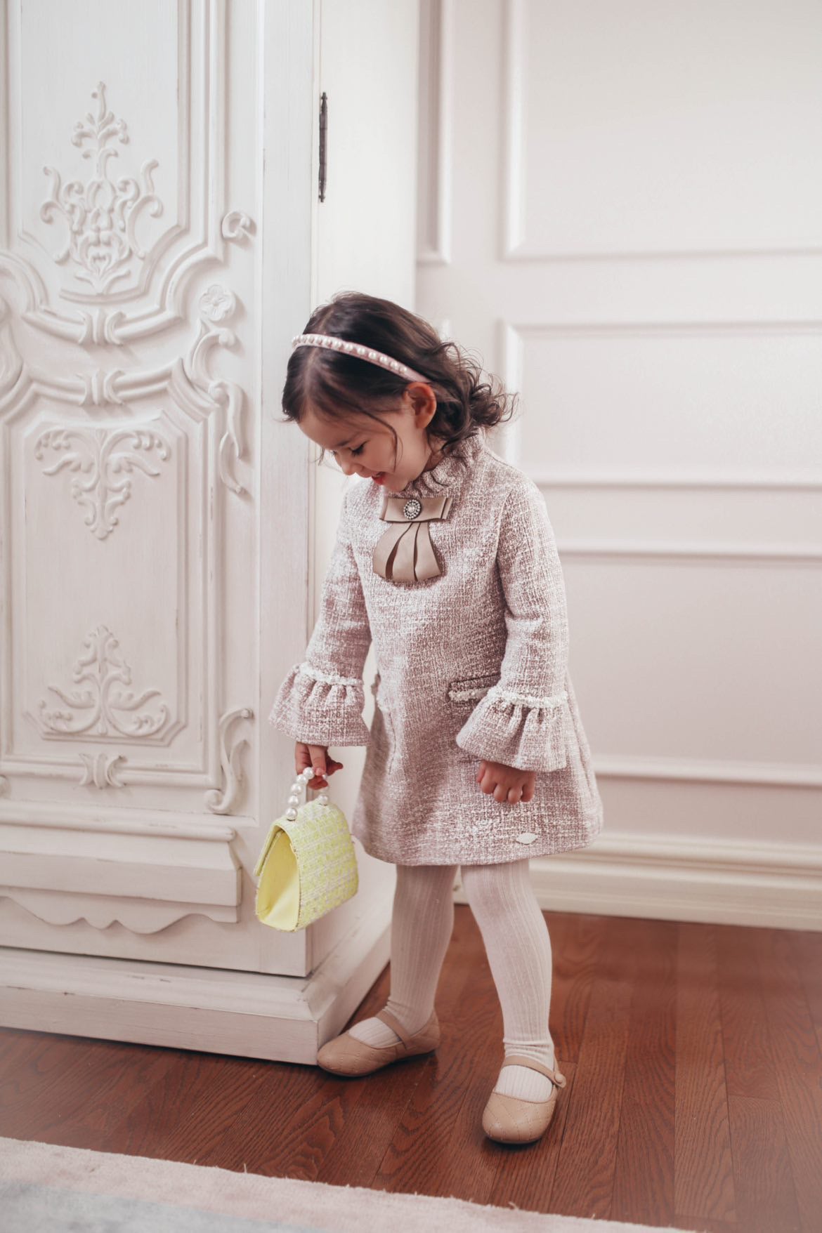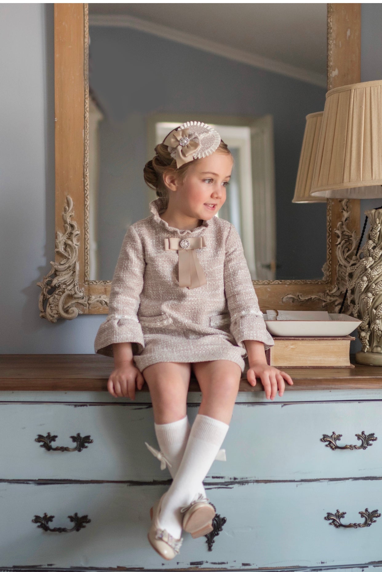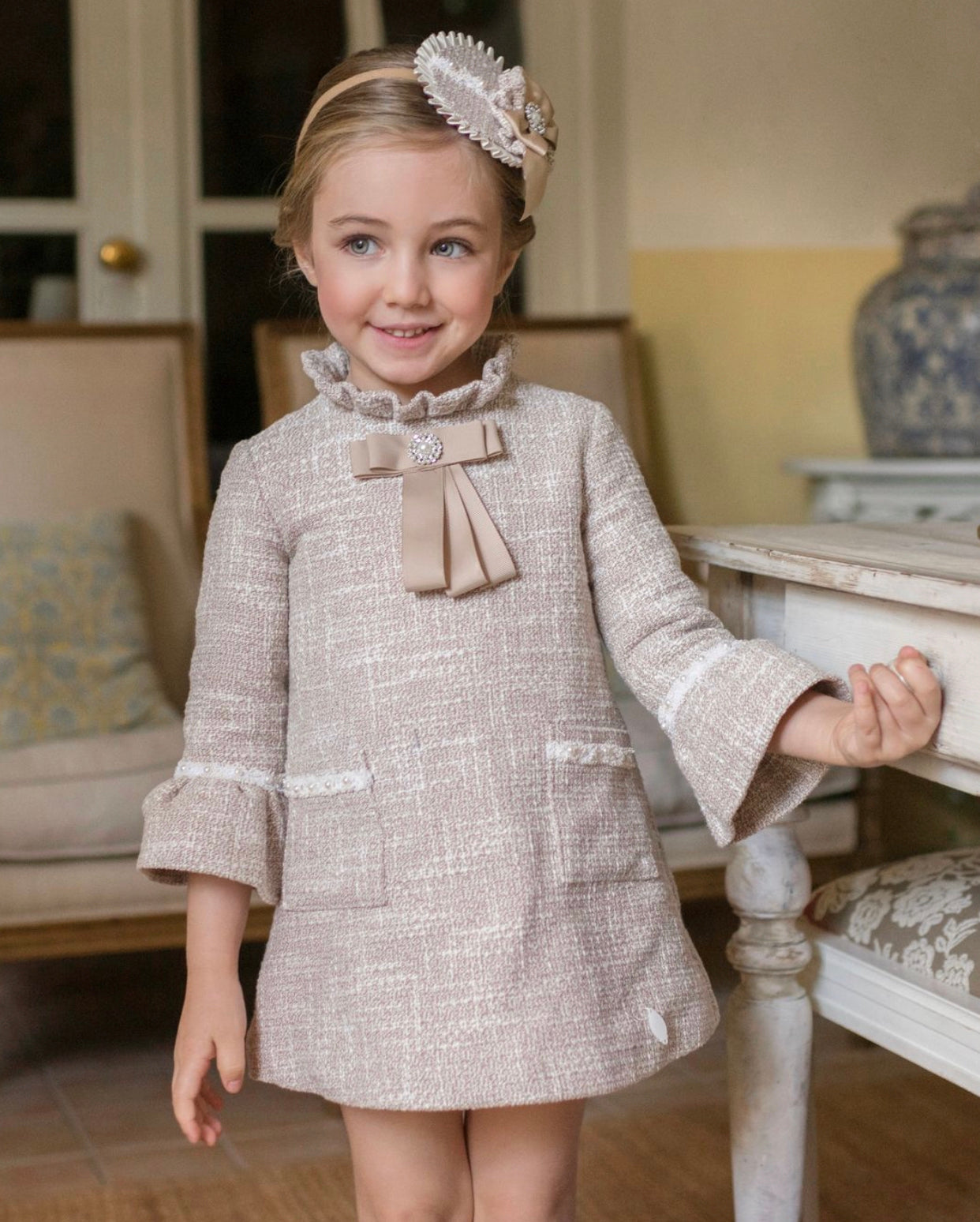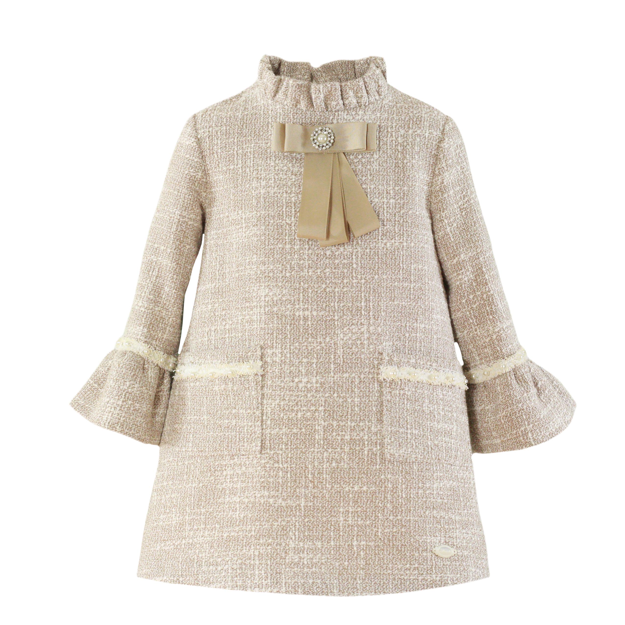 MI LOVES Beige Tweed A Line Dress with Pearl details.
