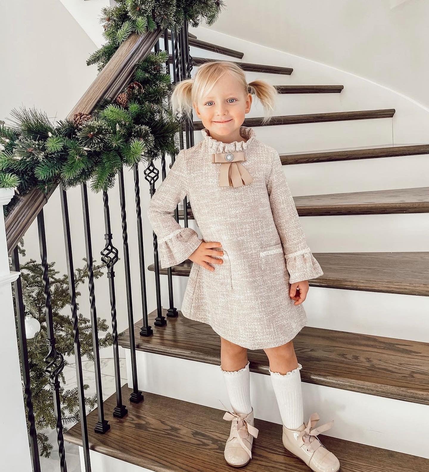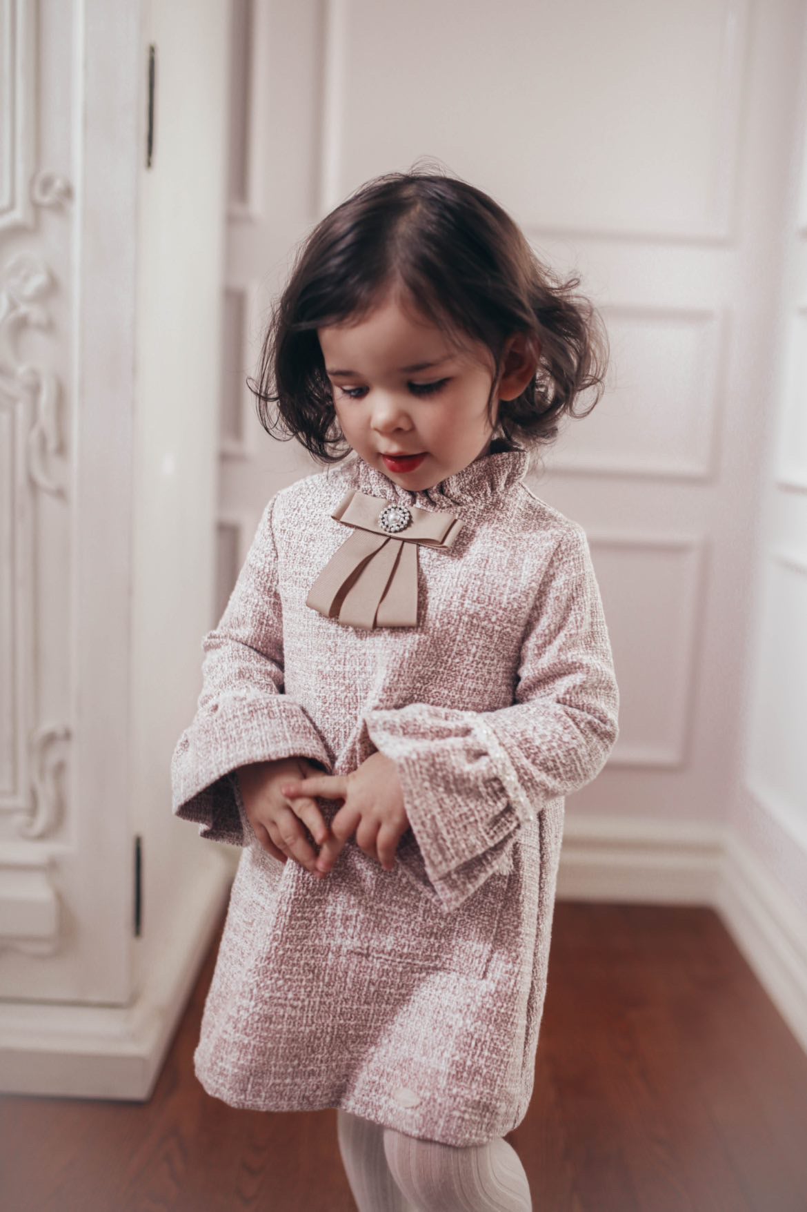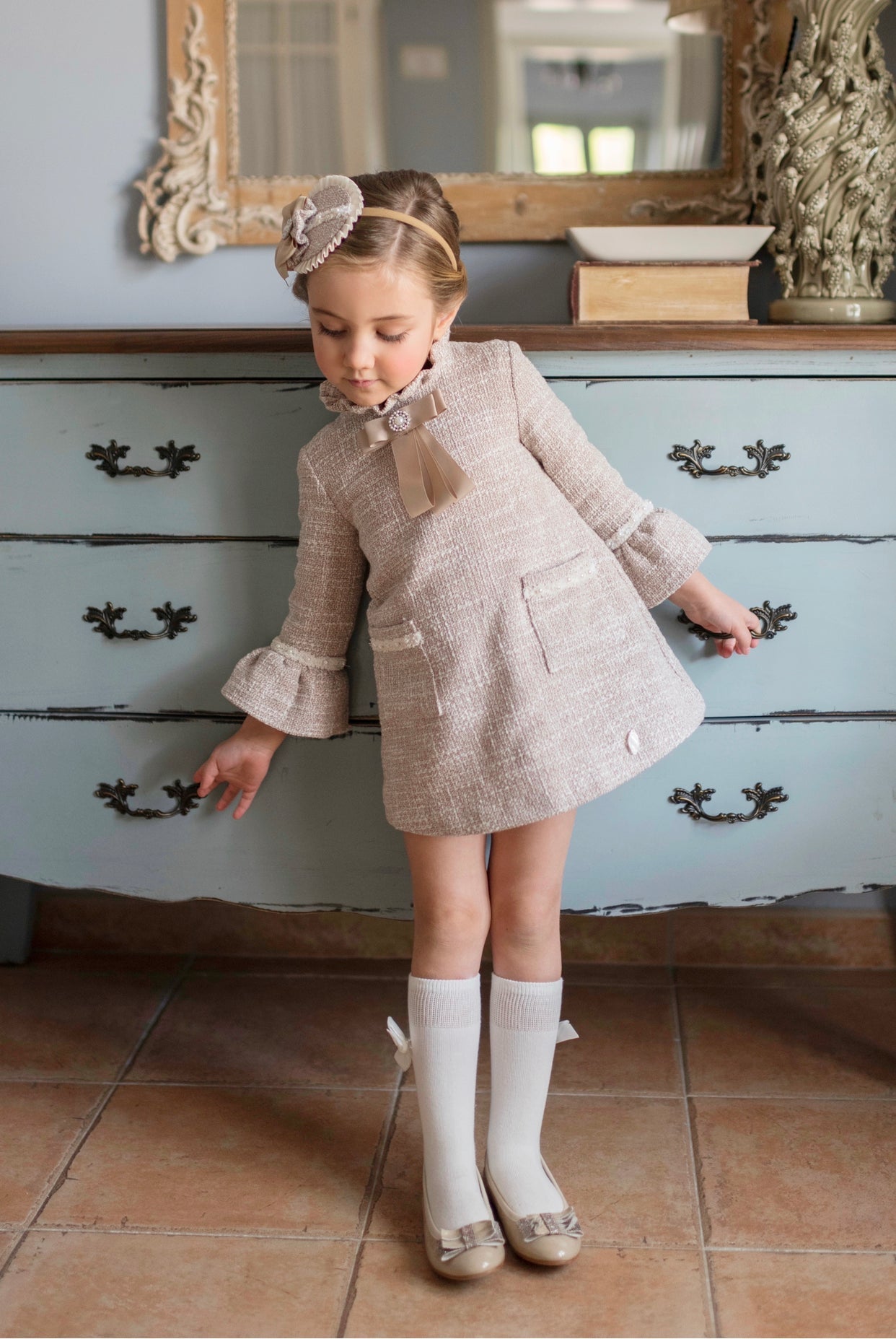 MI LOVES Beige Tweed A Line Dress with Pearl details.