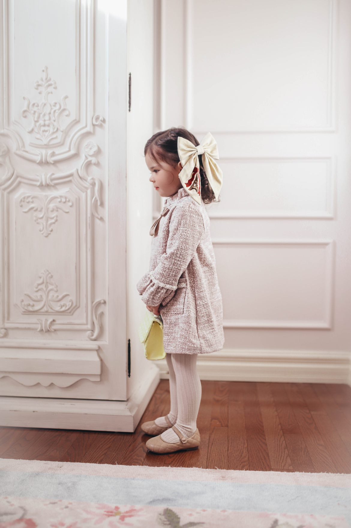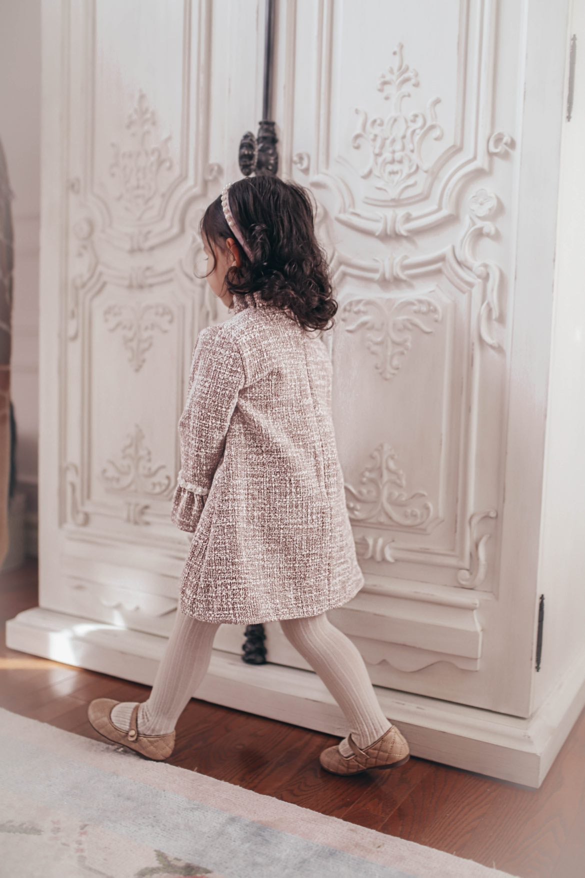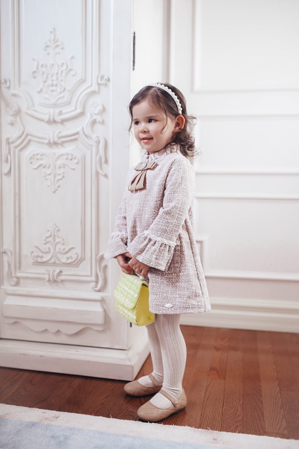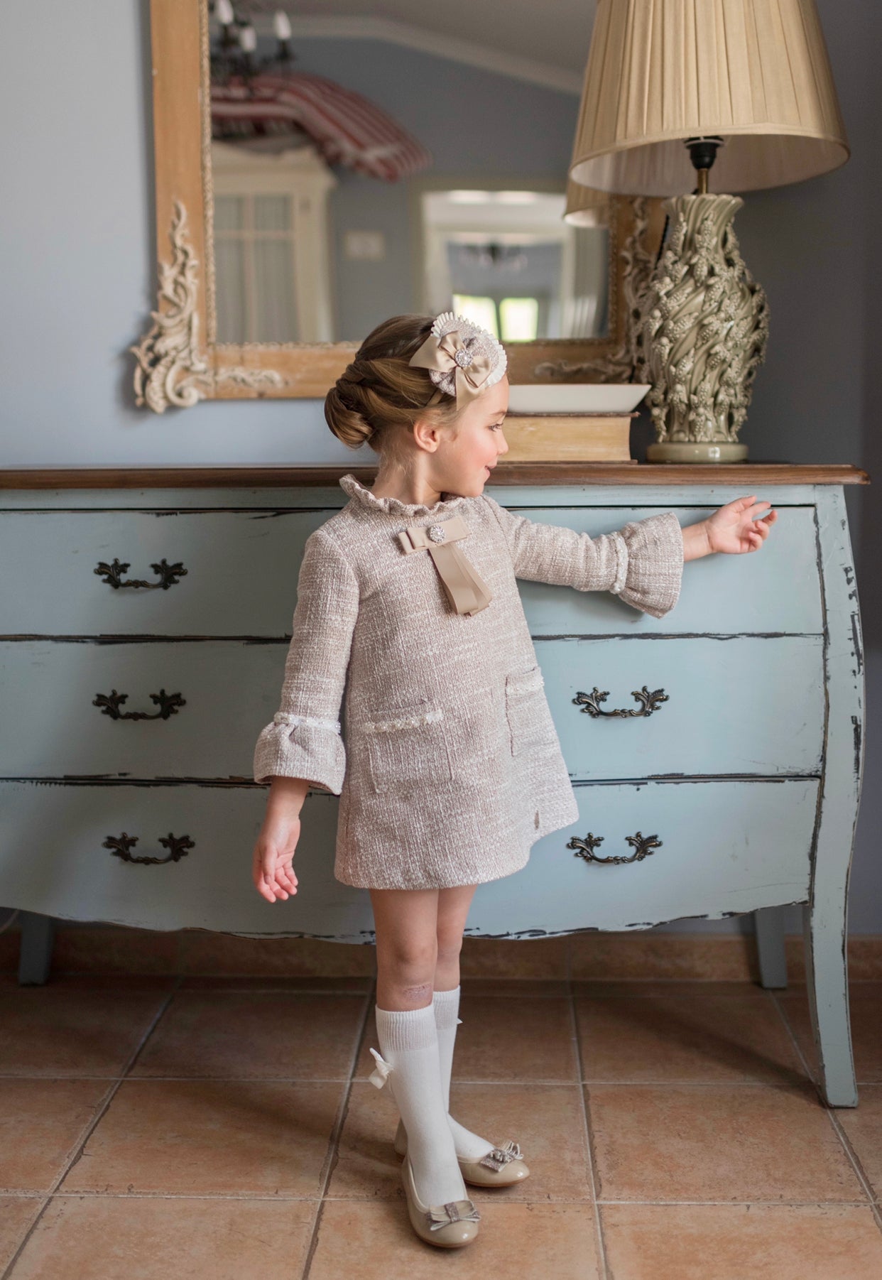 MI LOVES Beige Tweed A Line Dress with Pearl details.