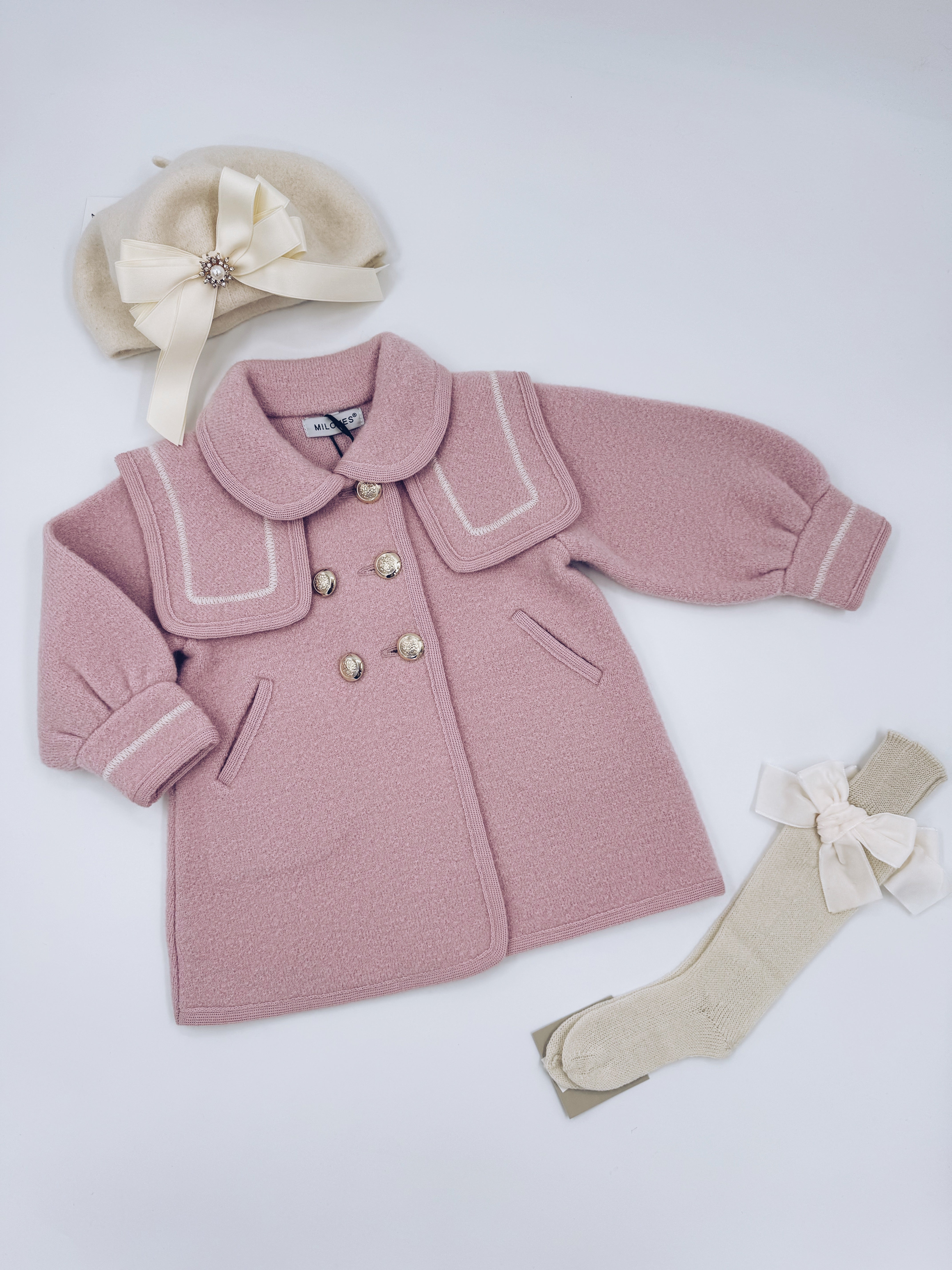 Beautiful pink merino wool coat with Cream stitching details