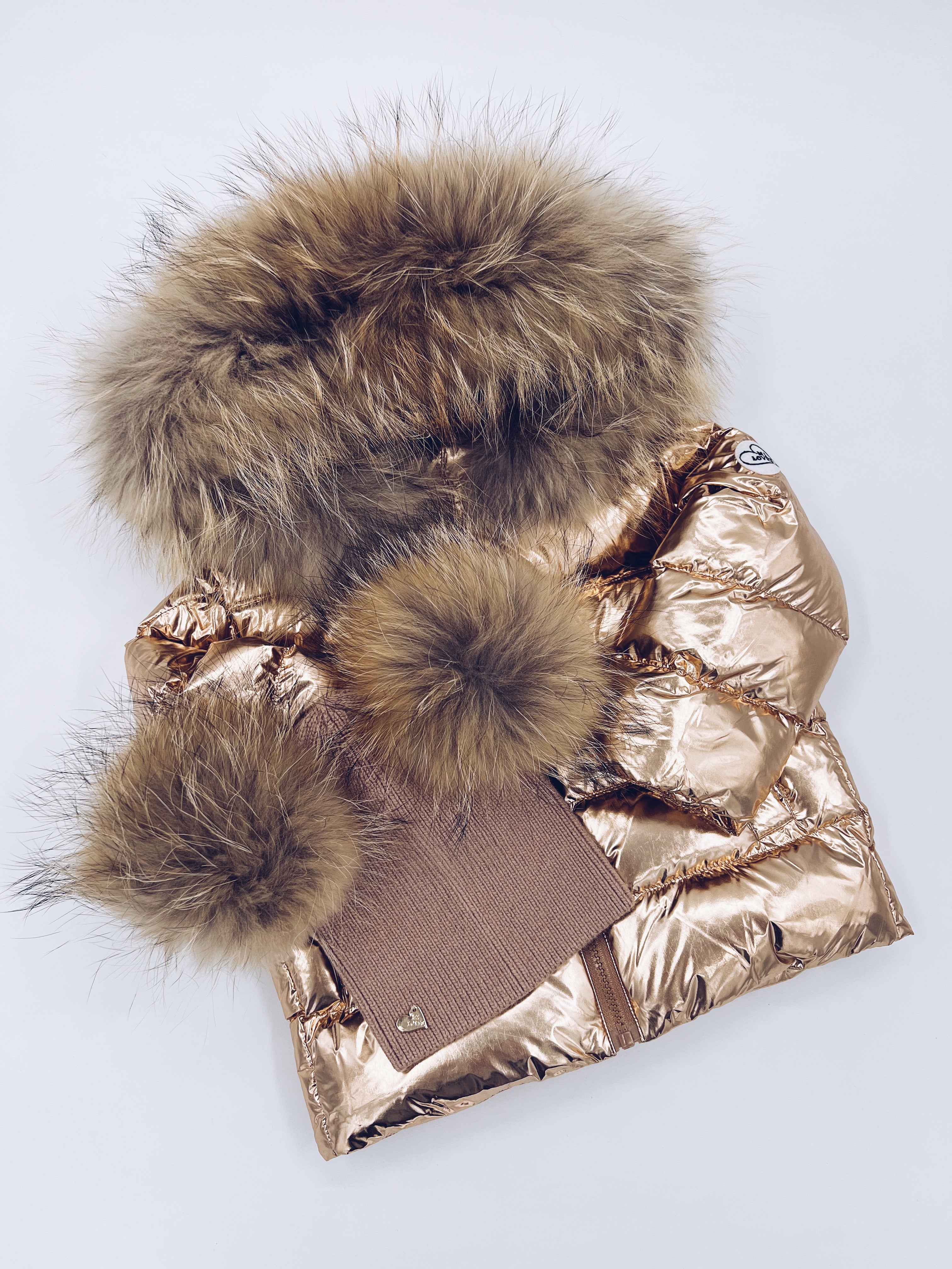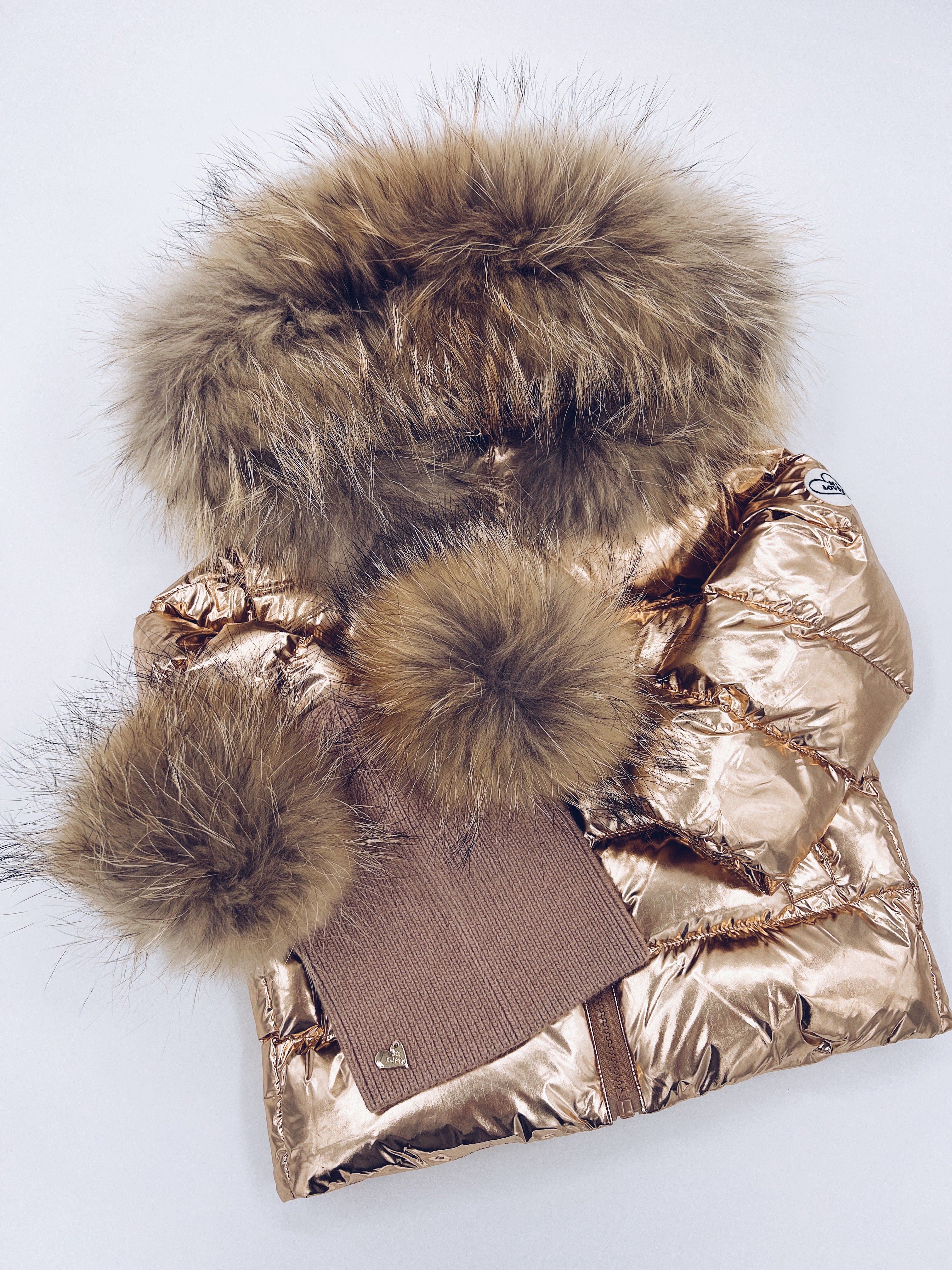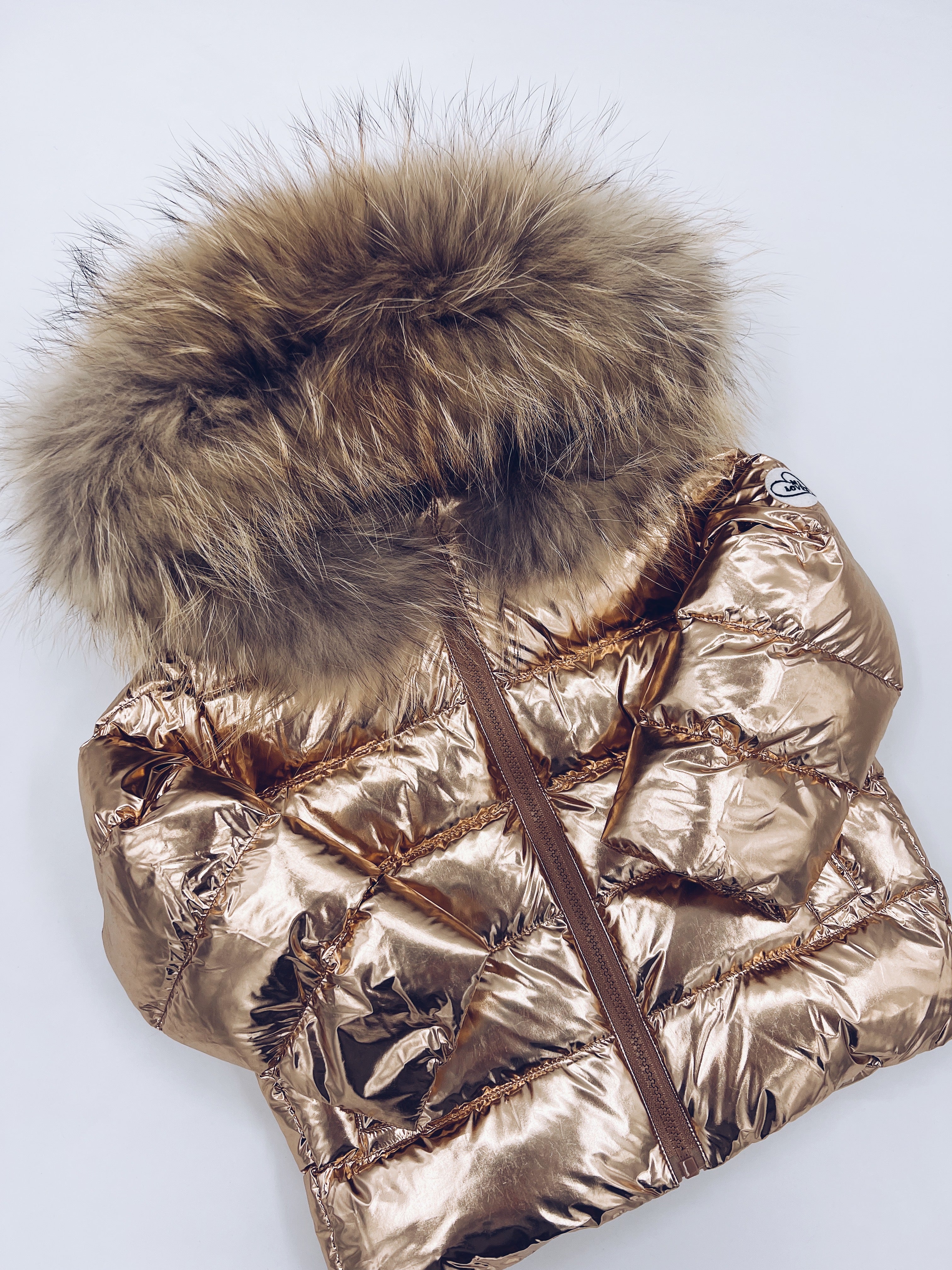 KIDS MI LOVES SIGNATURE Luxurious Racoon Fur Trim puff jacket in Gold colour .Beautiful ,warm with Detachable luxurious Racoon fur trim .