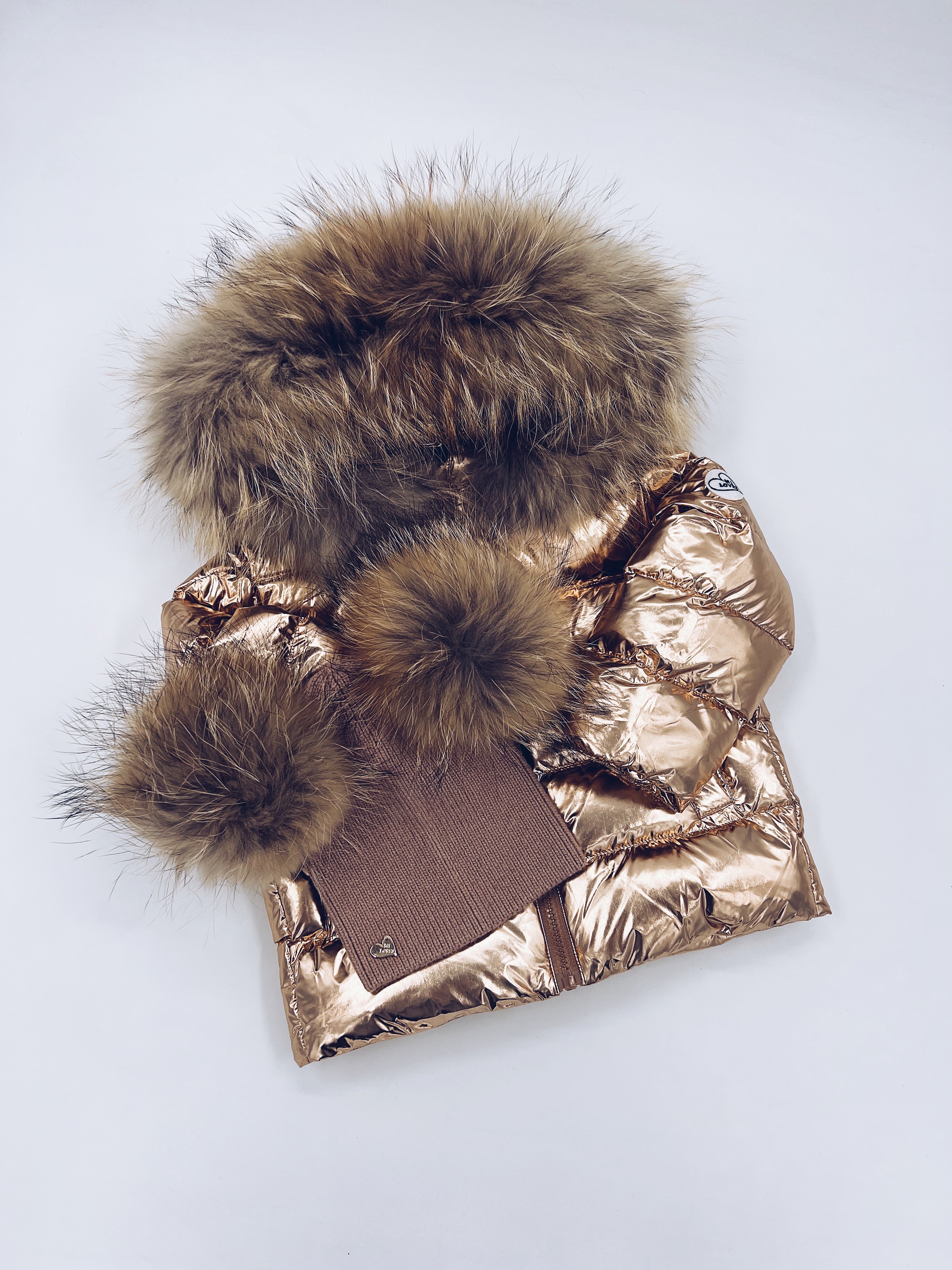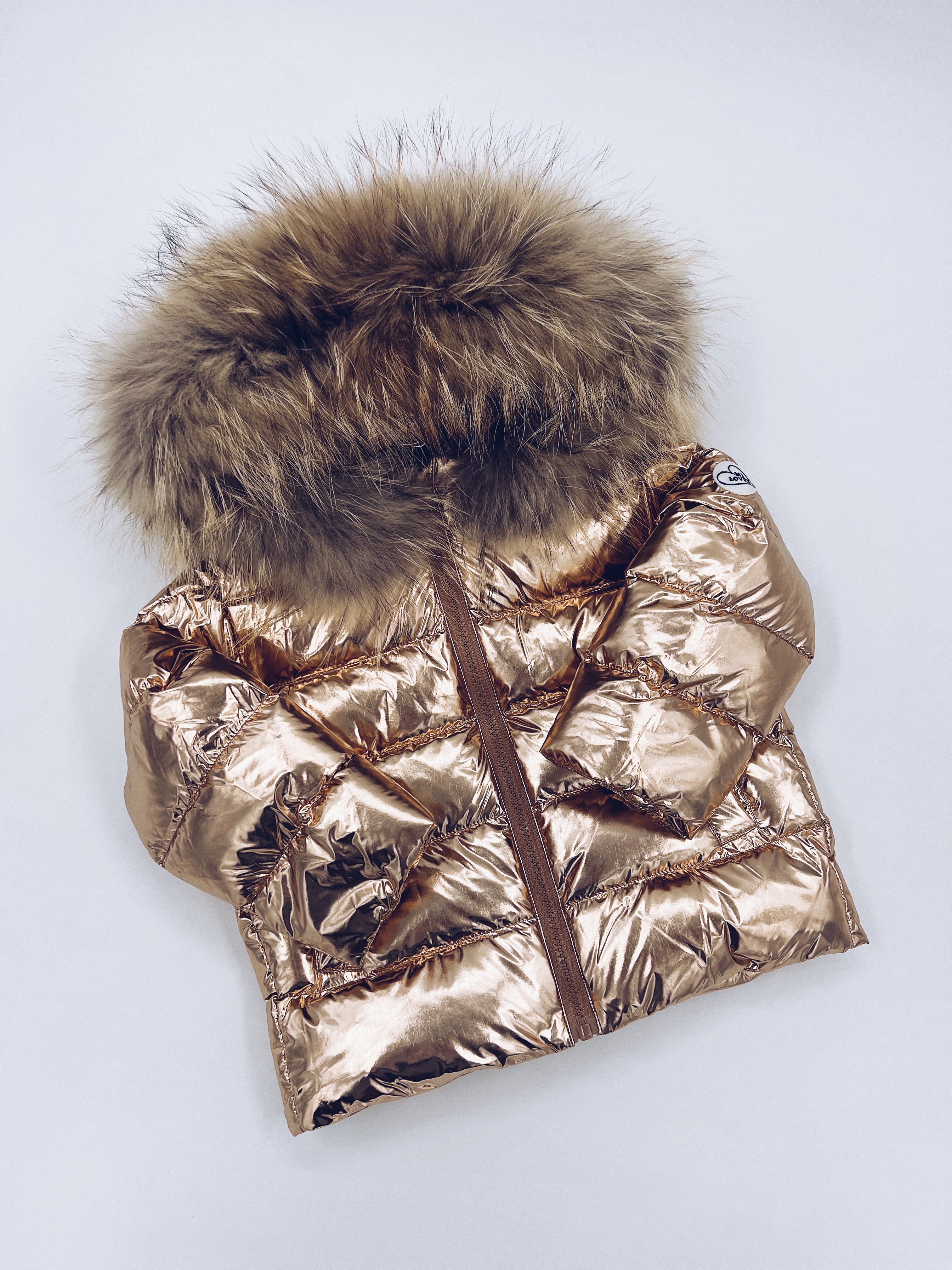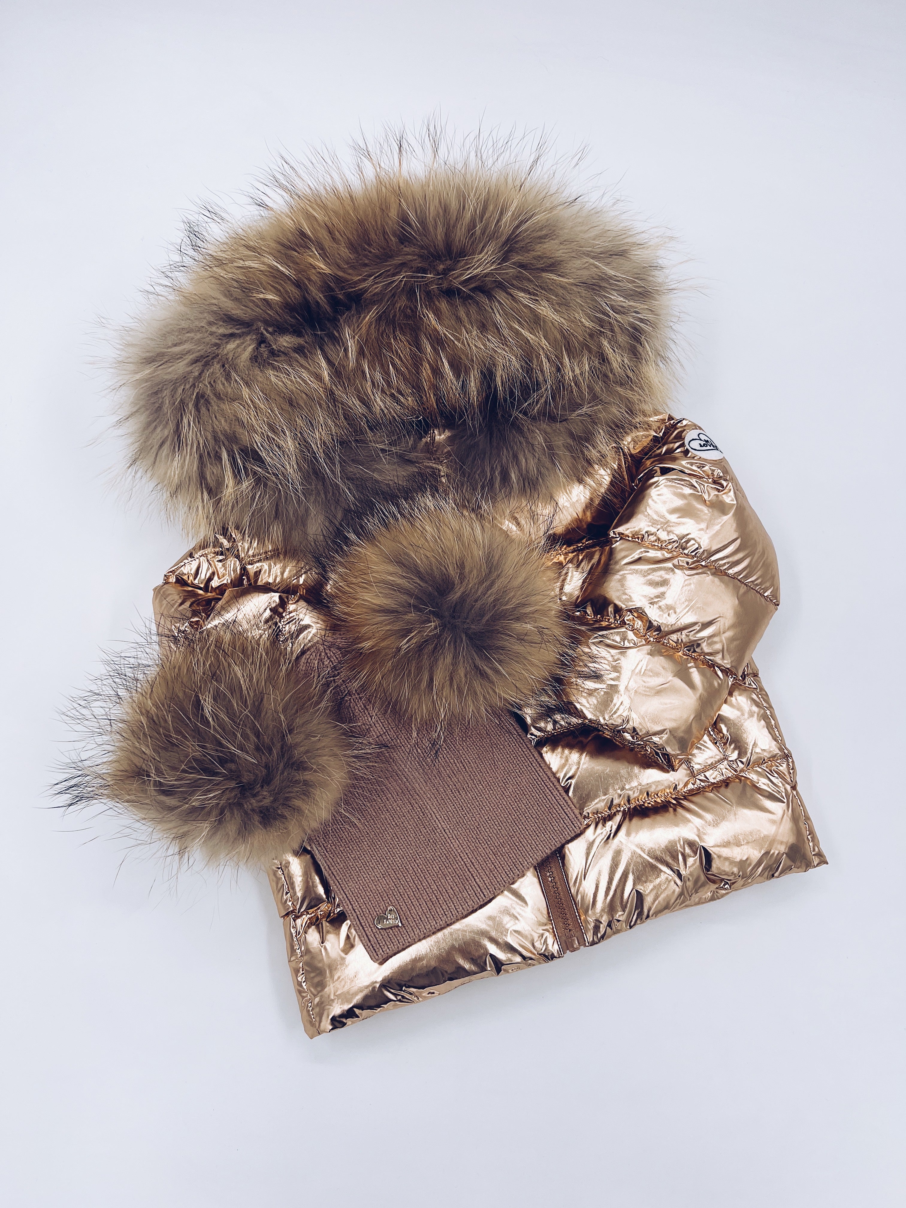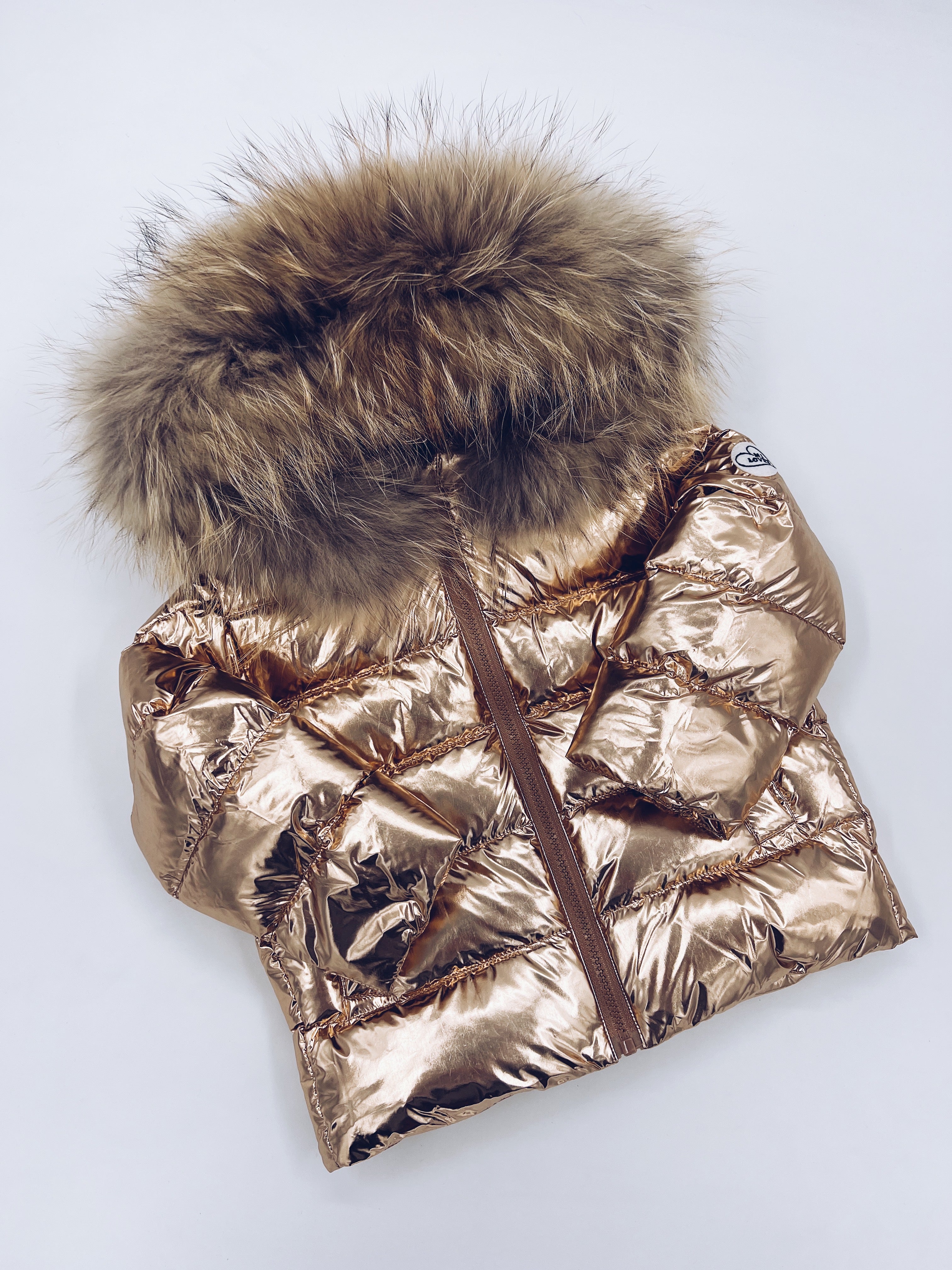 KIDS MI LOVES SIGNATURE Luxurious Racoon Fur Trim puff jacket in Gold colour .Beautiful ,warm with Detachable luxurious Racoon fur trim .