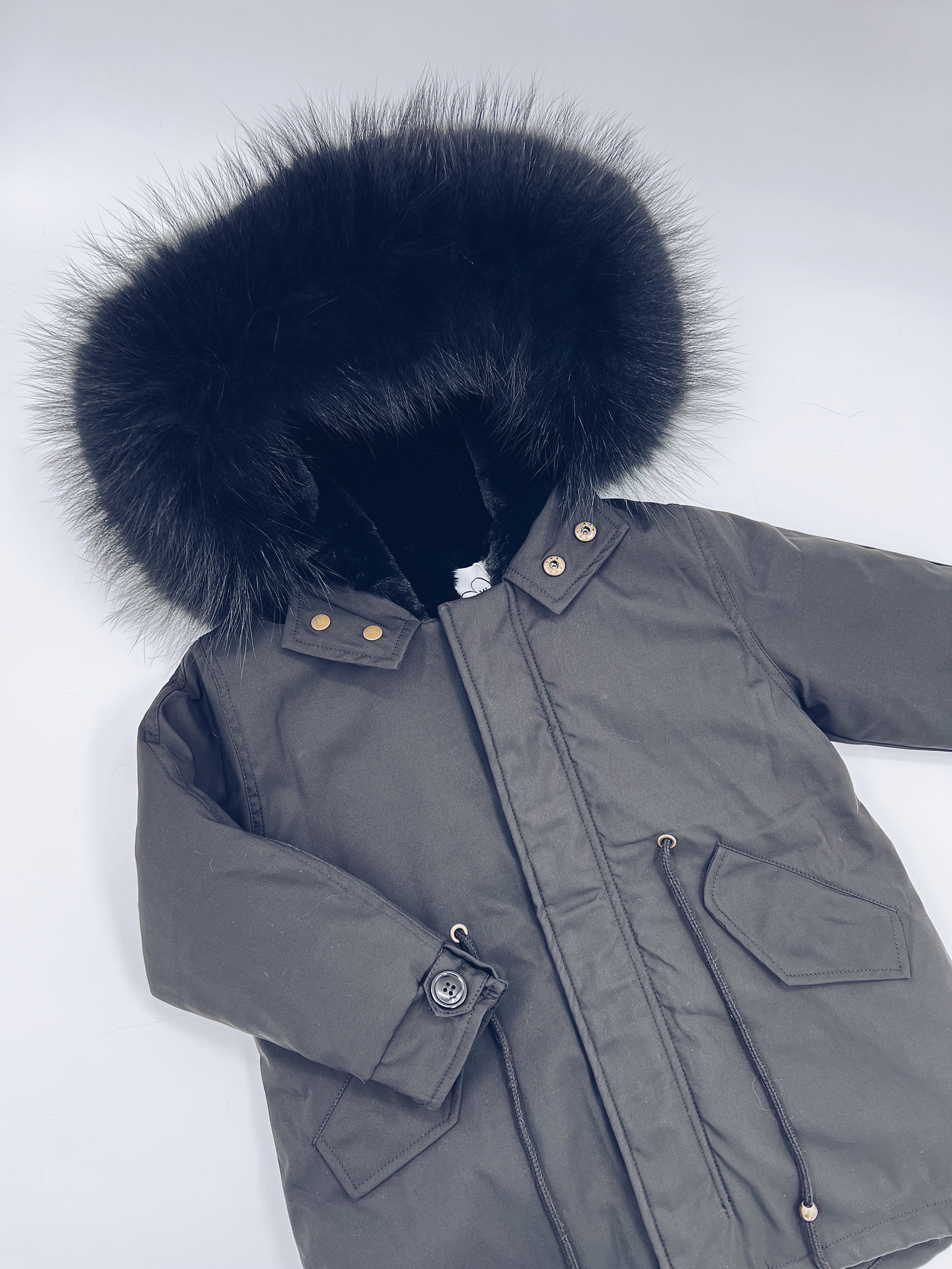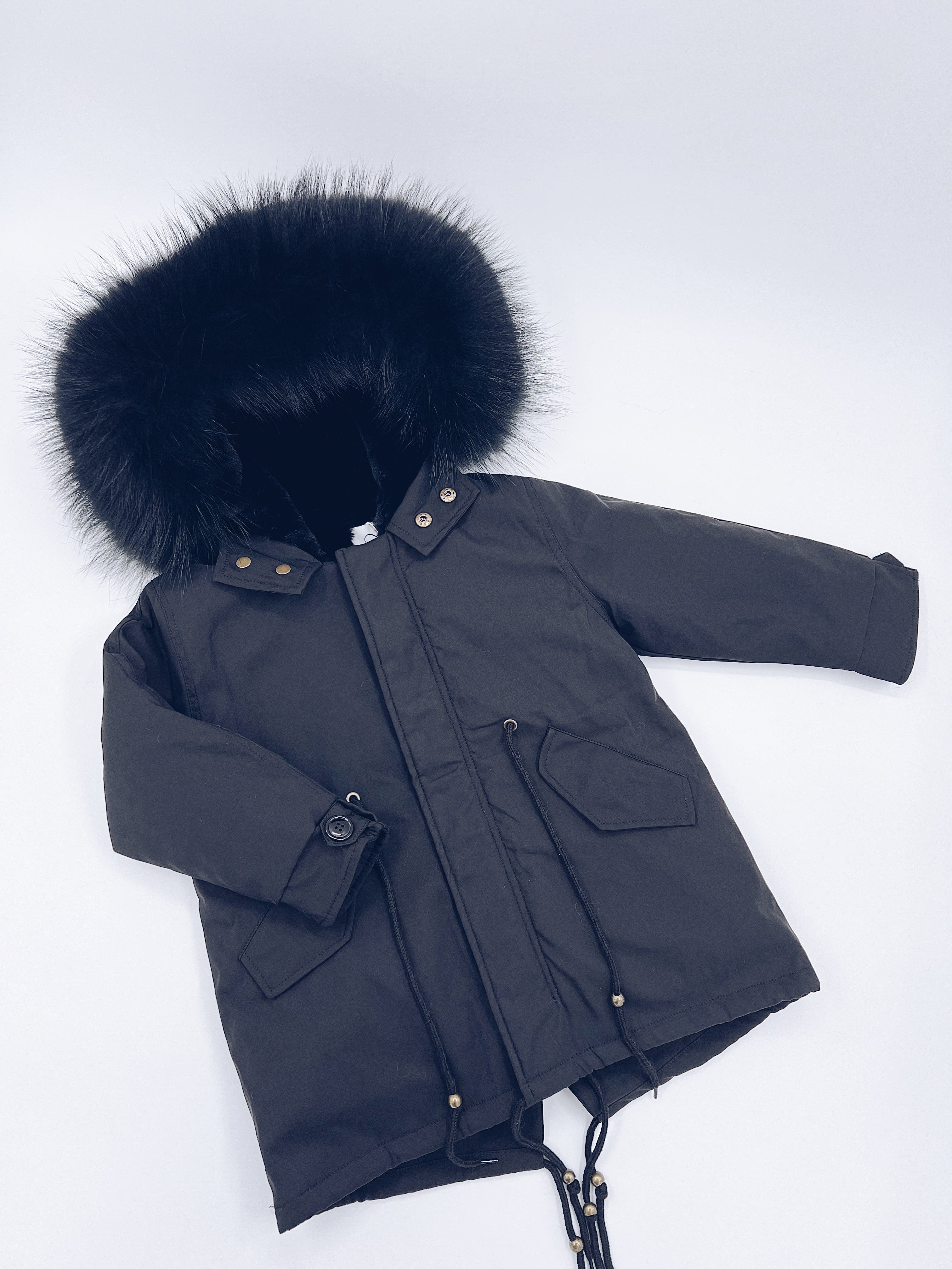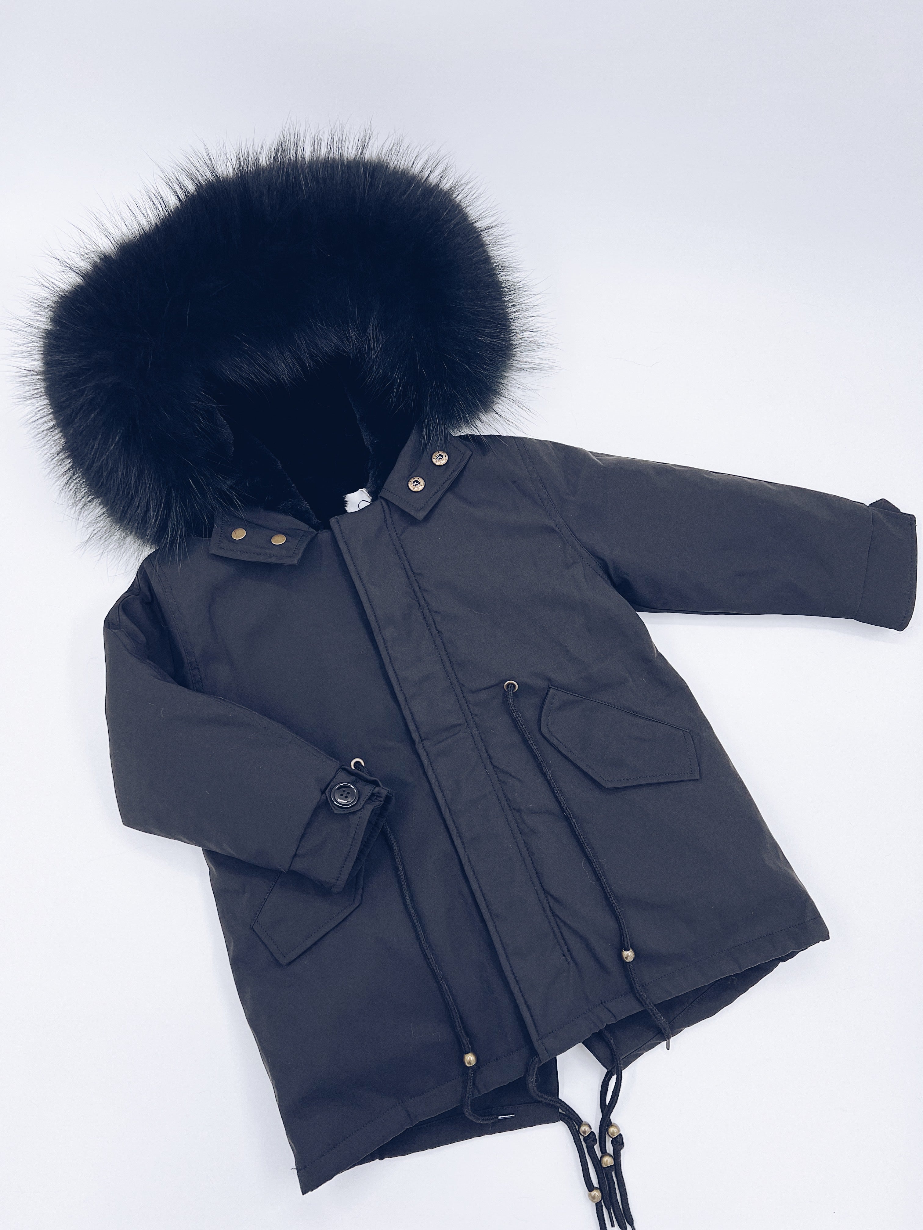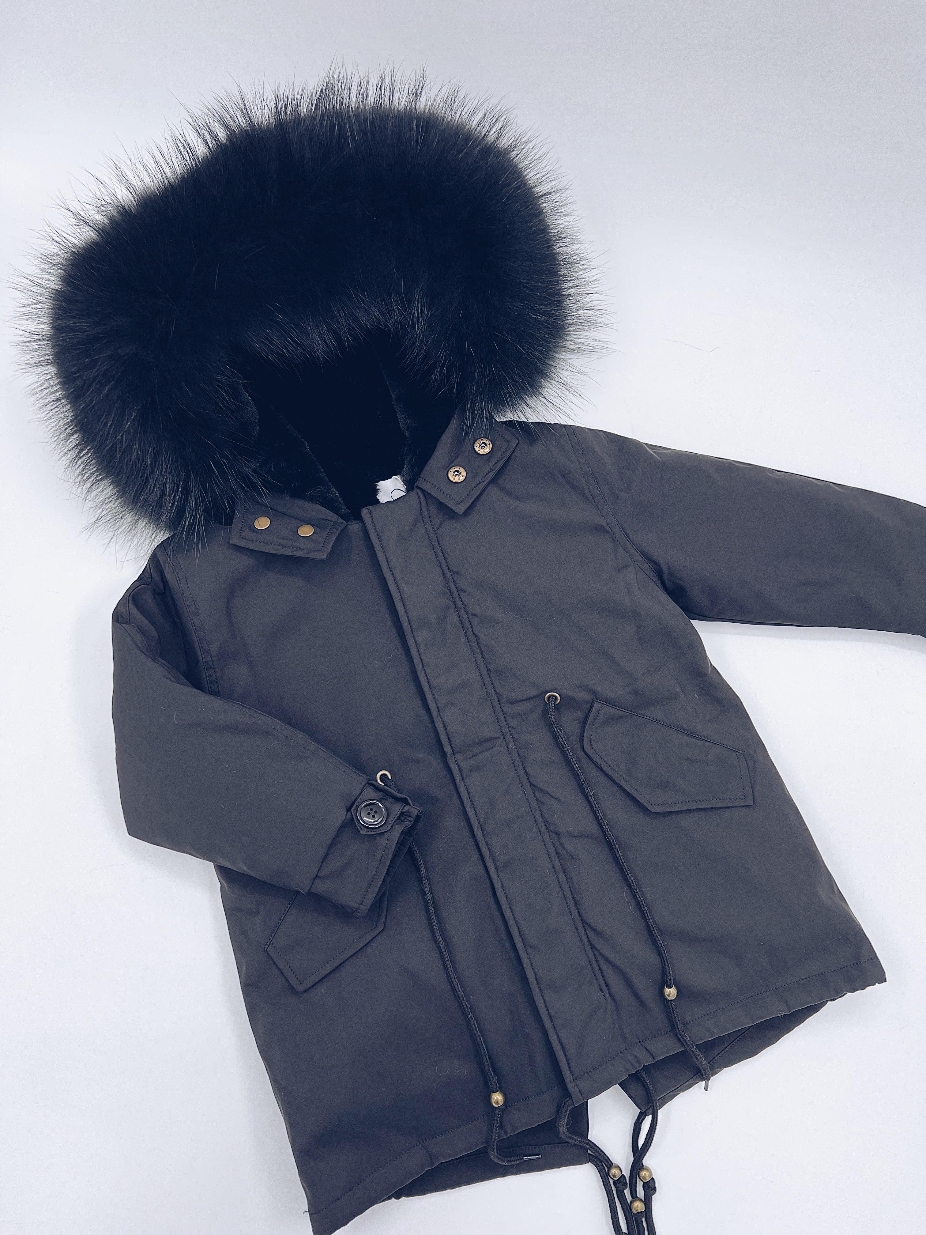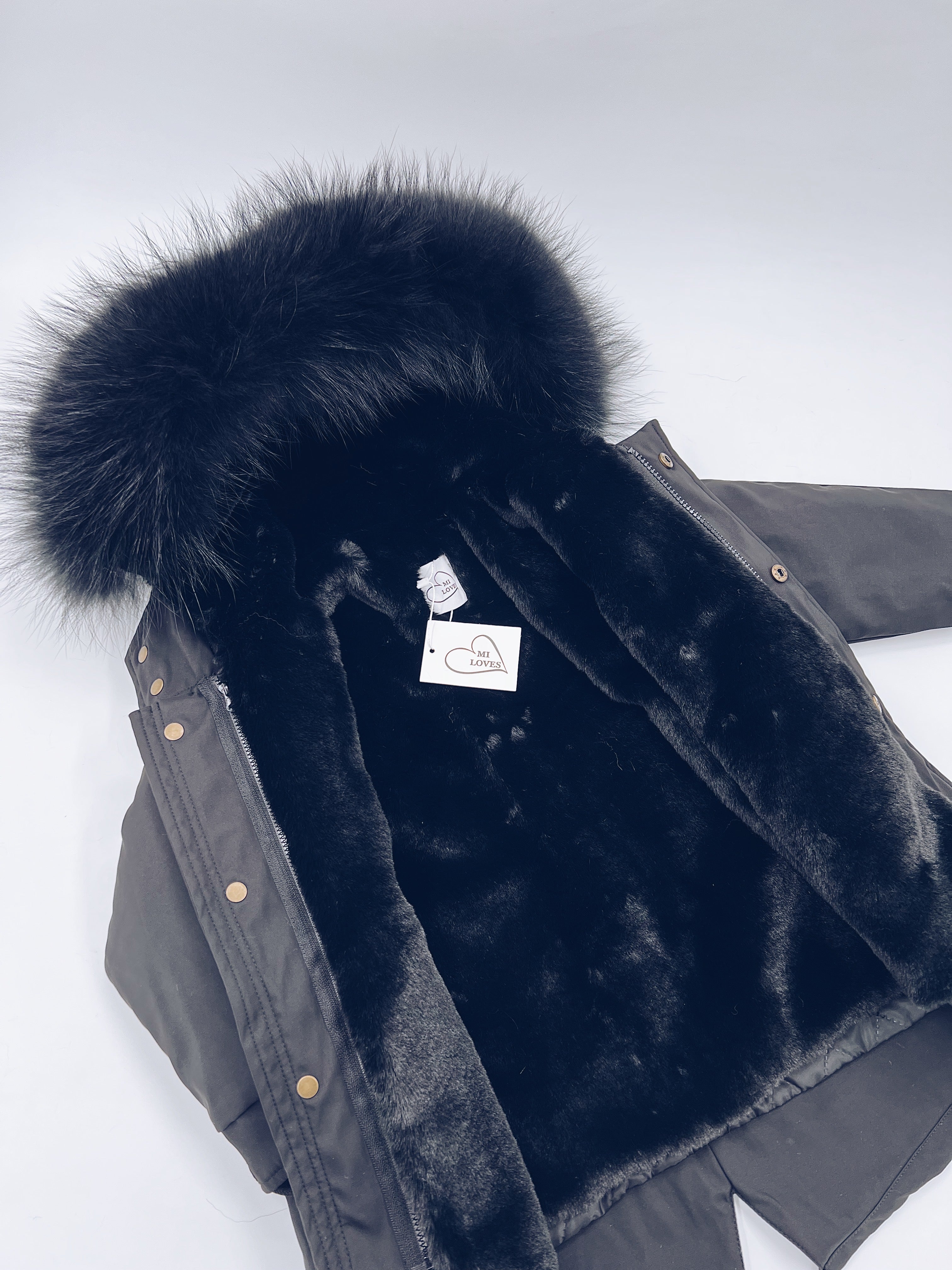 MI LOVES SIGNATURE Black parka jacket with Luxurious Black Racoon Fur trim and Synthetic fur lining though out the whole body for extra warmth! Beautiful Luxury Fur trim and lining can be detached if weather get warmer!!