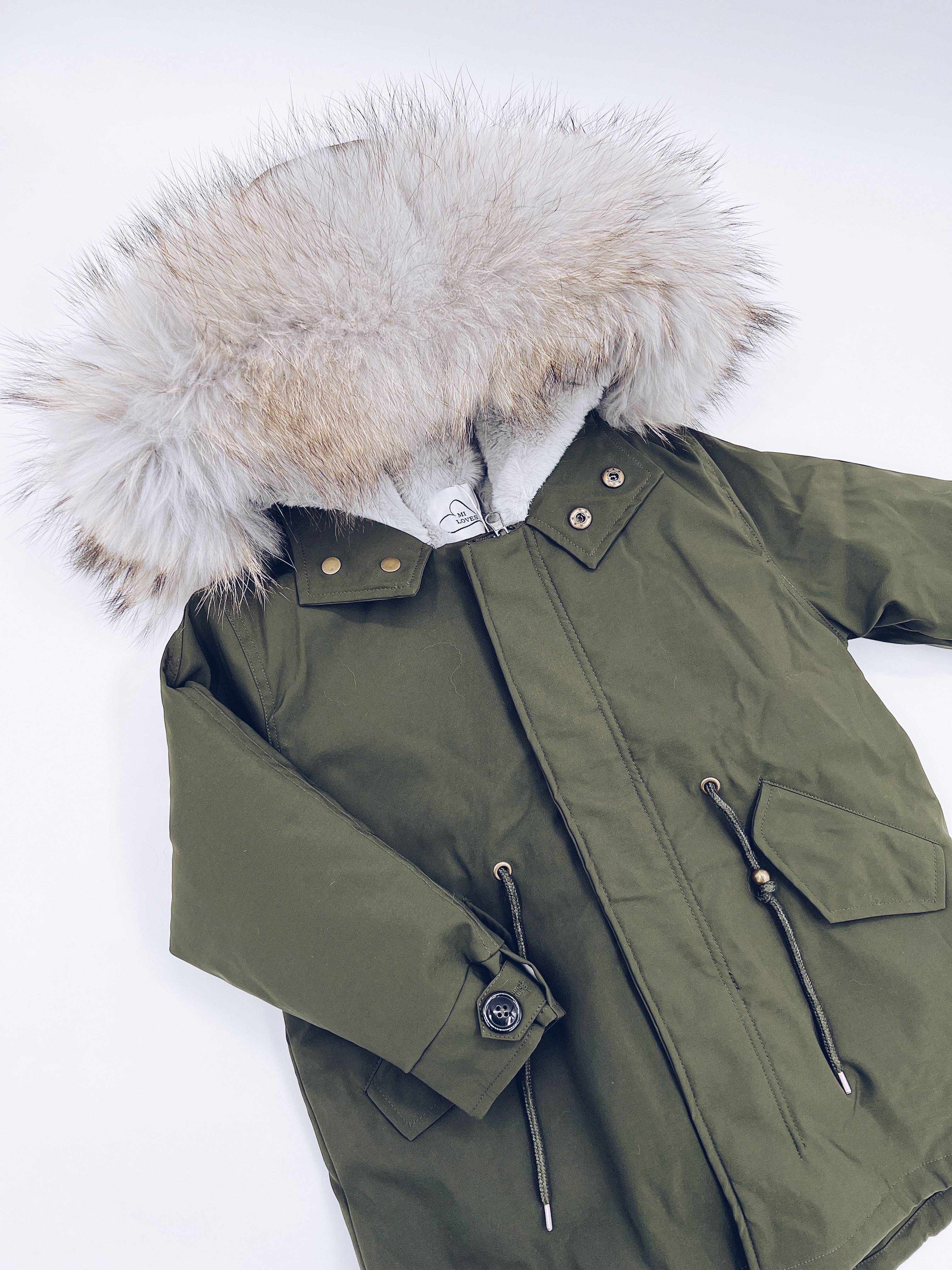 MI LOVES SIGNATURE Khaki Green parka jacket with Luxurious Grey Racoon Fur trim and Synthetic fur lining though out the whole body for extra warmth!Beautiful Luxury Fur trim and lining can be detached if weather get warmer!!