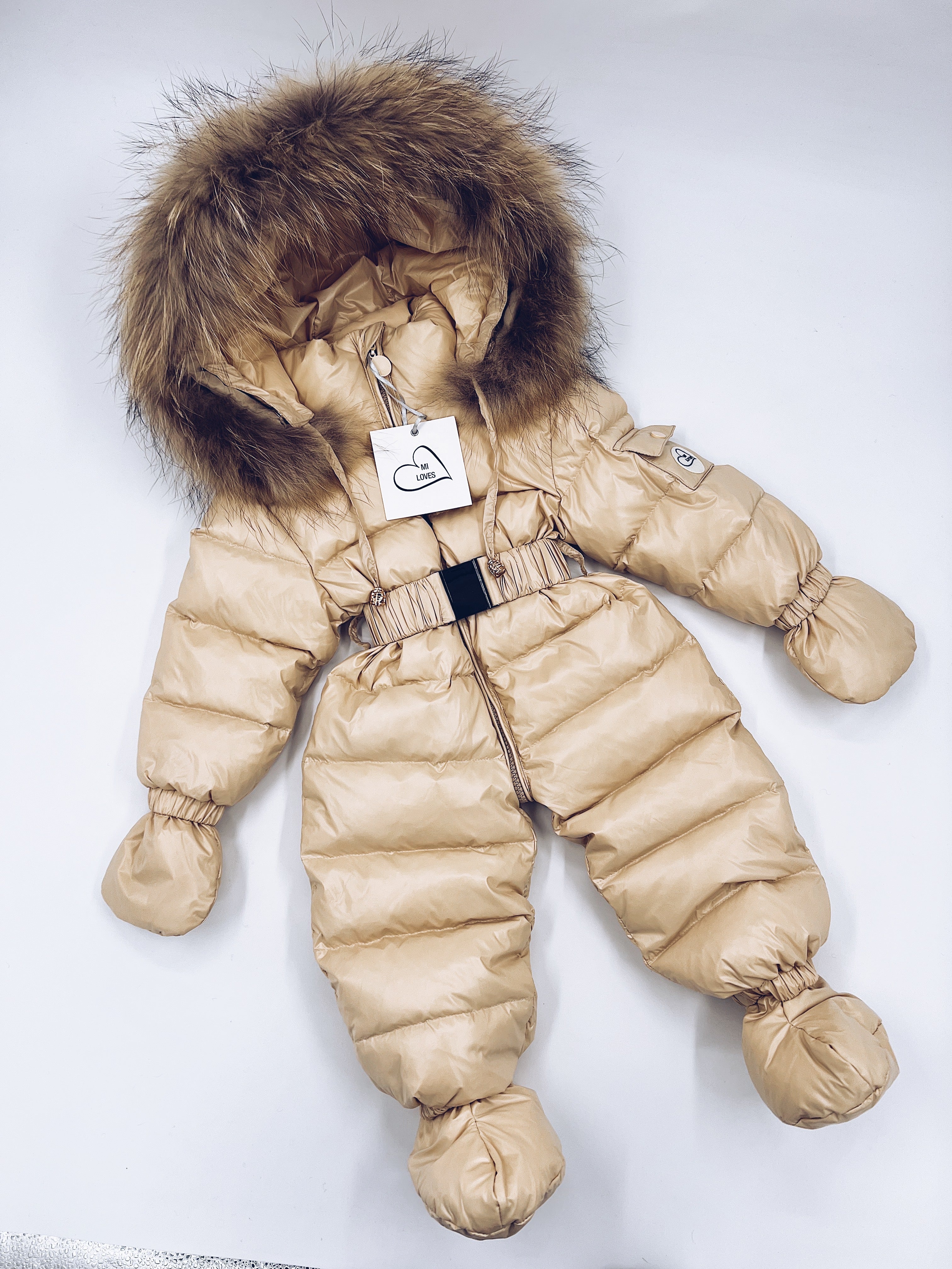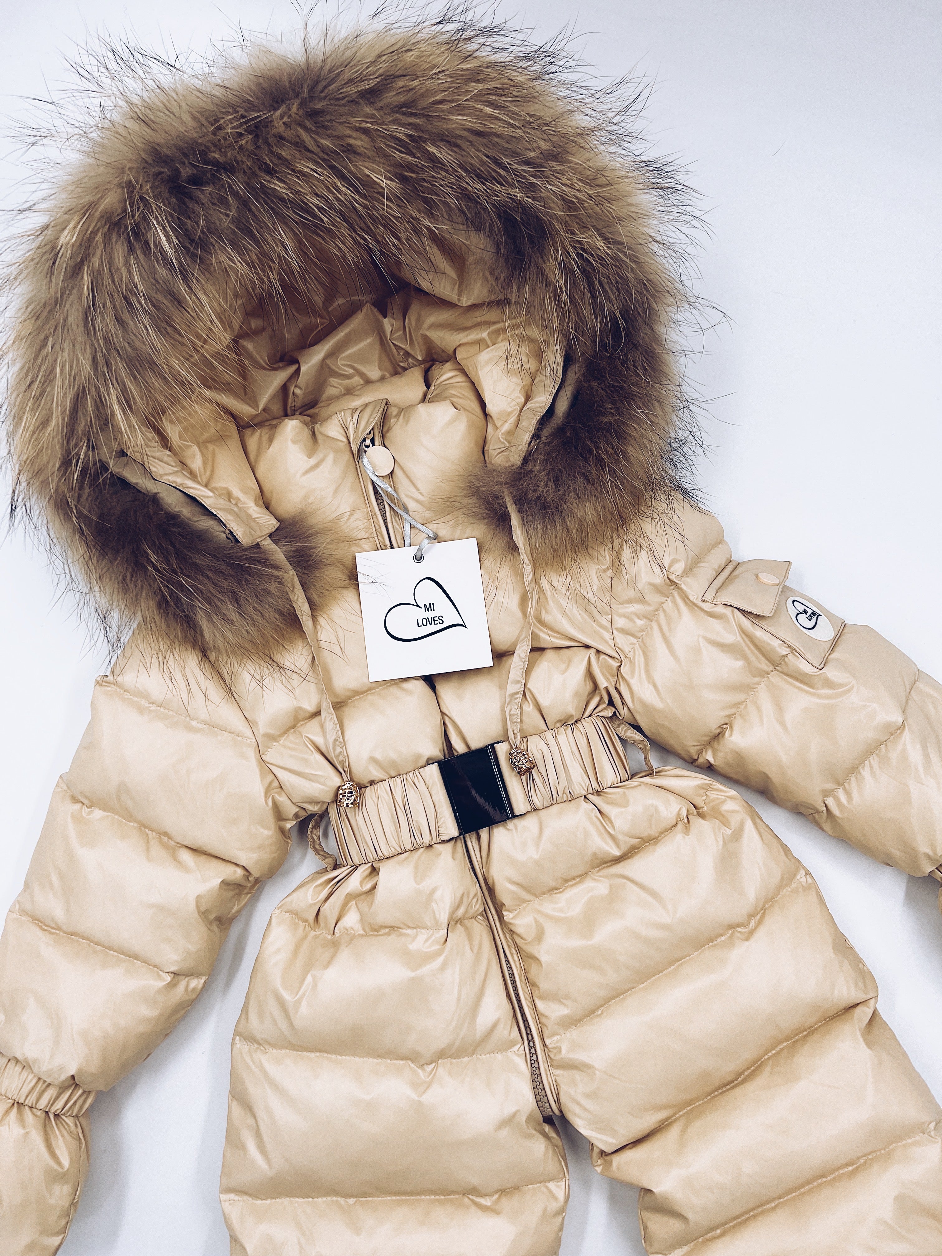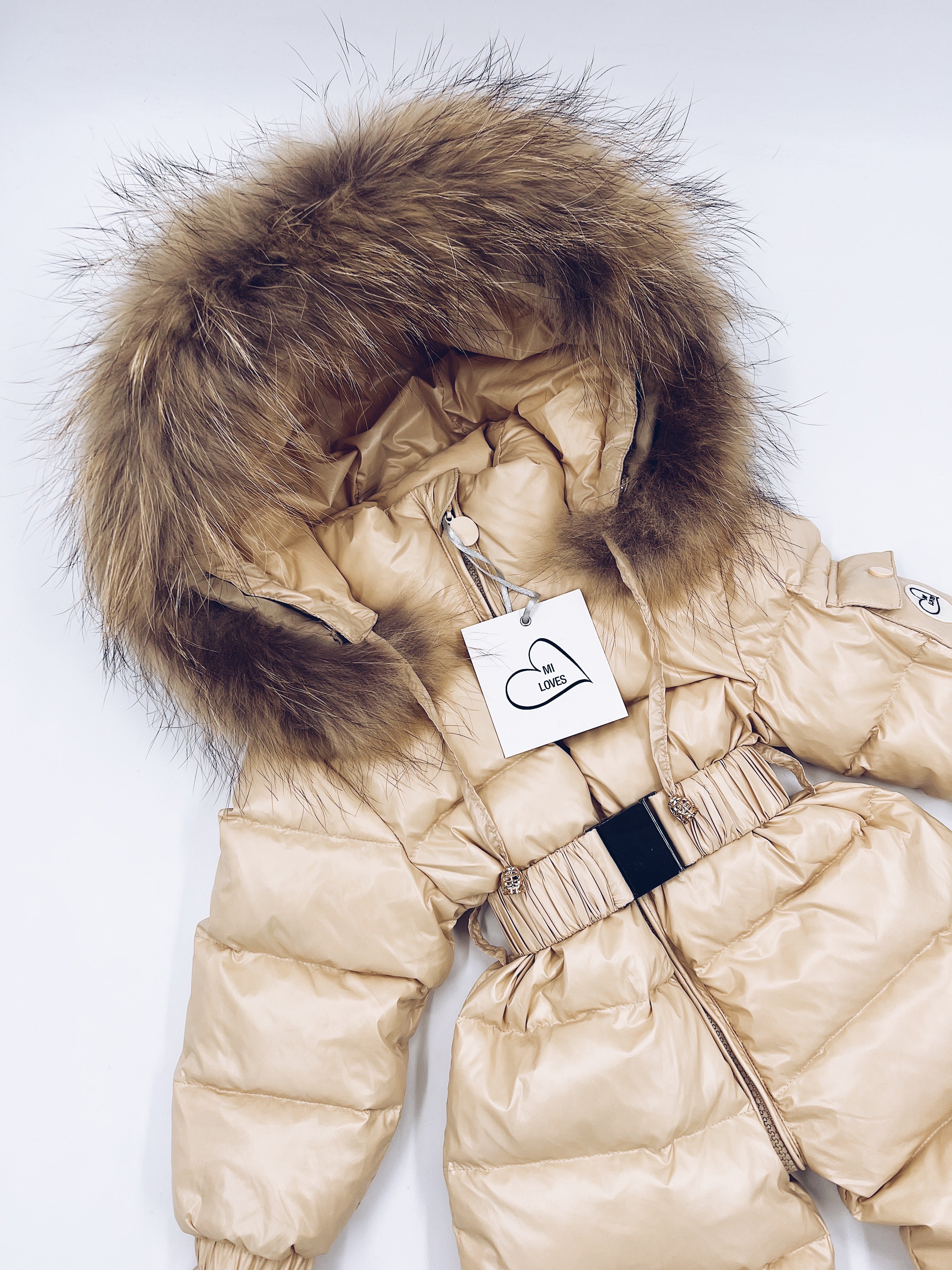 MI LOVES SIGNATURE LUXURIOUS RACOON FUR TRIM SNOWSUIT in Cream/Light Beige.
