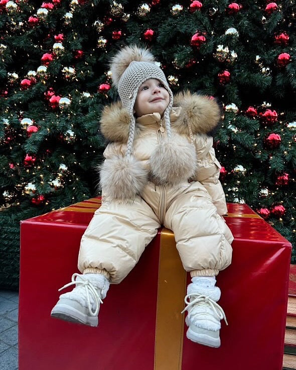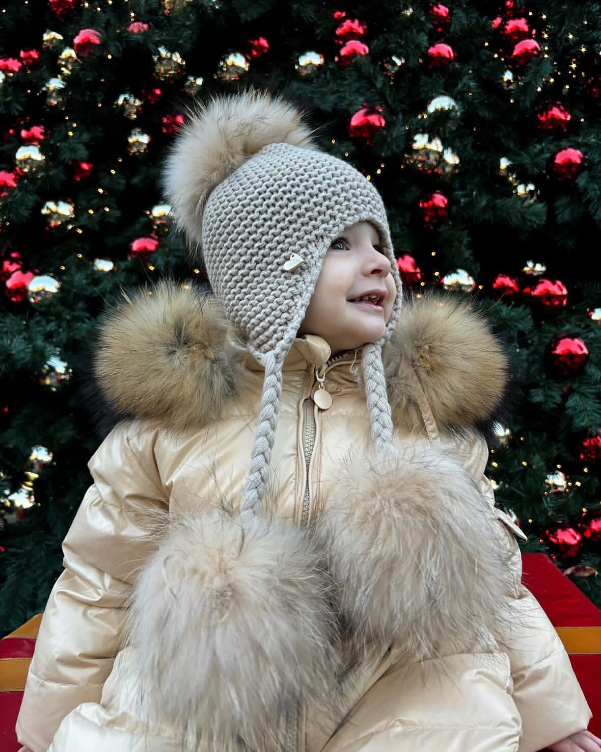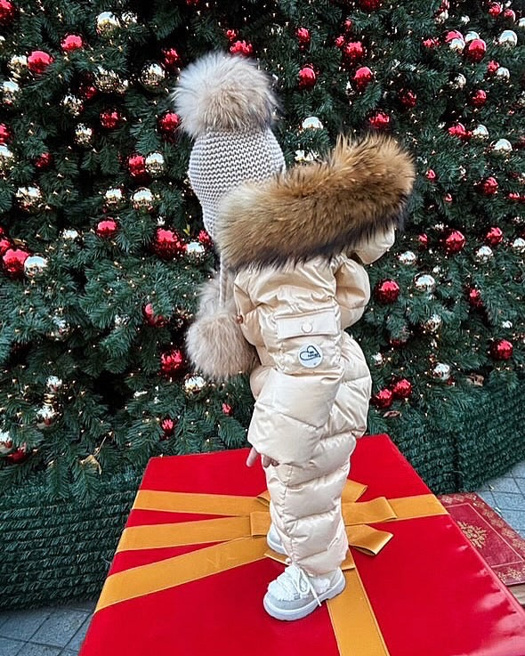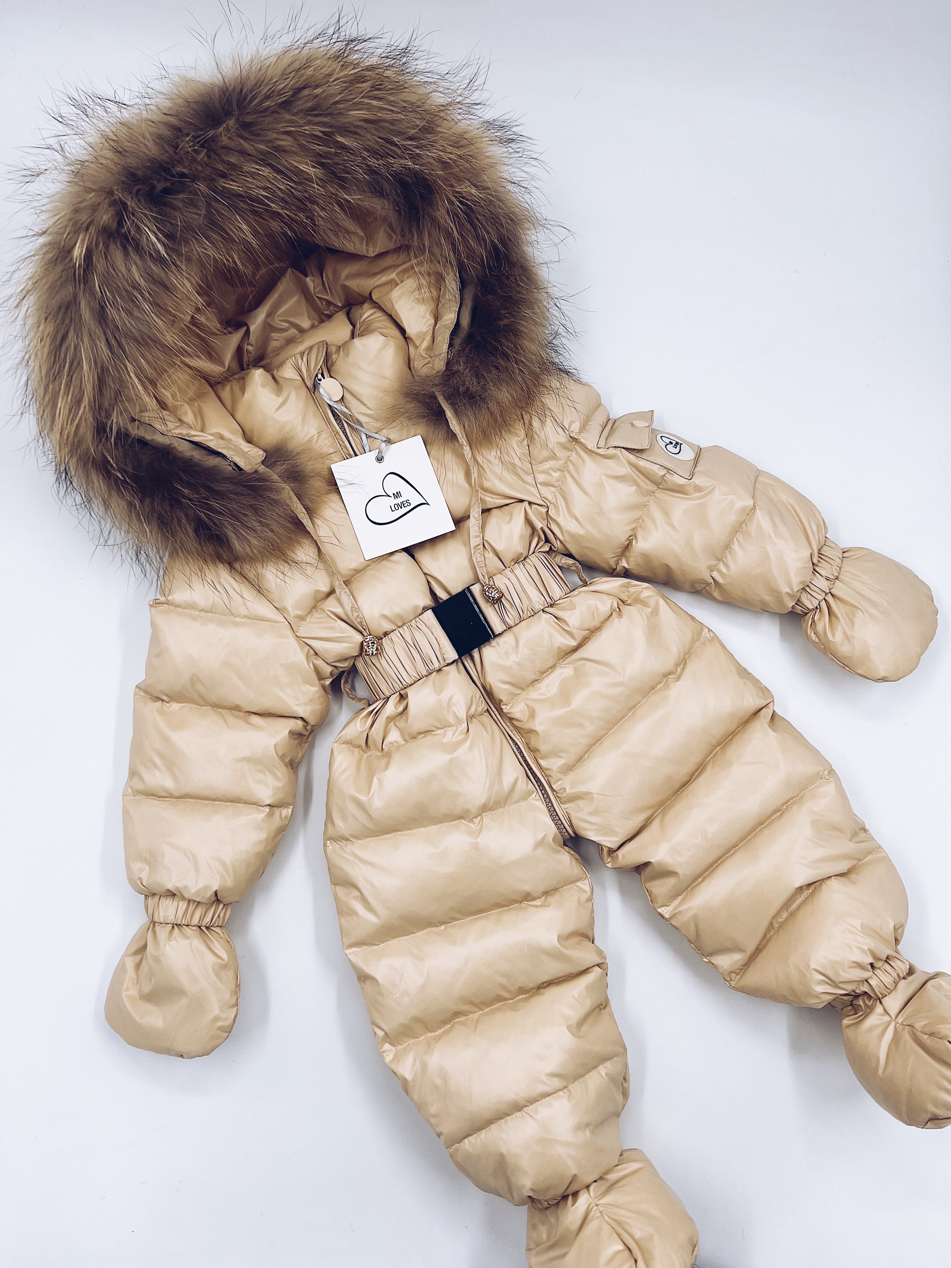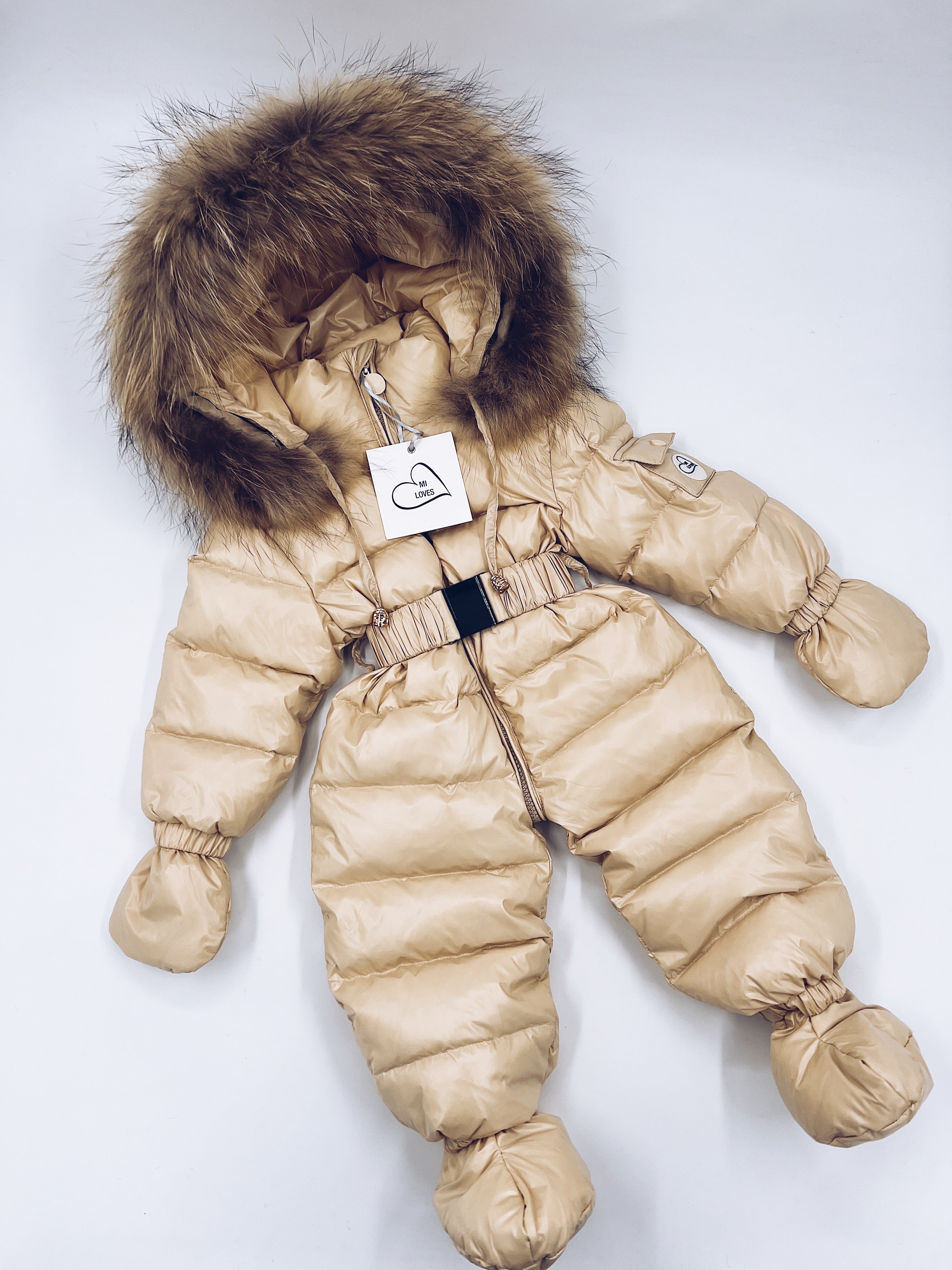 MI LOVES SIGNATURE LUXURIOUS RACOON FUR TRIM SNOWSUIT in Cream/Light Beige.